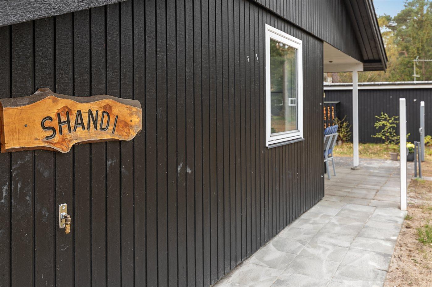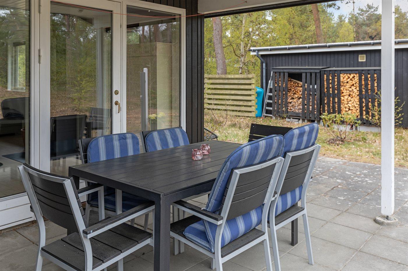 Ferieboligen er beliggende på en 1500 m² stor naturgrund. Der er 150 m til havet. Nærmeste forretning er beliggende i en afstand af 900 m. Der er en golfbane i en afstand af 7000 m. Til ferieboligen hører 95 m² terrasseareal. Desuden er der 14 m² overdækket terrasse. Der er redskabsrum. Afskærmet udendørs bruser. Der er installeret stik til opladning af elbil. CEE stik samt omformer til type 2 stik. Med 11 kW ladeeffekt. Parkering ved ferieboligen.