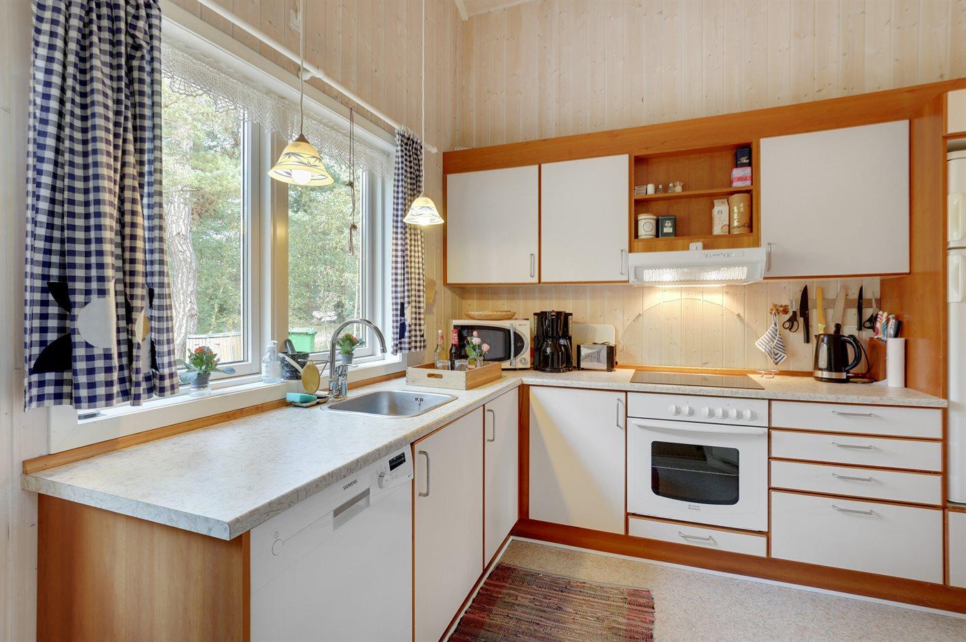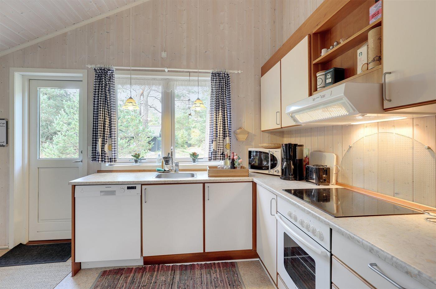 Køkkenet er udstyret med 1 køleskab. Der er 4 keramiske kogeplader, varmluftovn, mikrobølgeovn samt opvaskemaskine.