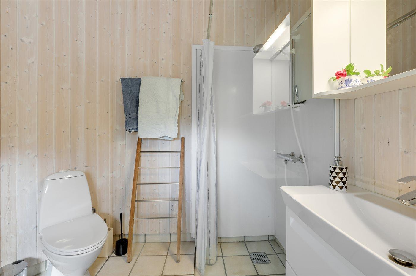 Husets badeværelse er renoveret i 2022, så det fremstår lyst og indbydende.