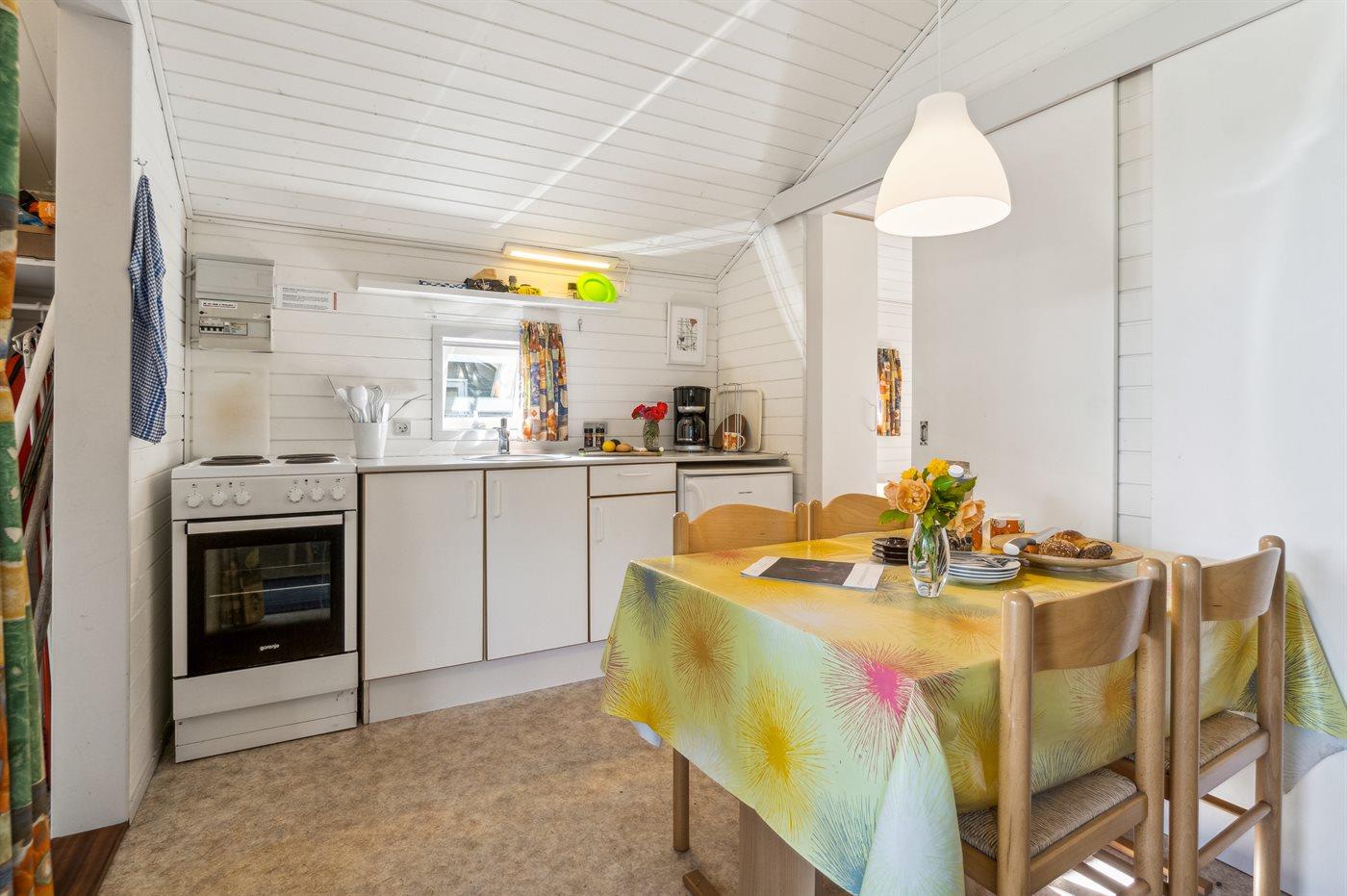 Køkkenet er udstyret med 1 køleskab. Der er 4 elkogeplader, varmluftovn.