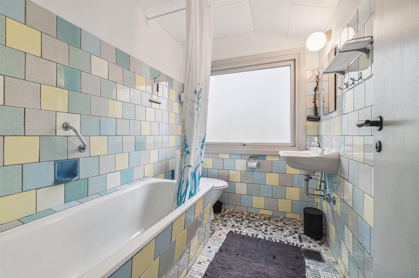 Der er 2 badeværelser med bruseniche og 2 toiletter. Der er gulvvarme på 1 badeværelse.. Badekar.