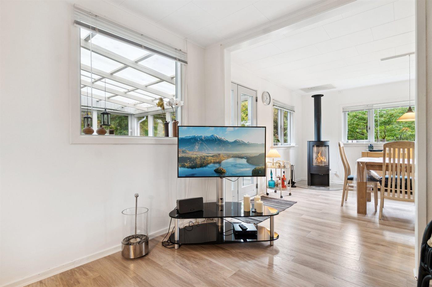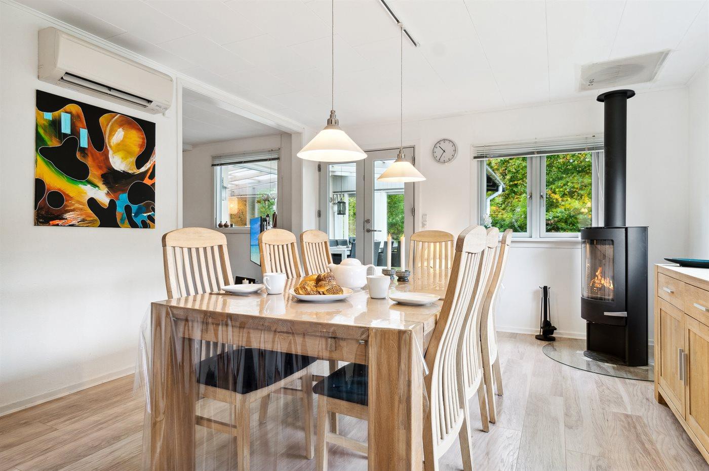 Hyggeligt sommerhus nær Balka strand med stor udestue, brændeovn og moderne køkken for en afslappet ferie.