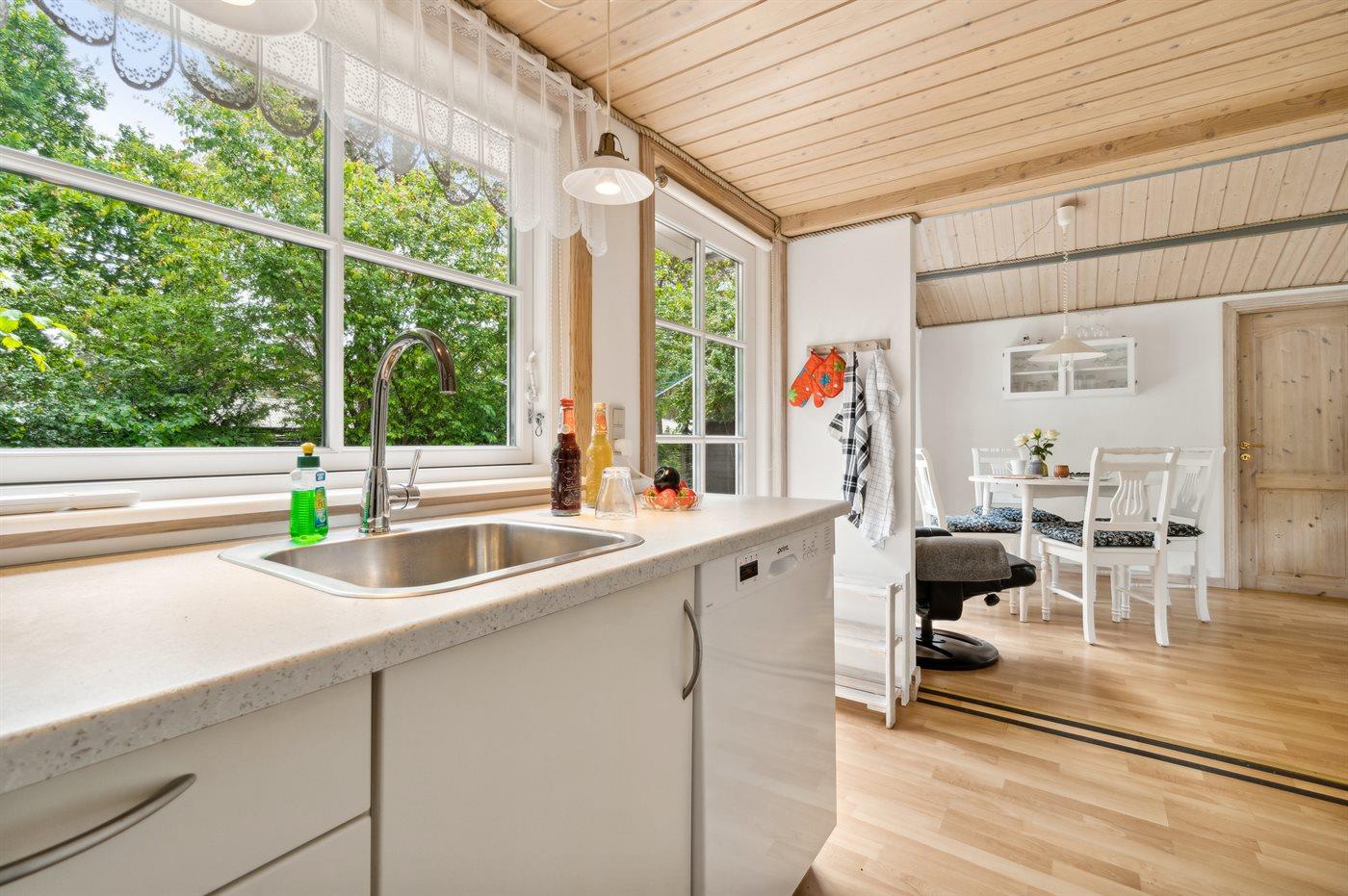 Køkkenet er udstyret med 1 køleskab. Der er 4 keramiske kogeplader, varmluftovn, mikrobølgeovn samt opvaskemaskine.