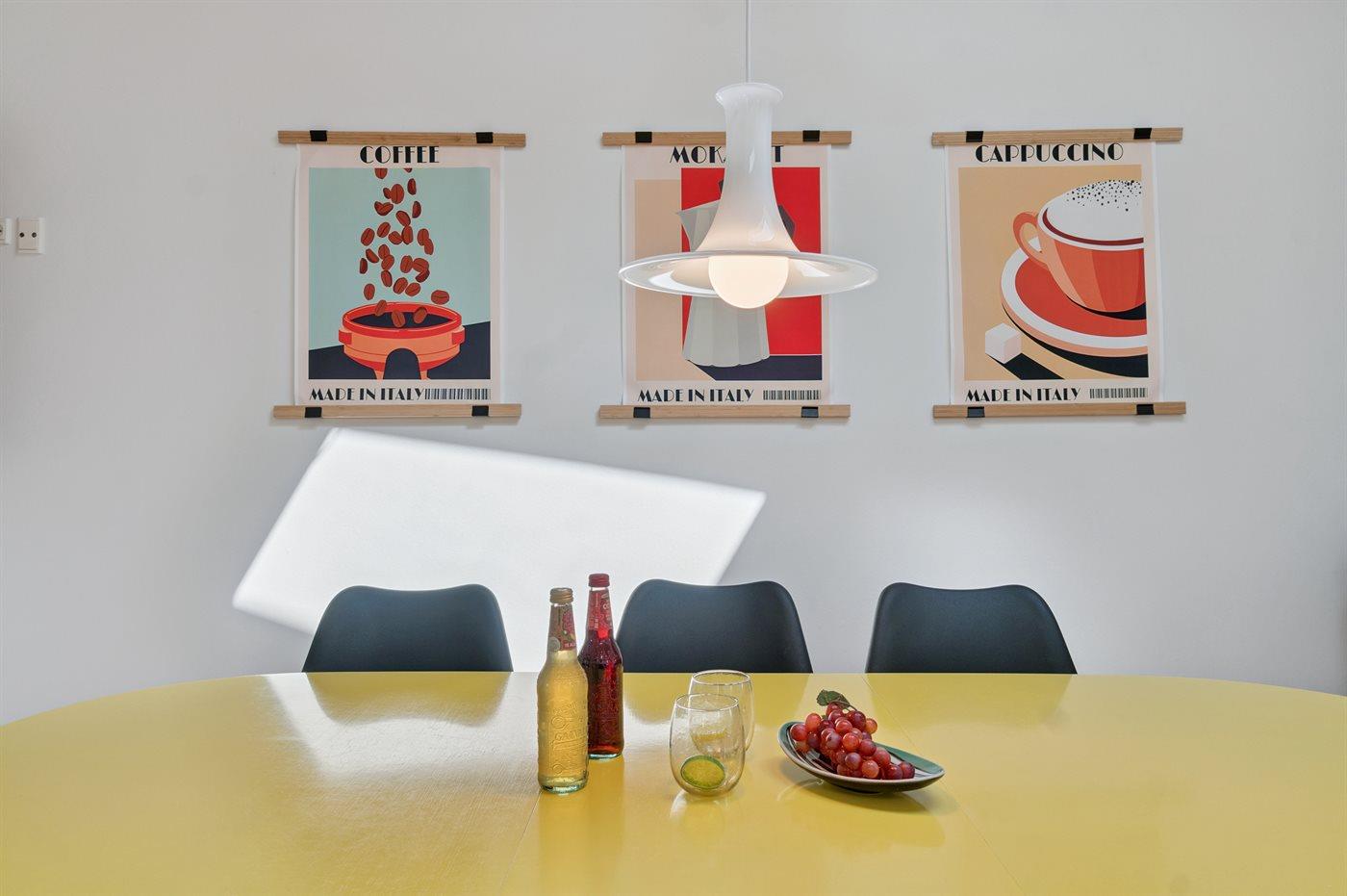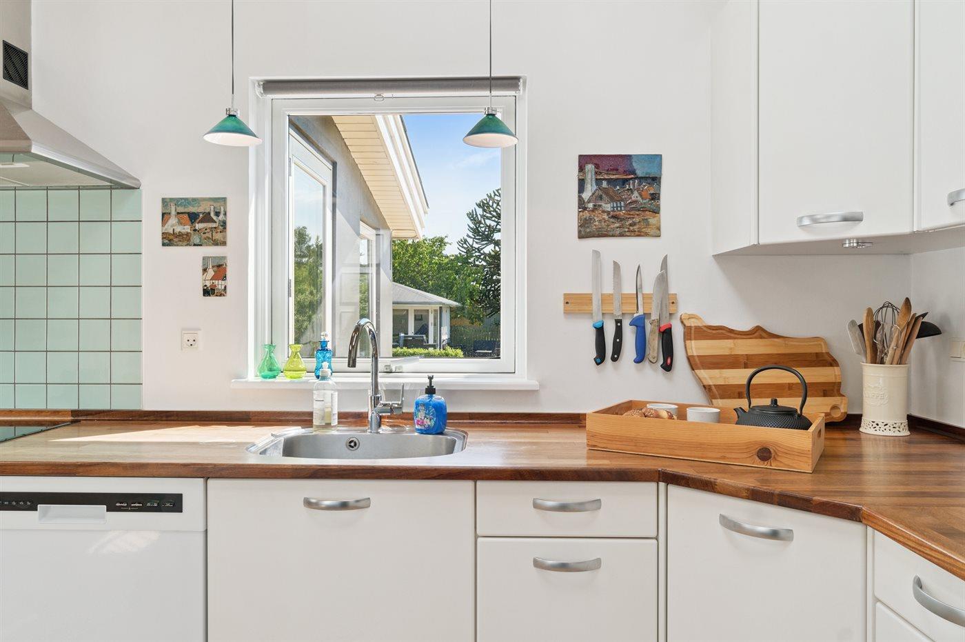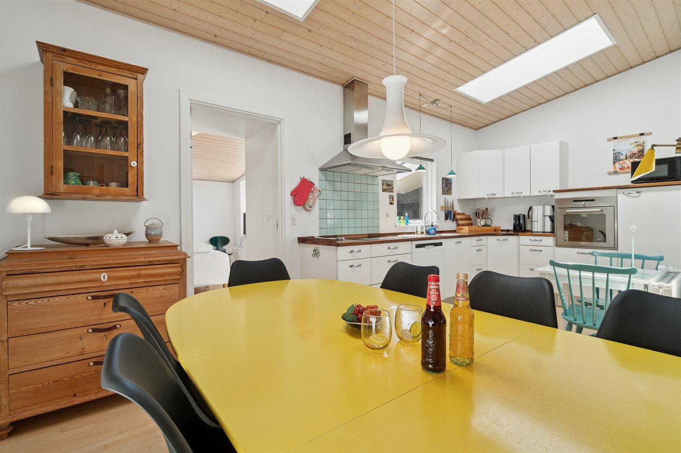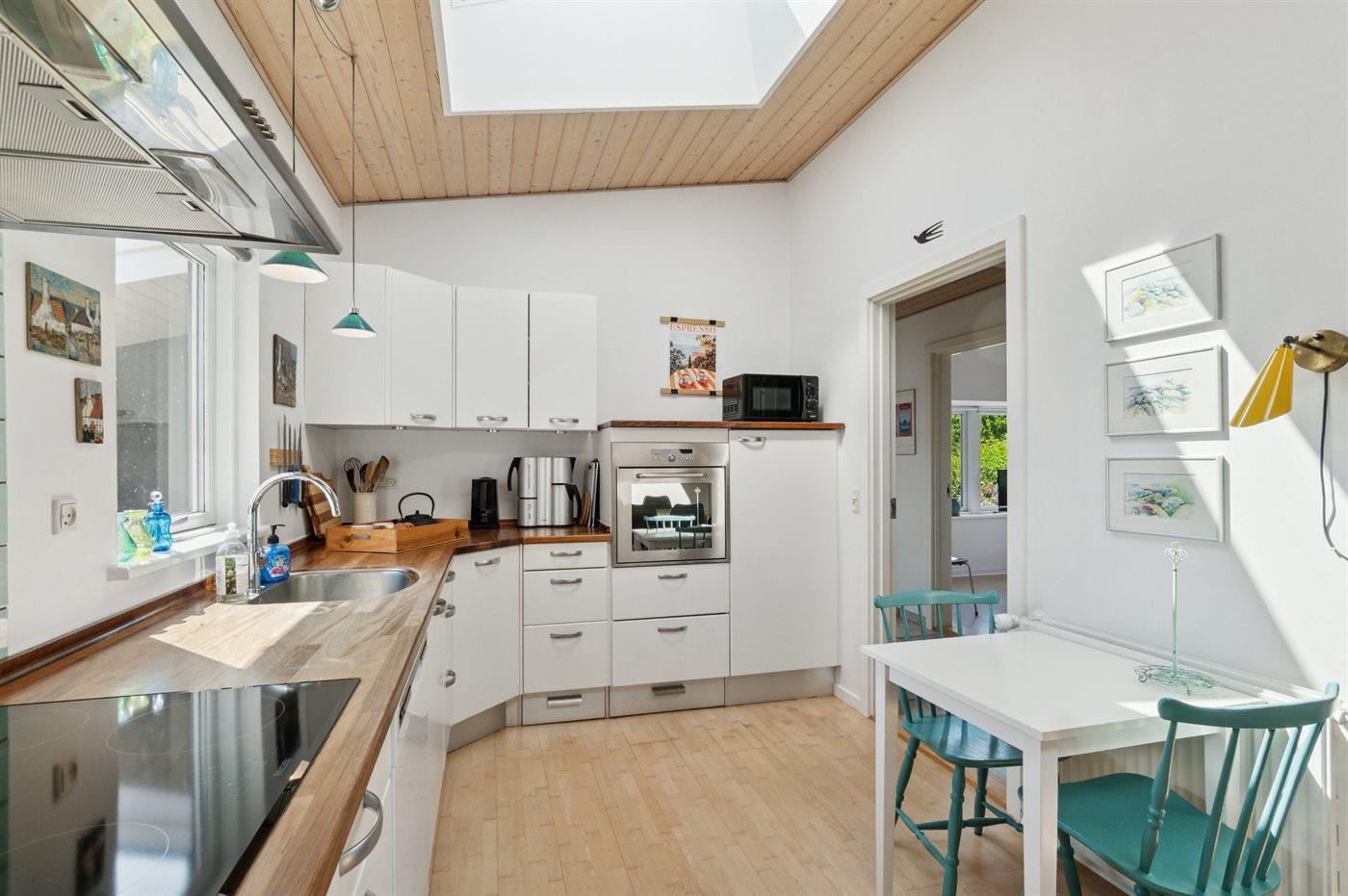 Køkkenet er udstyret med 1 køleskab. Der er 4 keramiske kogeplader, varmluftovn samt opvaskemaskine.