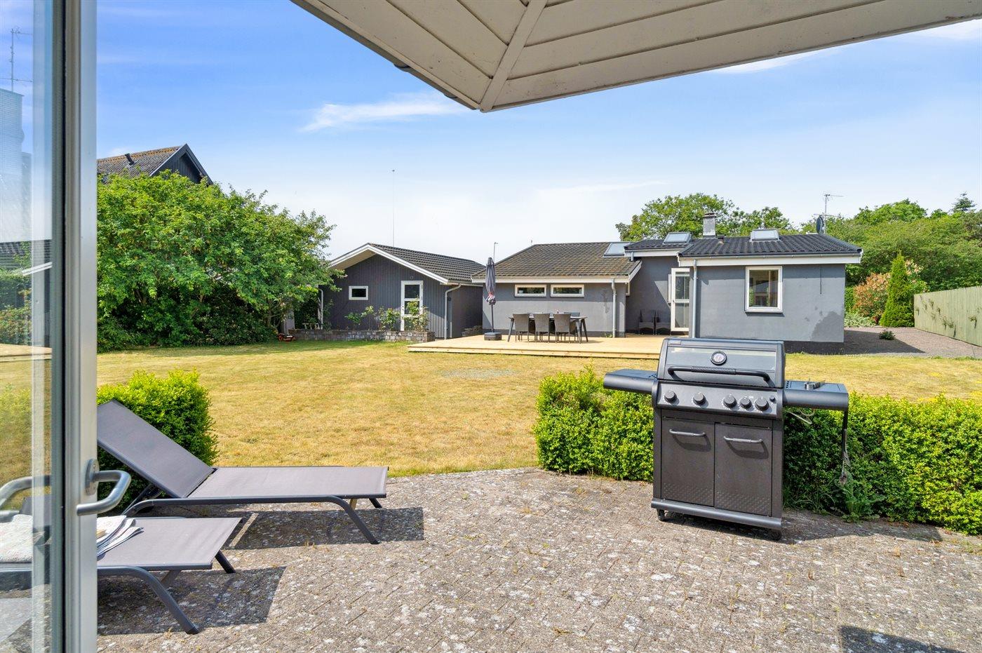 Ferieboligen er beliggende på en 980 m² stor naturgrund. Grunden er indhegnet. Der er 250 m til havet. Nærmeste forretning er beliggende i en afstand af 3000 m. Til ferieboligen hører 150 m² terrasseareal. Udendørs bruser. Grill til rådighed. Der er carport til rådighed. Parkering ved ferieboligen.