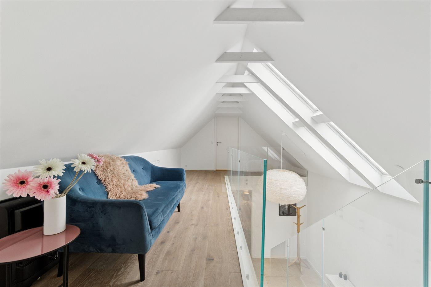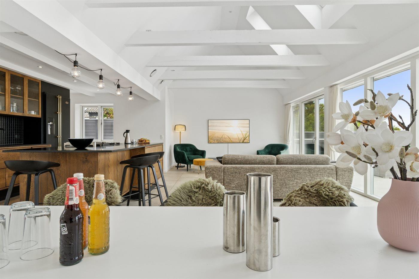 I den store køkken alrum-afdeling, der er en del af den lyse opholdsstue, mødes man af et fantastisk lysindfald. Køkkenafdelingen er i rigtig høj kvalitet og fremtræder i farvevalg og udførsel særdeles indbydende, hvor Quooker og indbygget el-grill er en del af køkkenudstyret. Der er et større badeværelse med et godt bademiljø.