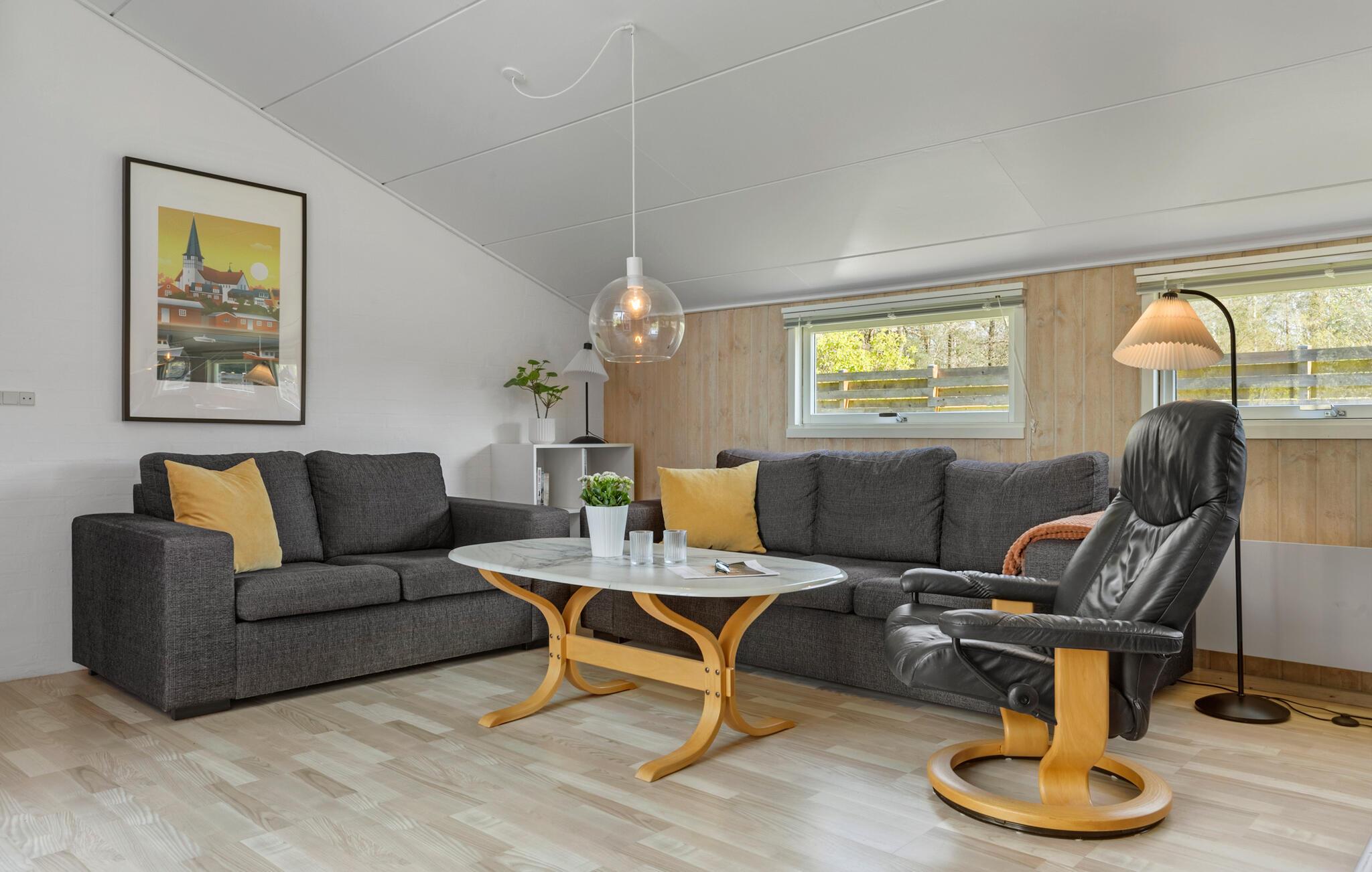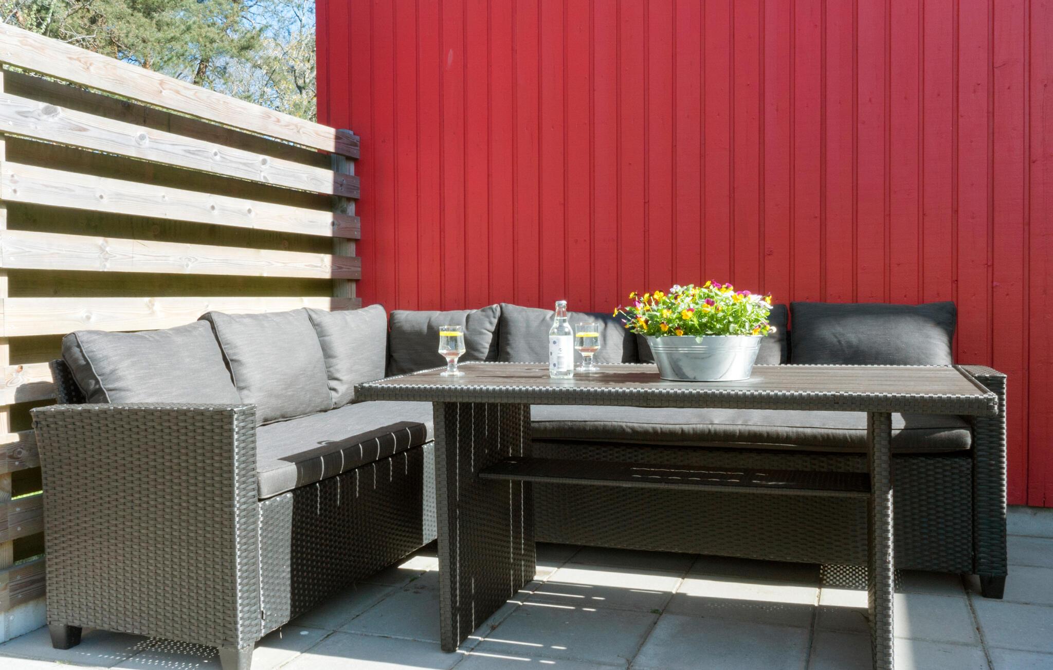 Fra opholdsstuen er der adgang til en dejlig stor, åben terrasse, hvor de mange ferietimer kan nydes i afslappende omgivelser. På græsplanen har børnene god plads til at lege. Dette feriehus ligger attraktivt nær skøn badestrand, minigolf og hyggelig småbådehavn.