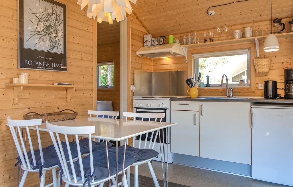 Hytten er velindrettet med plads til fire personer. Der venter et hjemligt interiør i skandinavisk stil med tekøkken. Tag en kop kaffe og sæt jer i det hyggelige opholdsrum eller find en stol på den solrige terrasse. Sovepladserne fordeler sig over en dobbeltseng og en køjeseng.