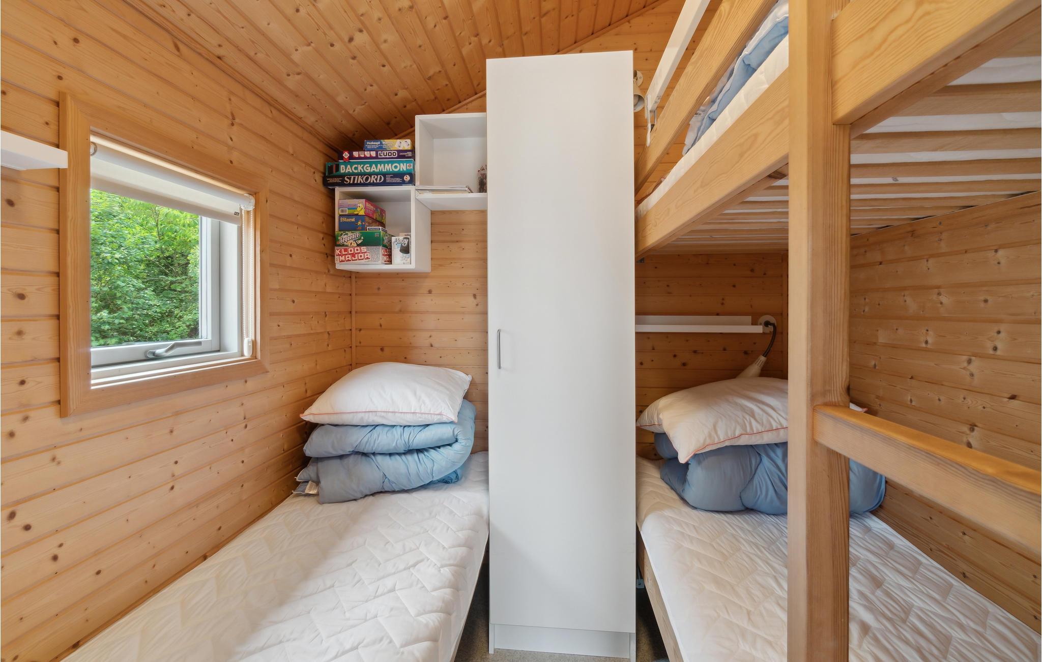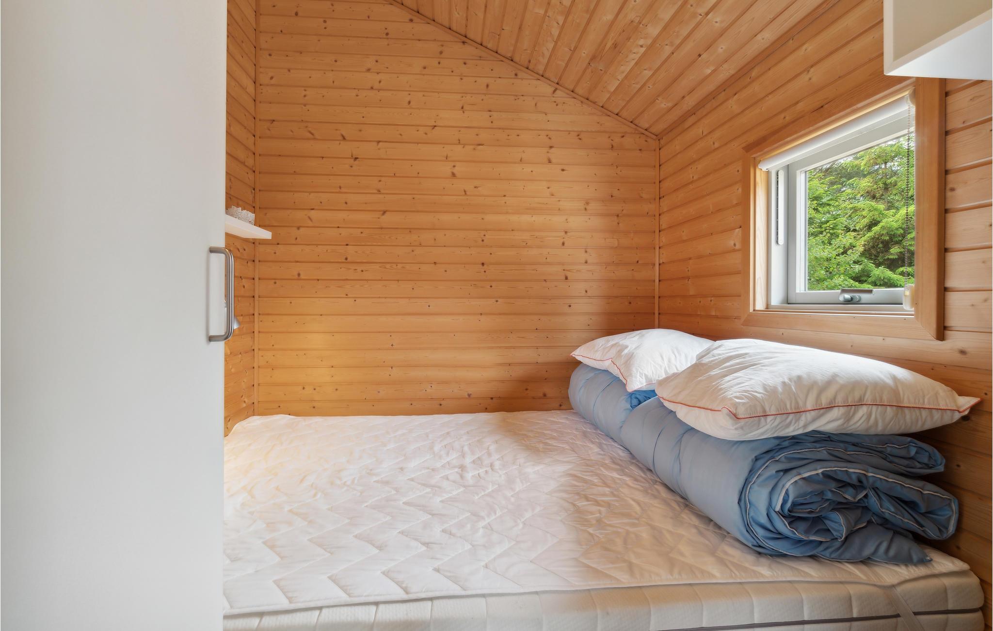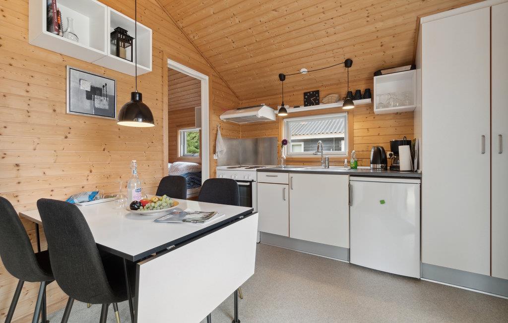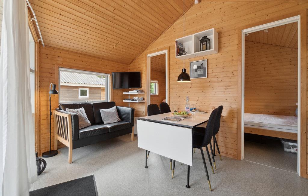 Hytten er velindrettet med plads til fem personer. Der venter et hjemligt interiør i skandinavisk stil med åbent køkken, hvor I finder alt det udstyr, I skal bruge. Tag en kop kaffe og sæt jer i det hyggelige opholdsrum eller find en stol på den solrige terrasse. Sovepladserne fordeler sig over en dobbeltseng, en køjeseng og en enkeltseng.