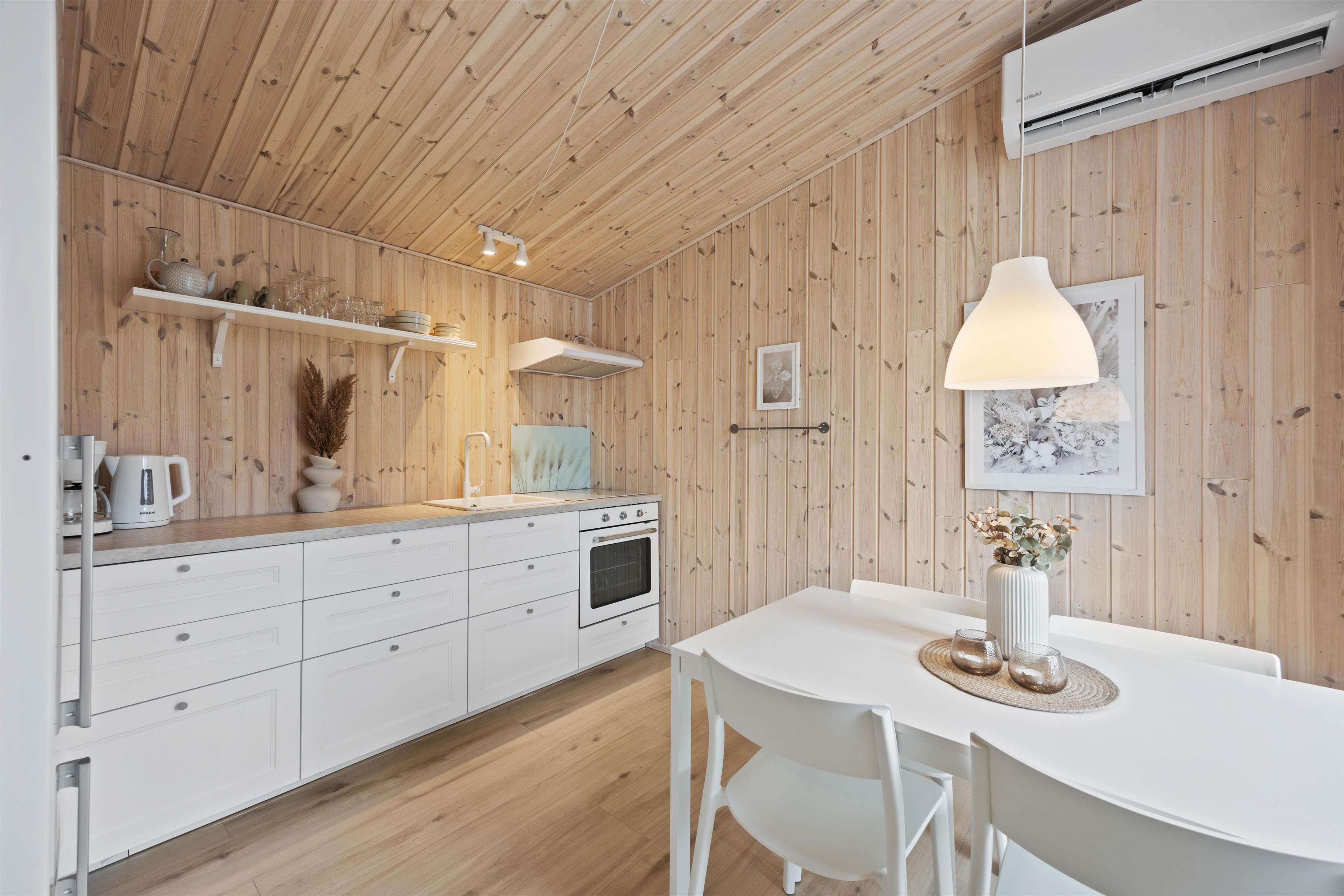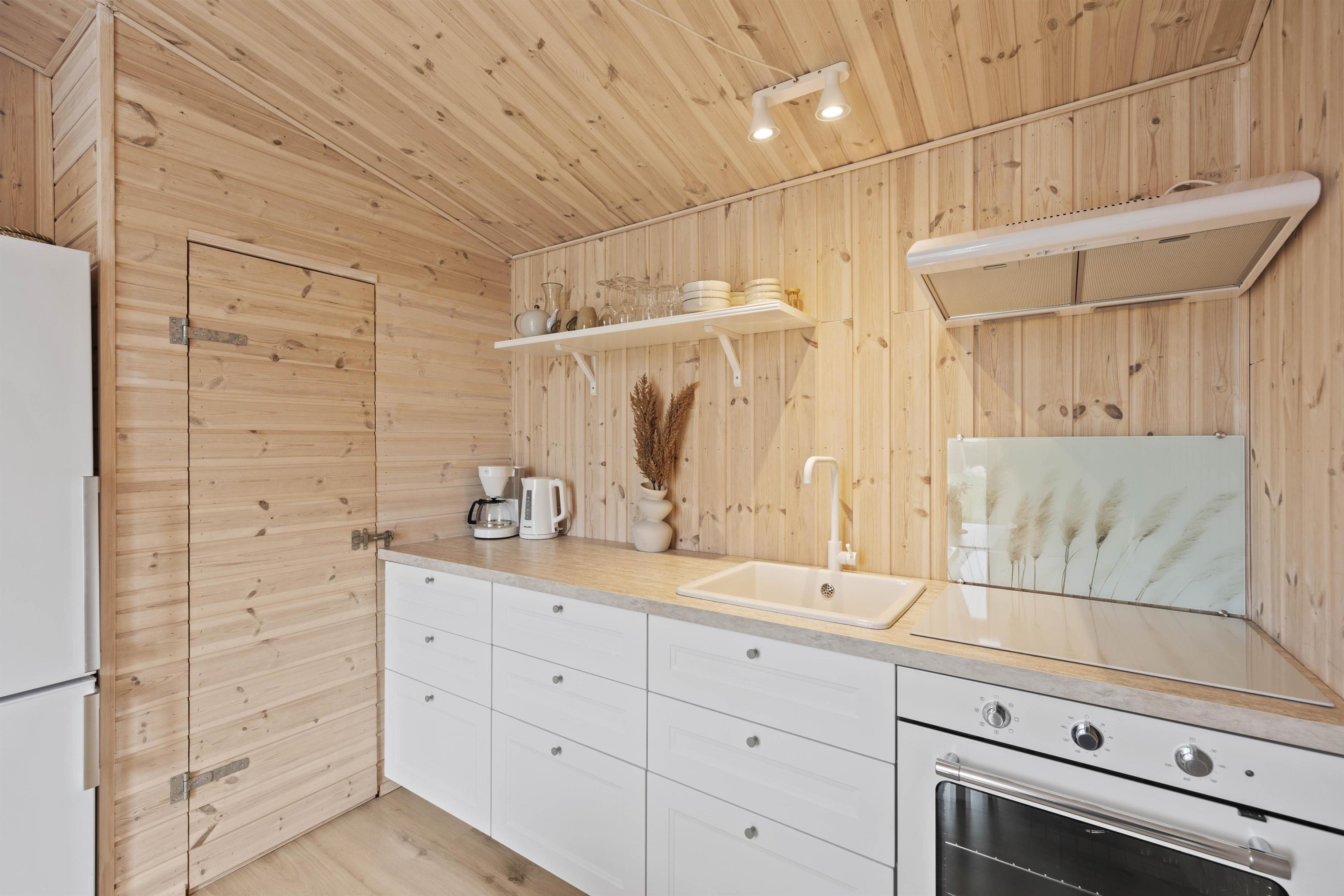Sommerhuset er perfekt til 2 personer og 1 hund, og her vil I straks føle jer hjemme. Det lyse og moderne køkken er nyt og udstyret med både ovn og kogeplade, så I nemt kan lave lækre måltider. Fra både køkkenet og soveværelset er der direkte adgang til terrassen, hvilket gør det let at nyde vejret hele dagen – fra morgenkaffen til aftensolen.