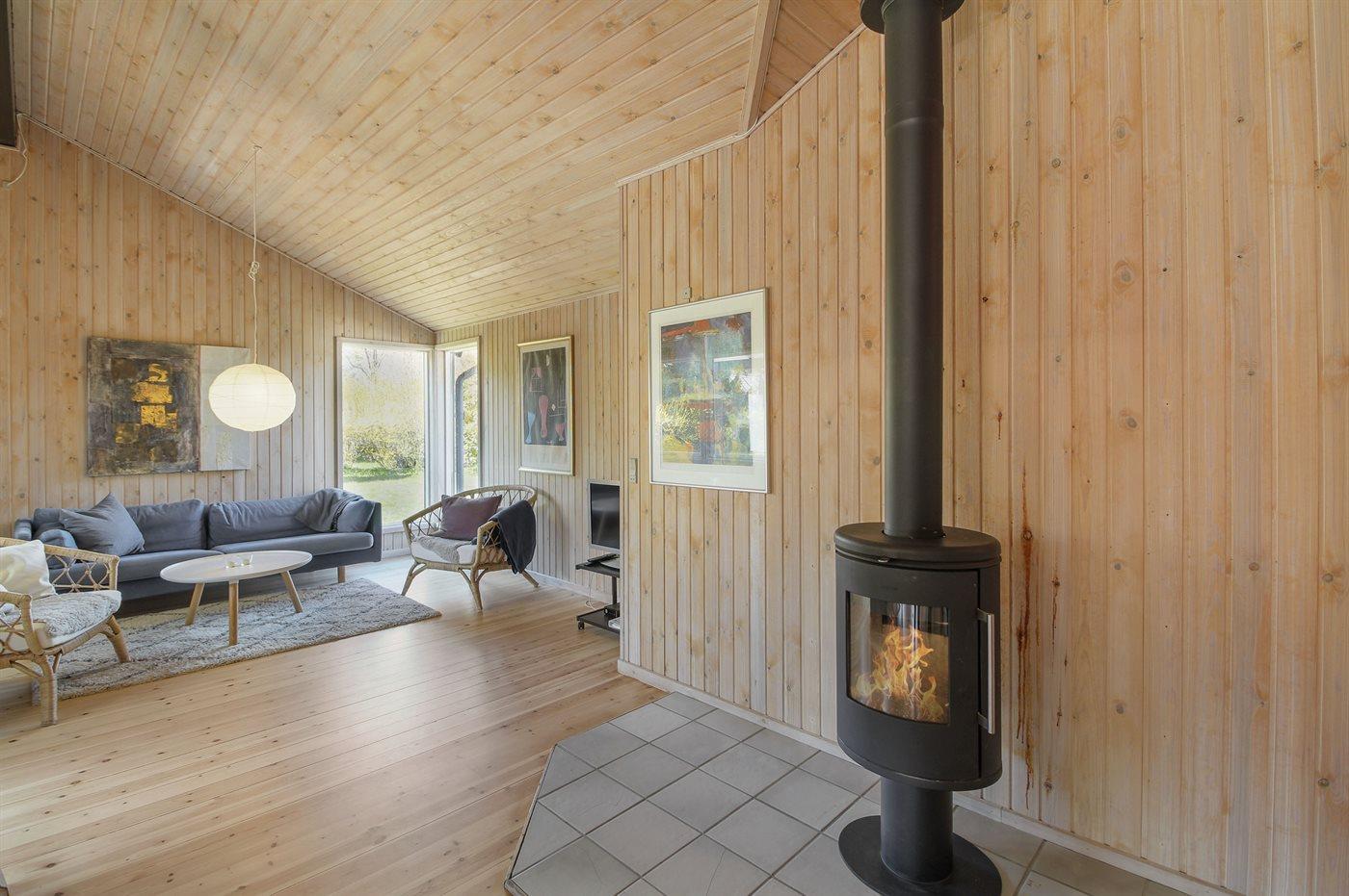 Der er brændeovn til hyggelige stunder samt en energibesparende varmepumpe, som sikrer et behageligt indeklima året rundt.
