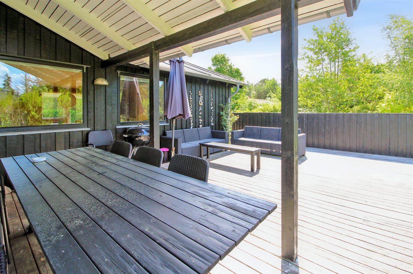 Sommerhuset er opført i 1992 og har et åbent terrasseareal, herunder en skøn overdækket terrasse, hvor man kan nyde måltiderne og sommerens lange aftener. Der er kuglegrill til fri afbenyttelse.