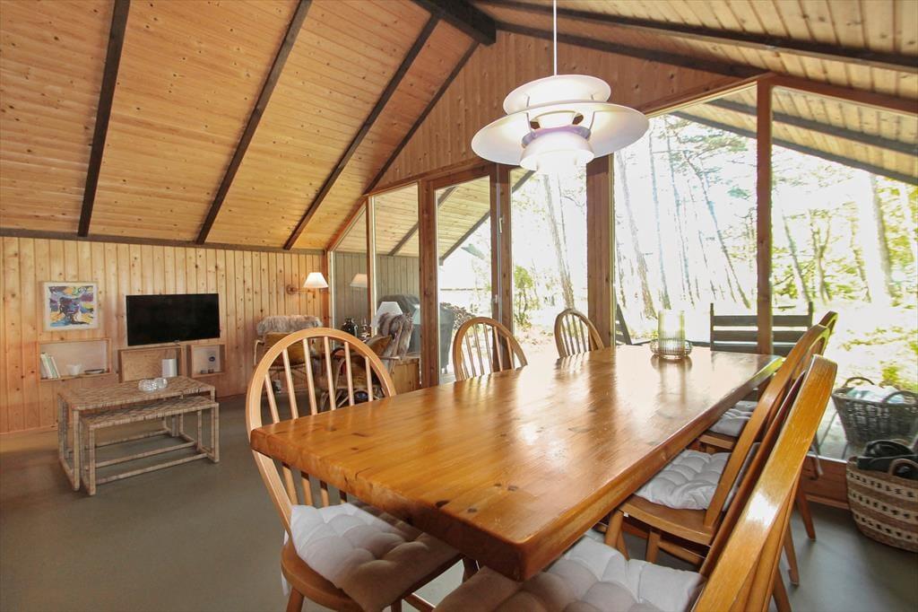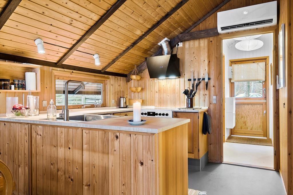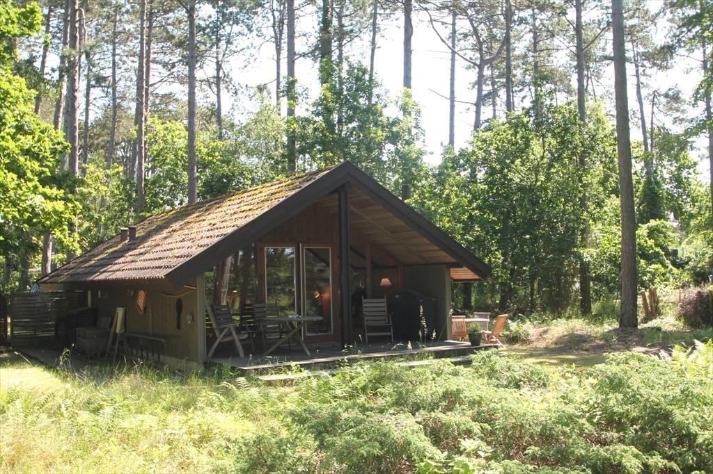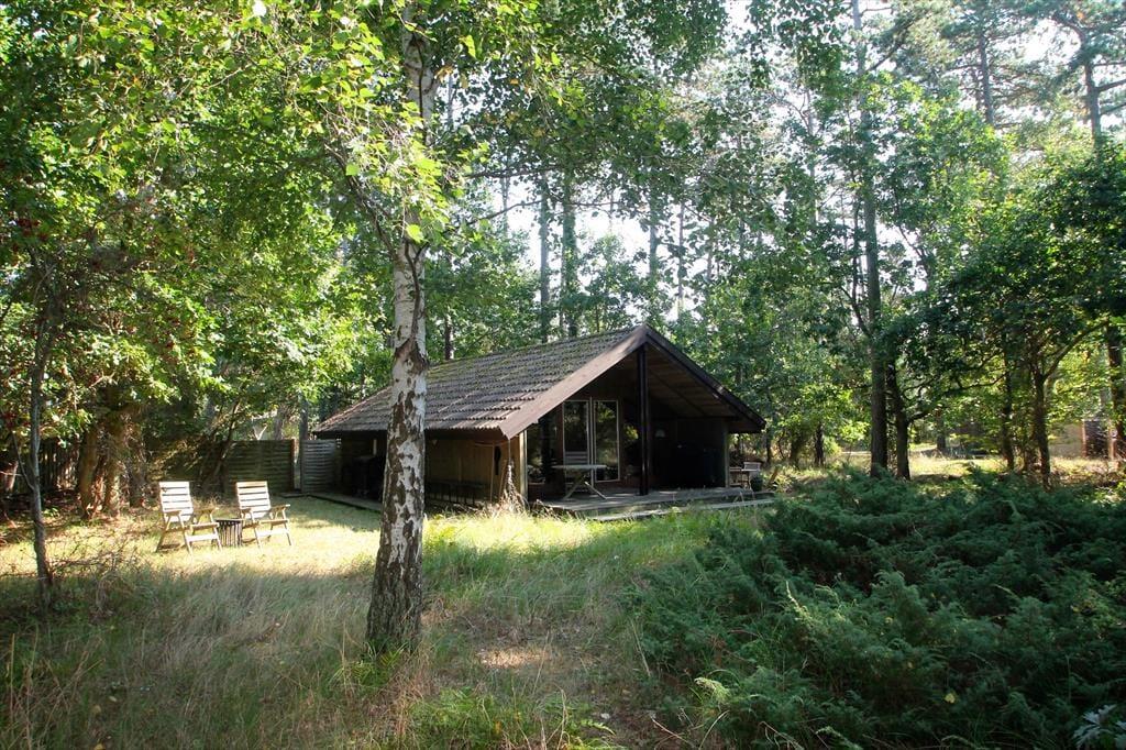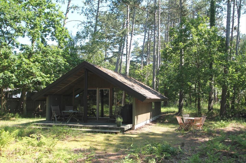 Skovhuset er en lille skjult perle, der er omgivet af vild natur og havet i baghaven. Kvadratmeterne er godt udnyttet i huset og køkken alrummet inviterer til hygge og leg. De store vinduer giver det fineste lys og bringer naturen helt tæt på. Sommerhuset indeholder kombineret køkken og opholdsstue. Huset er delvist moderniseret i 2024. Køkken med induktionskomfur, køleskab med lille frostboks, kaffemaskine og elkedel. Opholdsstue med udgang til delvis overdækket terrasse, hyggelig spiseplads, sofa, lænestole, Smart-TV med DRTV, og adgang til streamingtjenester (kræver eget login). Badeværelse med bruseniche. To soveværelser, et med dobbeltseng og et med en køjeseng (70x190 cm). Huset opvarmes med varmepumpe og elvarme.