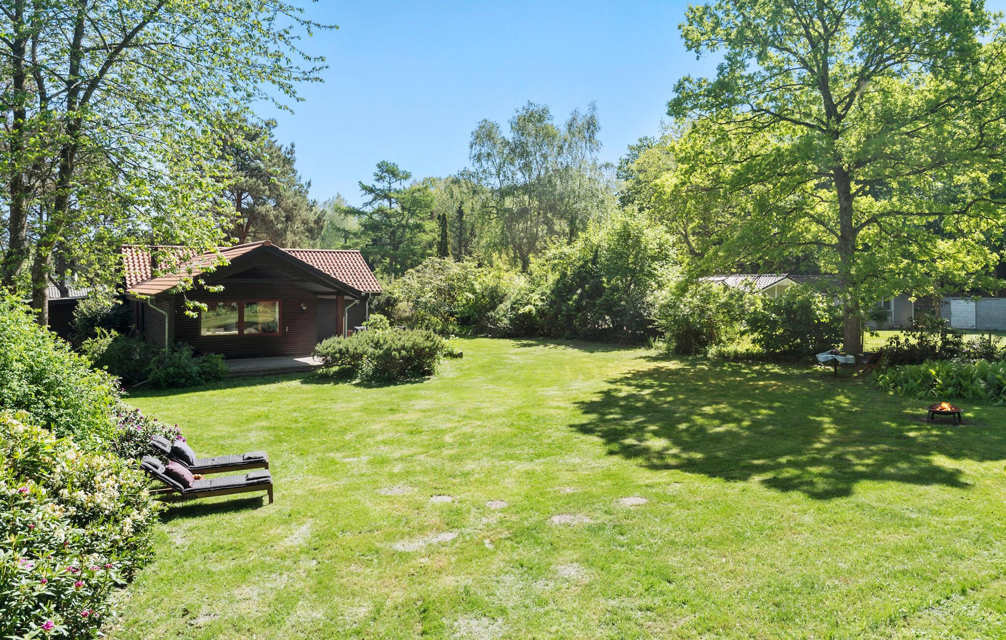 Charmerende træhus ved Bildsø strand med stor terrasse og skovudsigt, ideelt til familieferie nær havet.