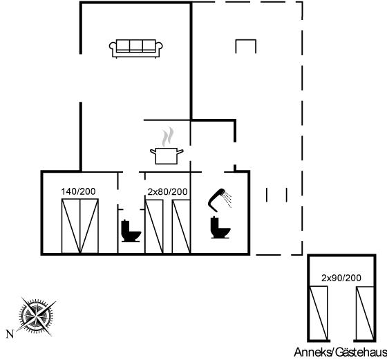 Der er i alt 3 soveværelser. Sovepladserne fordeler sig på: 2 sovepladser i dobbeltseng. 4 sovepladser i enkeltsenge. 2 af disse sovepladser befinder sig i et anneks. Derudover er der 1 stk. barneseng.