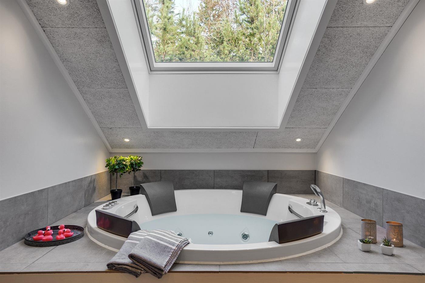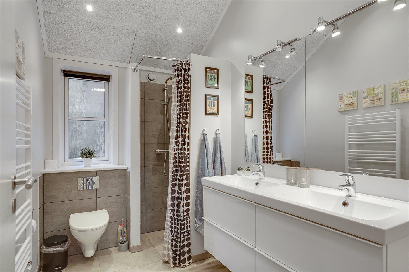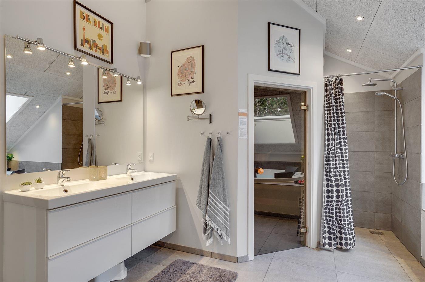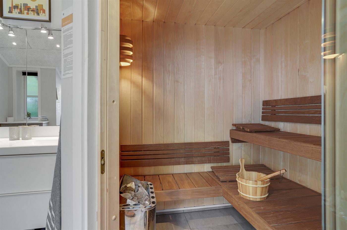 Der er 3 badeværelser med bruseniche og 3 toiletter. Der er gulvvarme på 1 badeværelse. Dampkabine. I saunaen er der mulighed for afslapning.