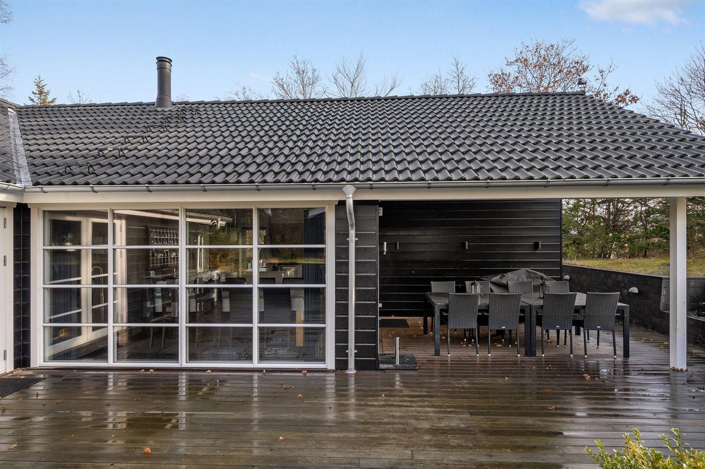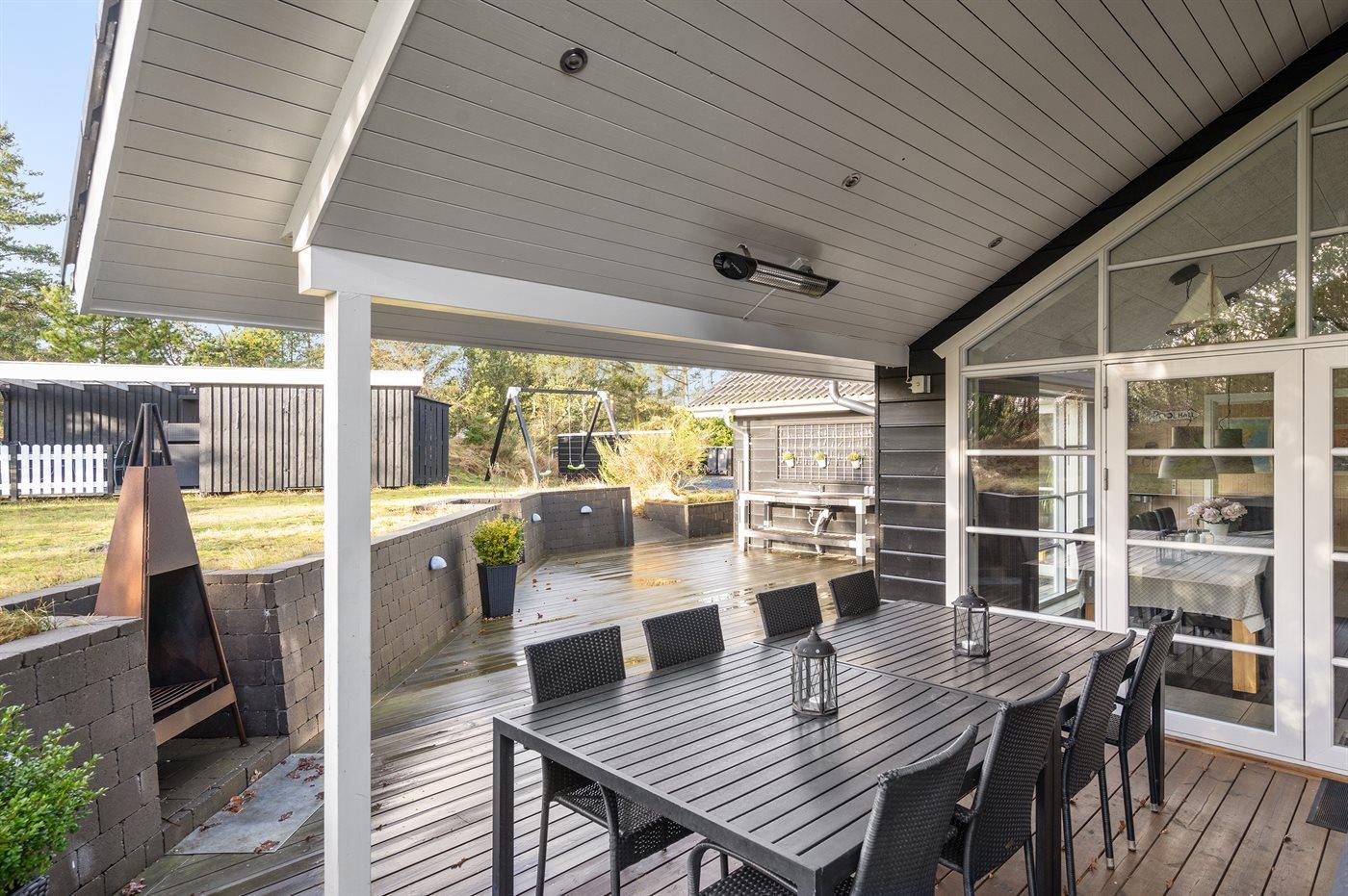 Ferieboligen er beliggende på en 1479 m² stor naturgrund. Der er 270 m til havet. Nærmeste forretning er beliggende i en afstand af 3000 m. Der er en golfbane i en afstand af 2500 m. Til ferieboligen hører 135 m² terrasseareal. Desuden er der 30 m² overdækket terrasse. Der er redskabsrum. Gynge. Trampolin. Legetårn. Rutchebane. Petanque. Udendørs bruser. På lune aftener sørger en udendørs pejs for hyggelig stemning og der findes desuden en terrassevarmer. Grill til rådighed. Der er installeret stik til opladning af elbil. Parkering ved ferieboligen.