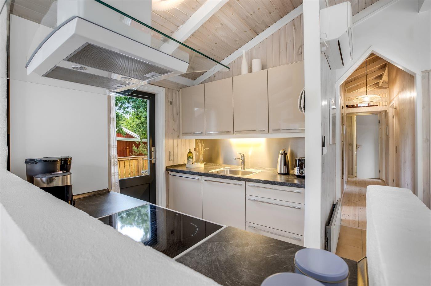 Køkkenet er udstyret med 1 køleskab. Der er 4 keramiske kogeplader, varmluftovn, mikrobølgeovn samt opvaskemaskine Der er gulvvarme i køkkenet.