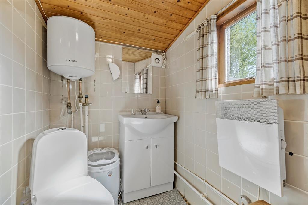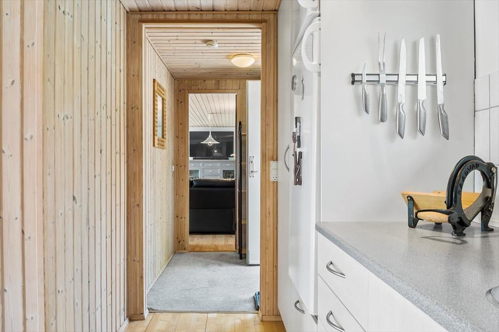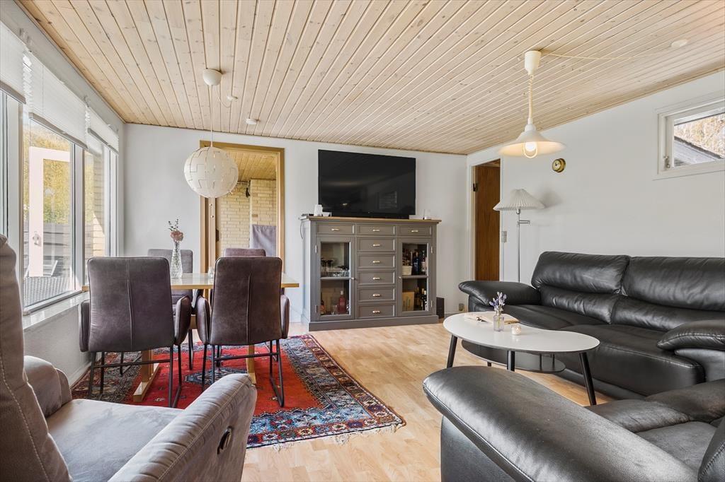Velkommen indenfor: Træd ind i gangen, videre til det lyse køkken med god spiseplads, hvor der også er direkte udgang til en af terrasserne. Videre til den rummelige opholds- og spisestue, hvor du kan nyde den hyggelige atmosfære med fin udkig til den store have. Der er desuden en dejlig udestue i forbindelse med stuen med flere komfortable siddepladser. Huset rummer to soveværelser begge med to sovepladser samt et praktisk badeværelse med toilet, bruser og håndvask.