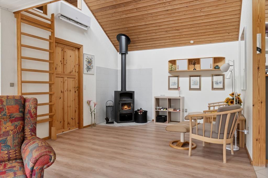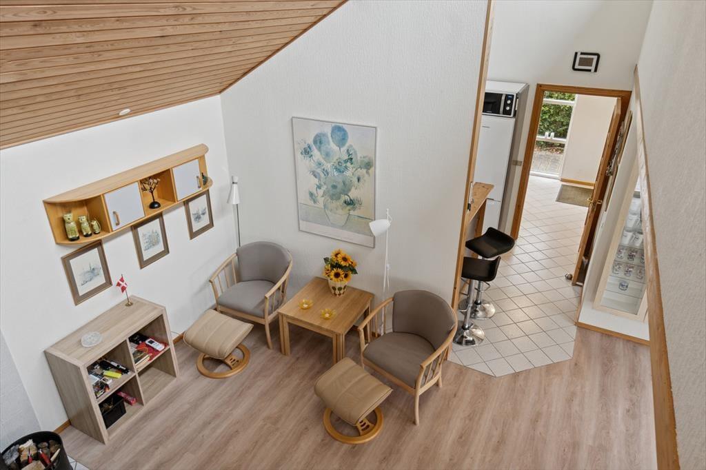 Velkommen indenfor: Huset har en komfortabel indretning med indbydende lysindfald takket være vinduerne i det forskudte tag og udestuen. Loft til kip, i halvdelen af huset, som sammen med den lyse indretning sikrer en meget hyggelig atmosfære. Den rummelige stue og spisestue er perfekt til afslapning, og den ligger i åben forbindelse med køkkenet. Praktisk badeværelse med vaskemaskine og husets sovepladser er fordelt på to gode værelser samt en hems. Tænd op i brændeovnen på de køligere dage og lad roen og feriestemningen sænke sig.