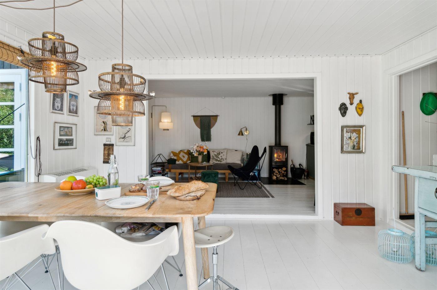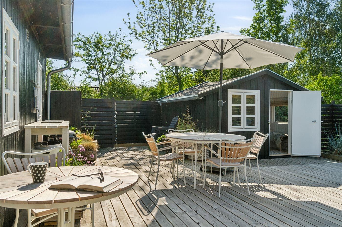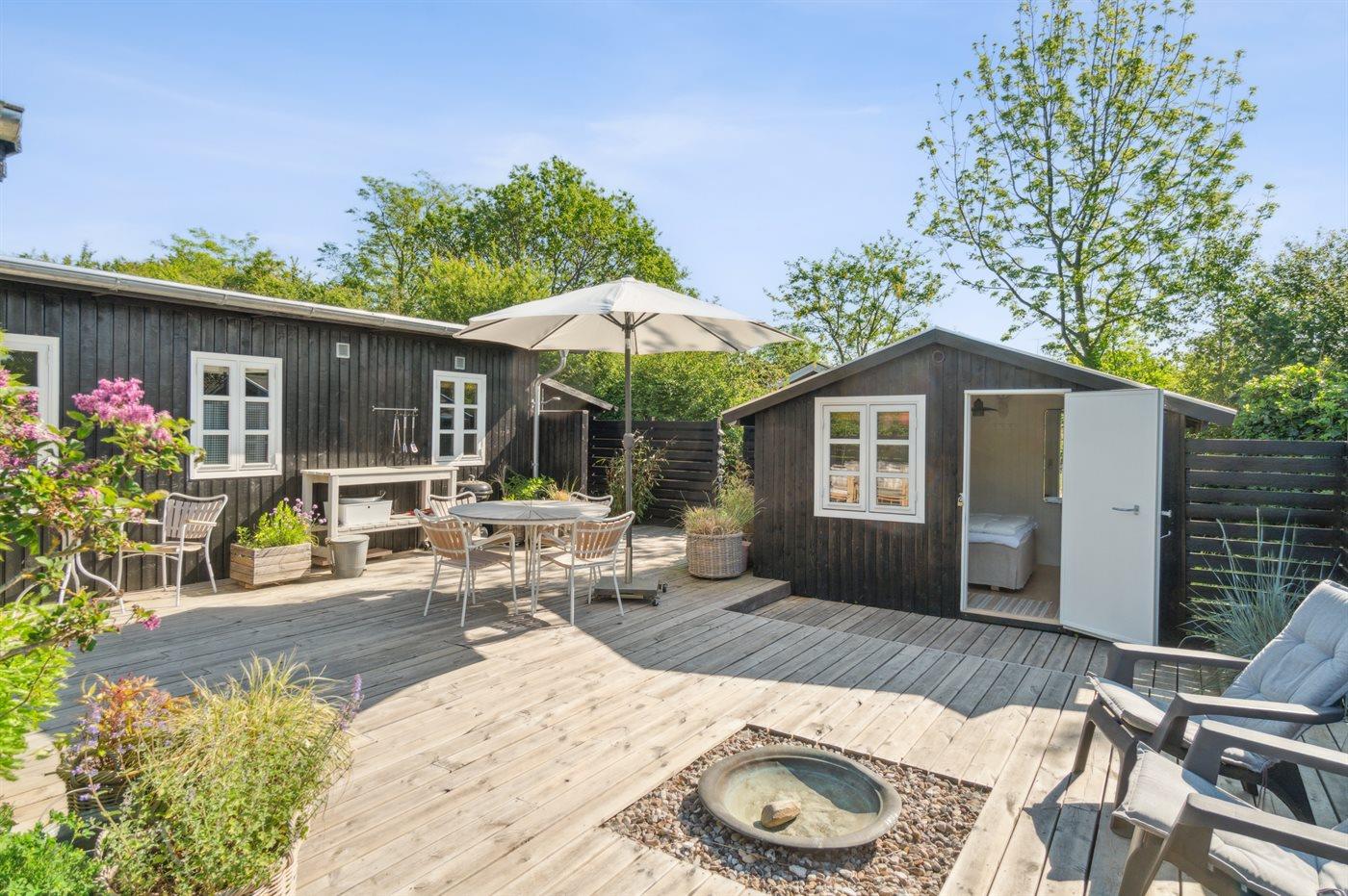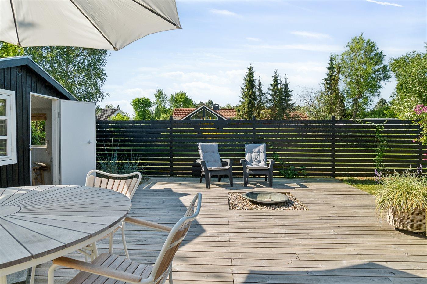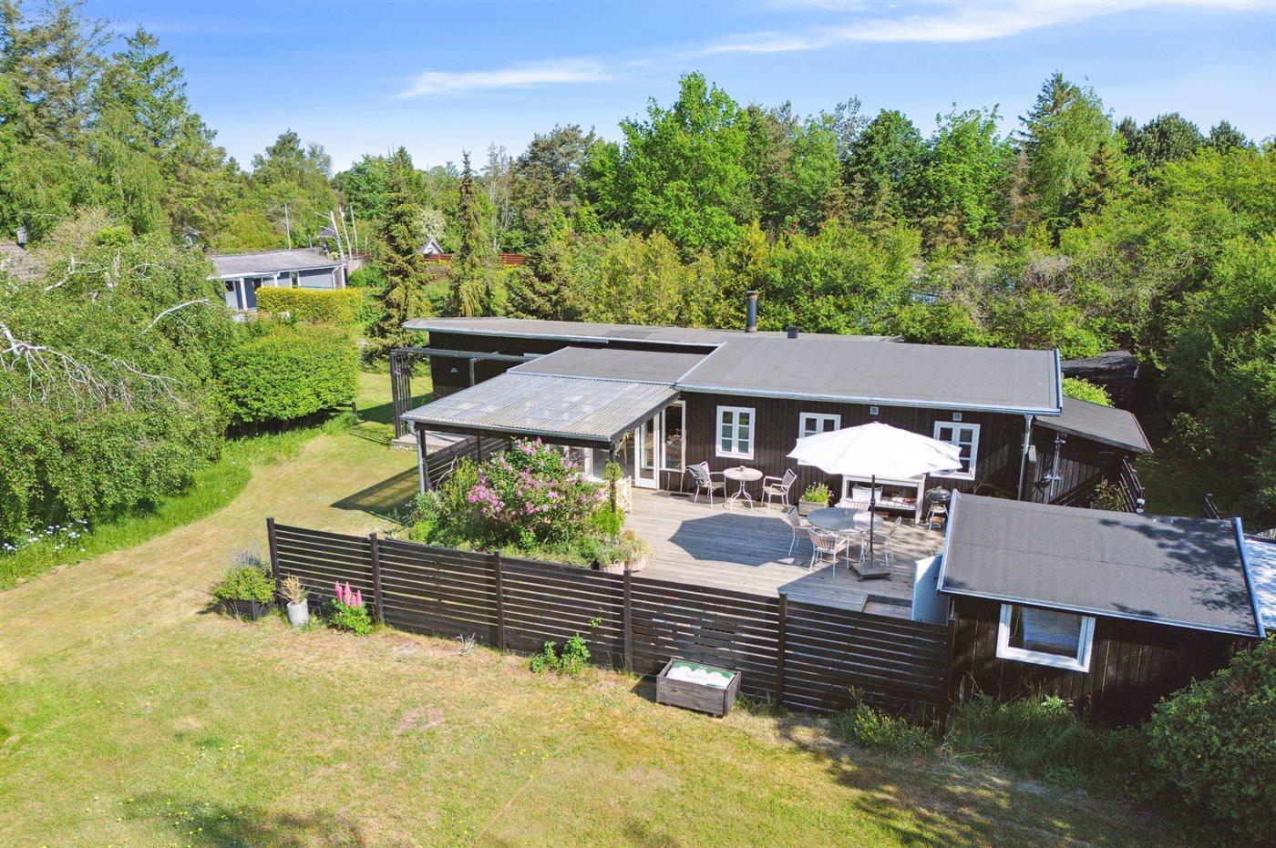 Dette hyggelige og sommerligt indrettede feriehus indbyder til ro og afslapning inde og ude. Huset er beliggende i et fredeligt sommerhusområde i landlige og naturskønne omgivelser og med kun 400 meter til en dejlig og børnevenlig sandstrand. Huset er moderniseret i 2021 og hyggeligt indrettet med et moderne og funktionelt køkken som er i direkte forbindelse med stuen og spisepladsen og som danner rammen for hyggeligt samvær. Herfra er udgang til den store dejlige træterrasse med udebruser og bålsted og hvor en del er overdækket.