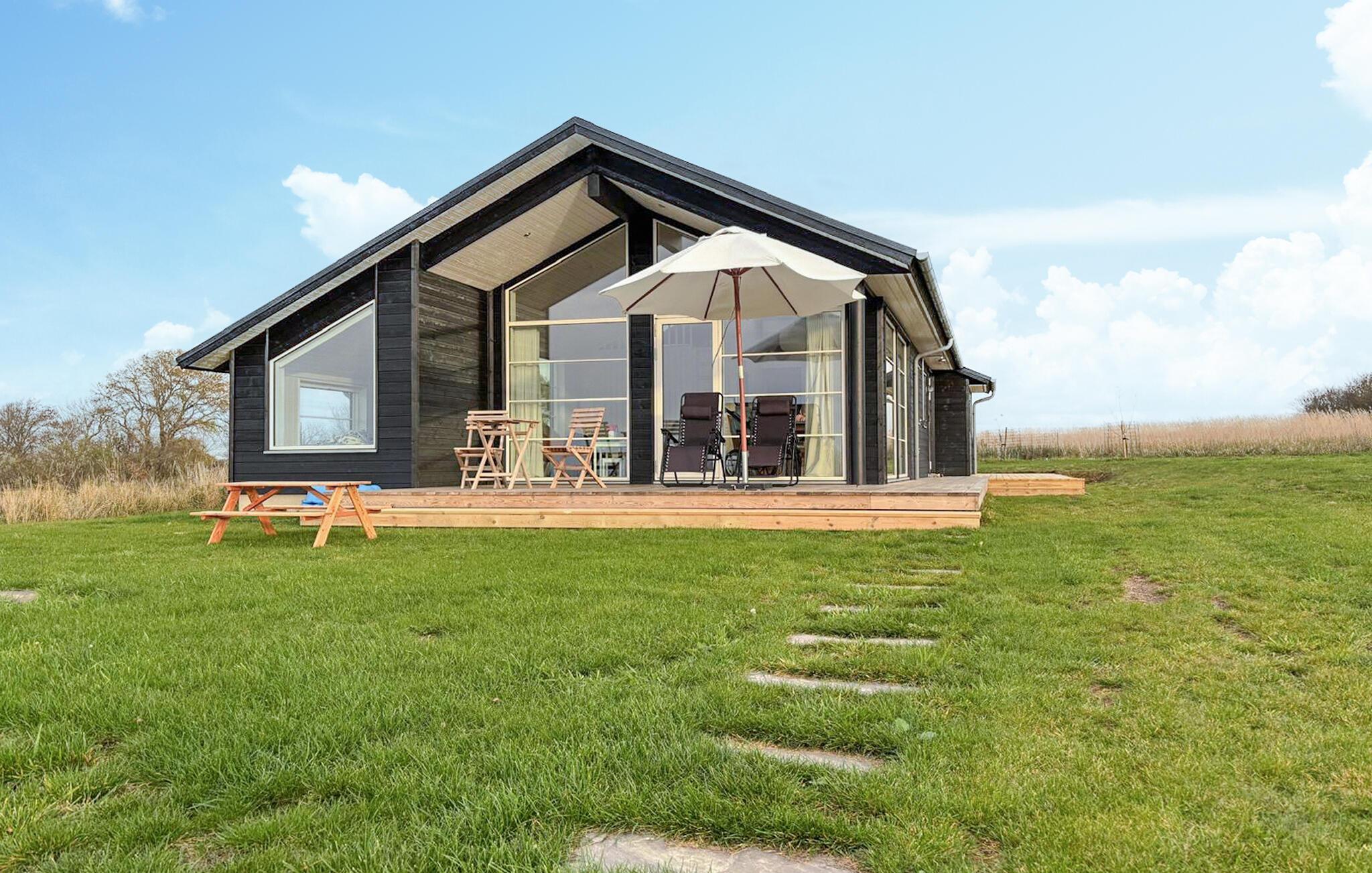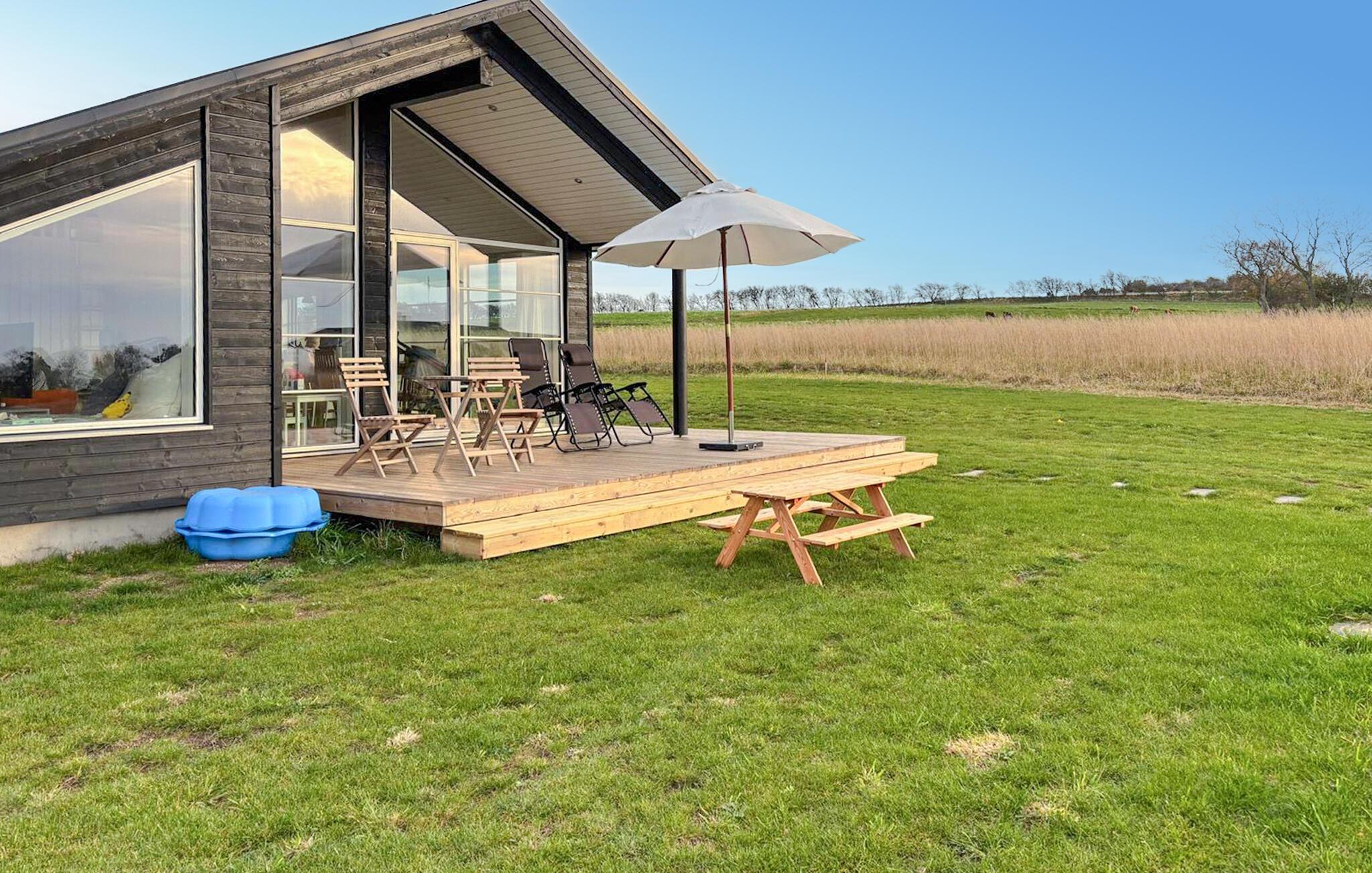 Moderne feriehus med panoramaudsigt, stor terrasse og nærhed til børnevenlig strand i Bjerge Nordstrand.