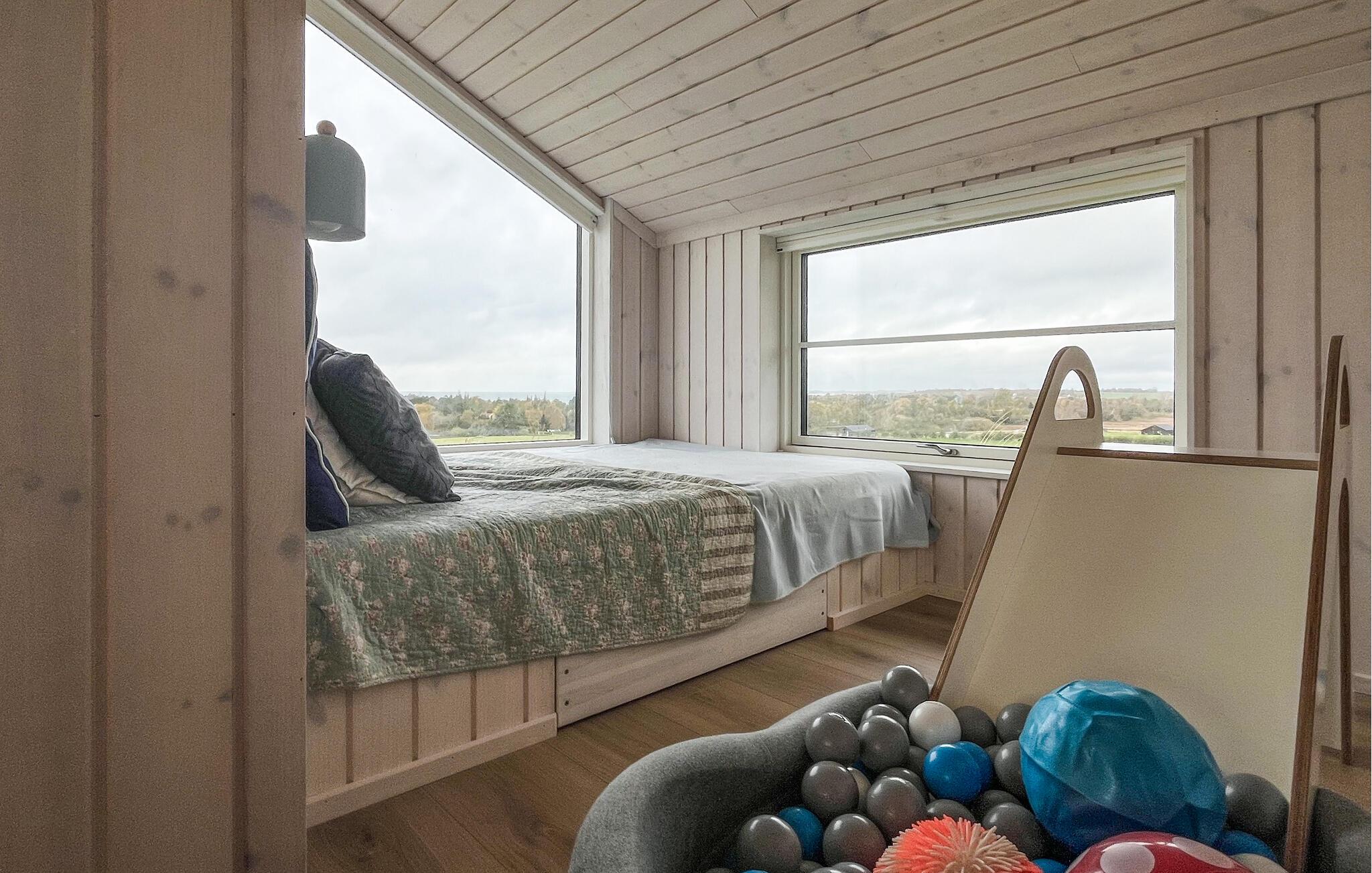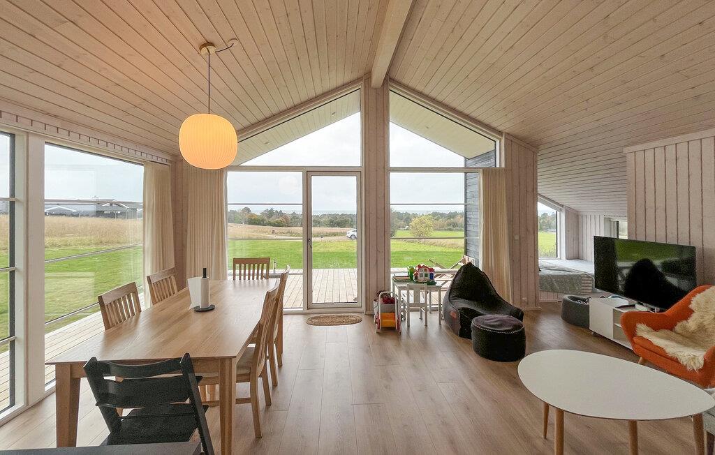 Nyd jeres ferie i dette lyse og stilfulde feriehus, der kombinerer moderne arkitektur med en hyggelig atmosfære. Den høje gavl, store panoramavinduer og det lyse træinteriør i stuen skaber en indbydende og luftig atmosfære. Slap af her, læs en bog, mens I nyder de vidtstrakte marker eller nyd måltider sammen ved det store spisebord. Det moderne køkken med morgenmadsbar og apparater af høj kvalitet tilbyder alt, hvad I behøver til afslappede aftener med madlavning.