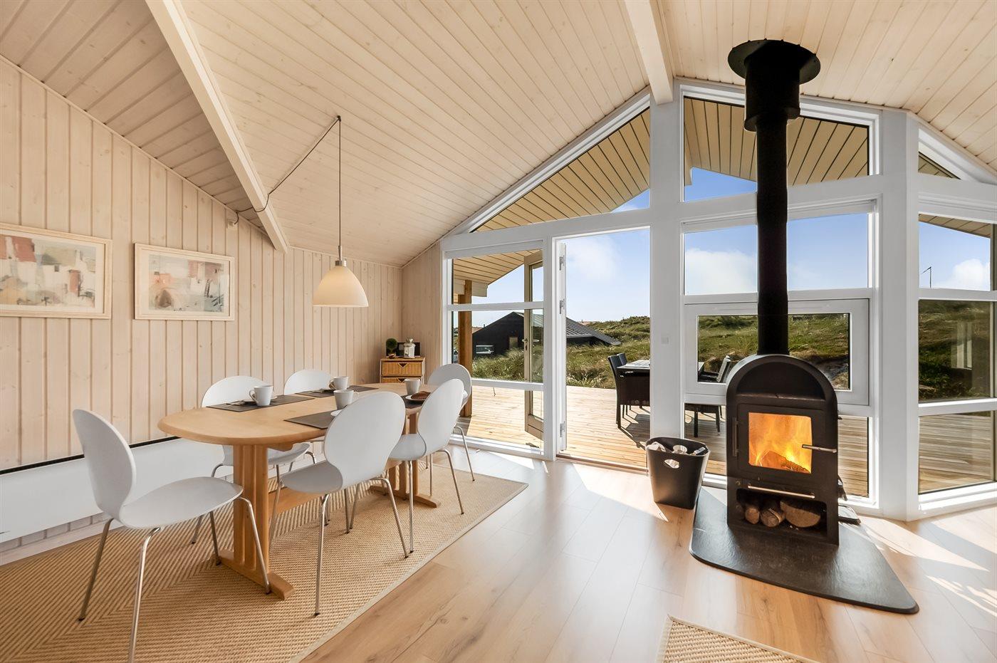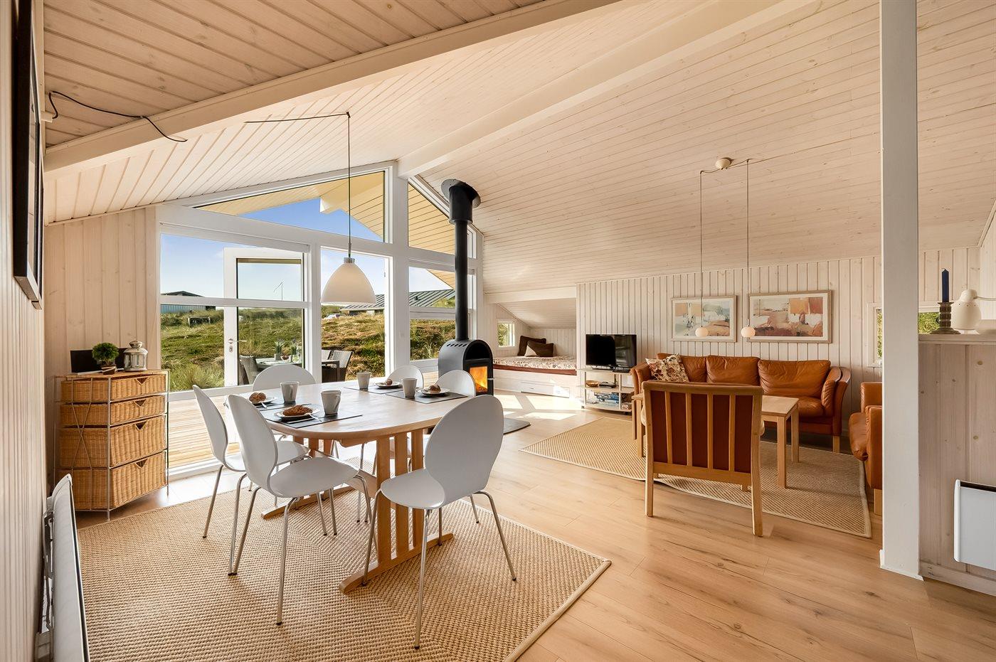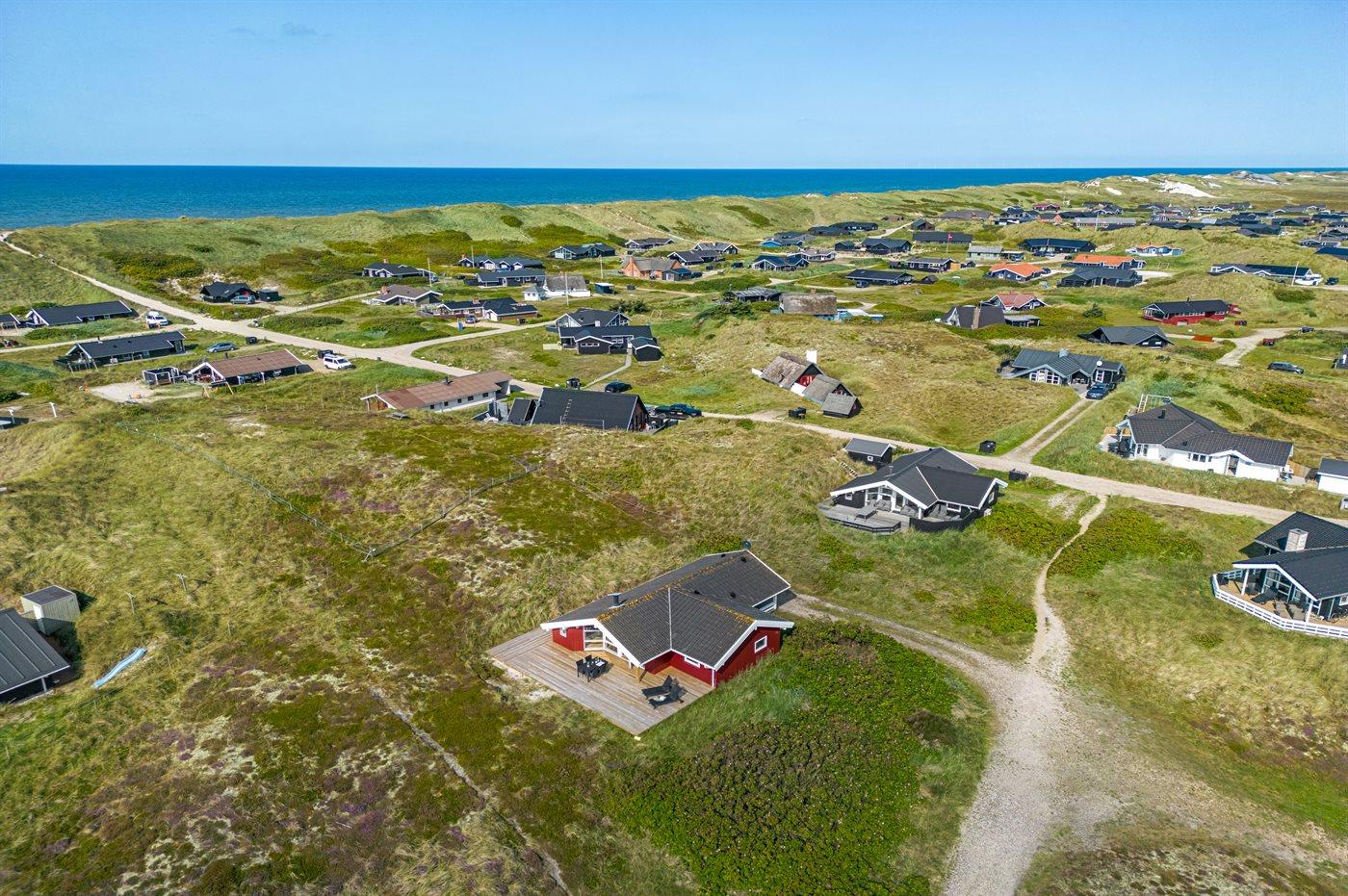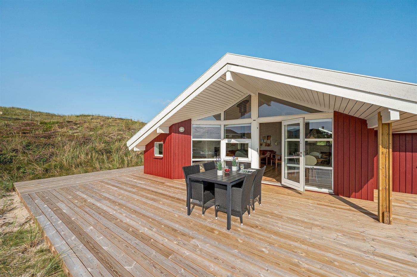 Kun 150 m fra Vesterhavet, på en rigtig dejlig, kuperet klitgrund, ligger dette smagfuldt indrettede og møblerede sommerhus. Huset er bygget i træ og har med sine skrå vinkler og de synlige loftsbjælker en spændende arkitektur. Efter en tur på stranden kan I fra husets hyggekrog, alkoven, bl.a. hygge jer med en god bog eller se fjernsyn. Der er et stort, skønt terrasseareal omkring huset med gode læforhold, hvor man fra havemøblerne og drømmesengene rigtig kan slappe af, nyde solen og den skønne natur hele dagen.