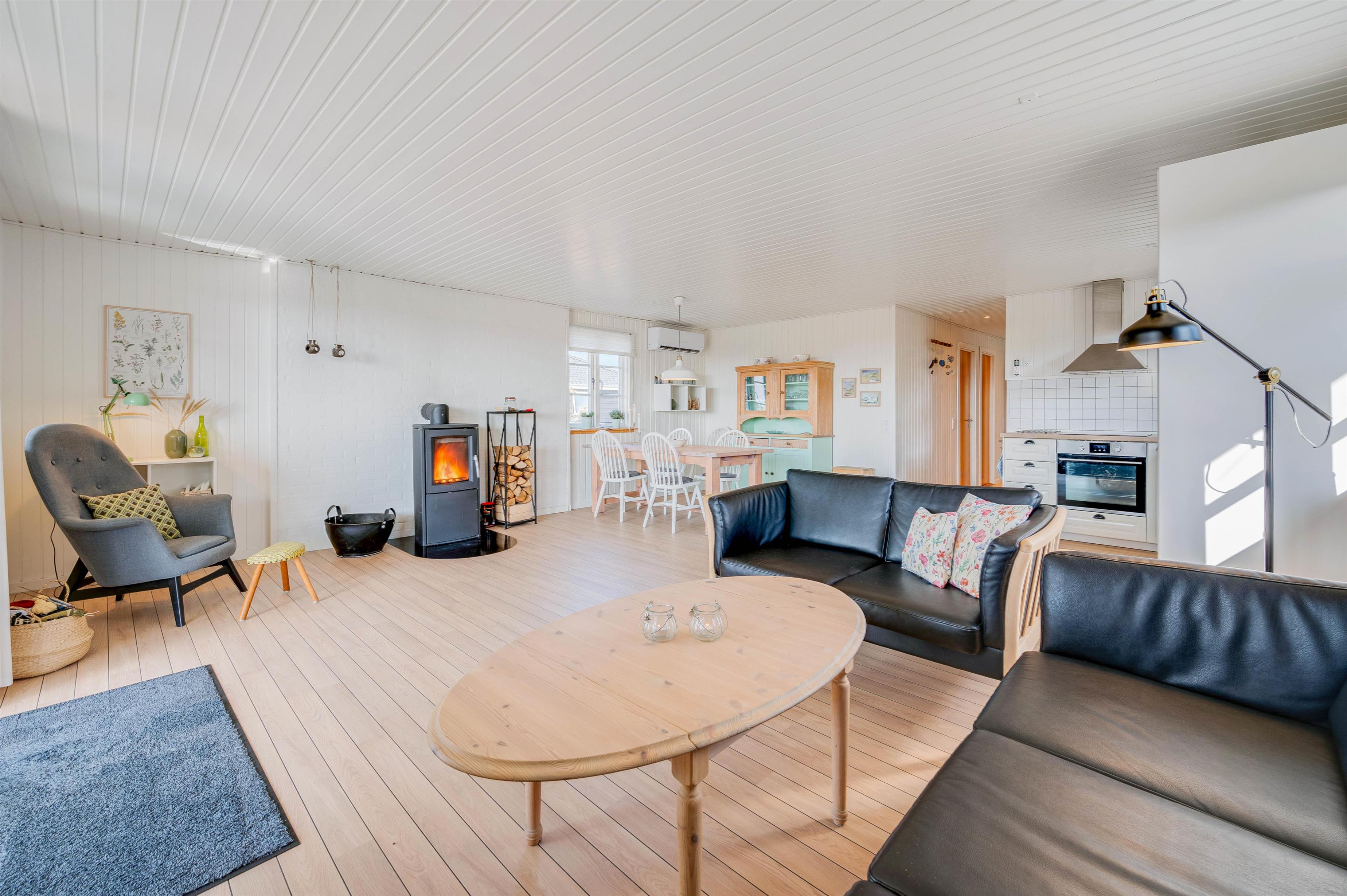 Feriehusets hjerte er det store alrum, som består af køkken, spiseplads og stue i ét. Her kan hele familien samles til hyggelige stunder, mens brændeovnen knitrer i baggrunden. Sommerhuset har både Chromecast og danske tv-kanaler, så I kan se film på en blæsende regnvejrsdag.