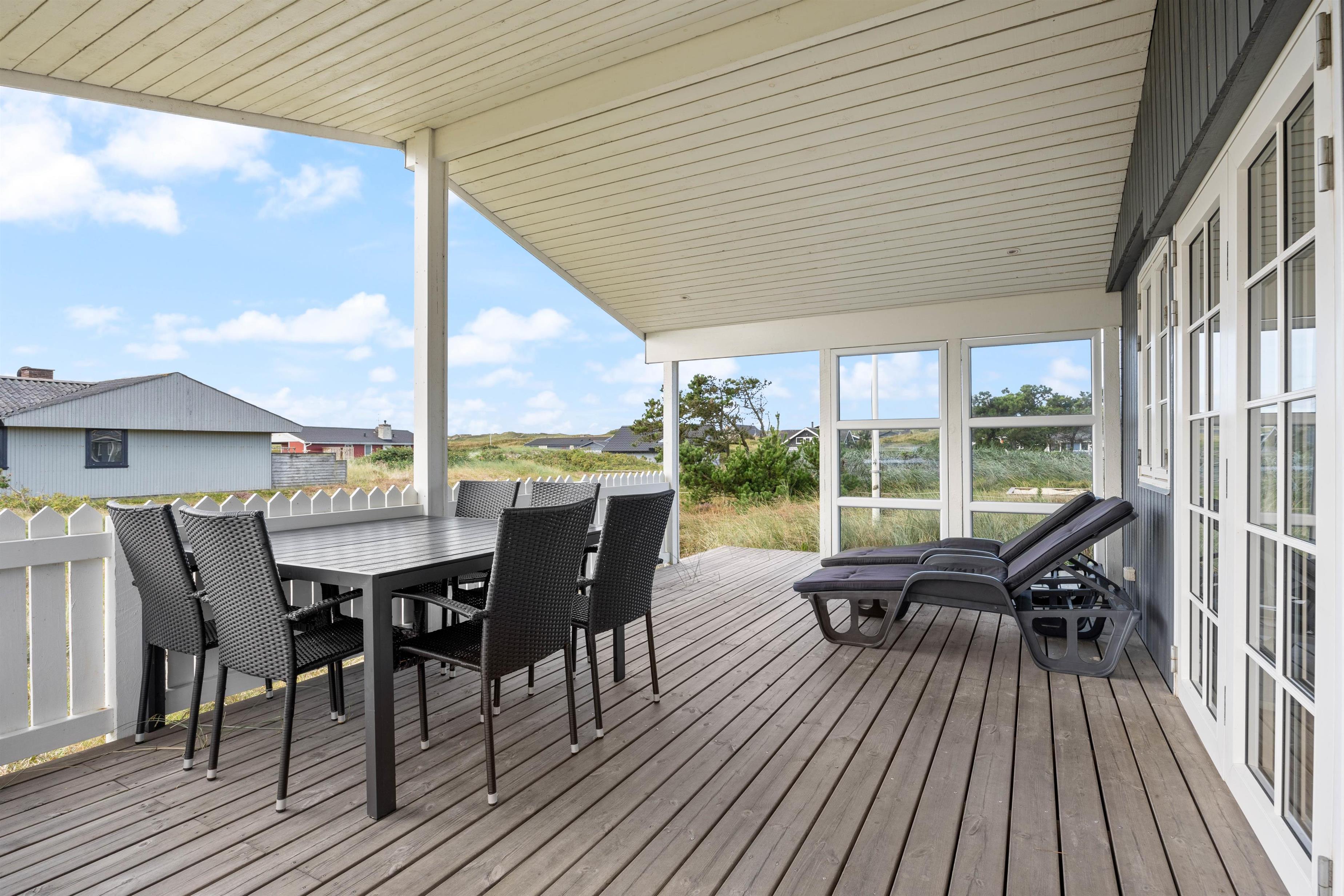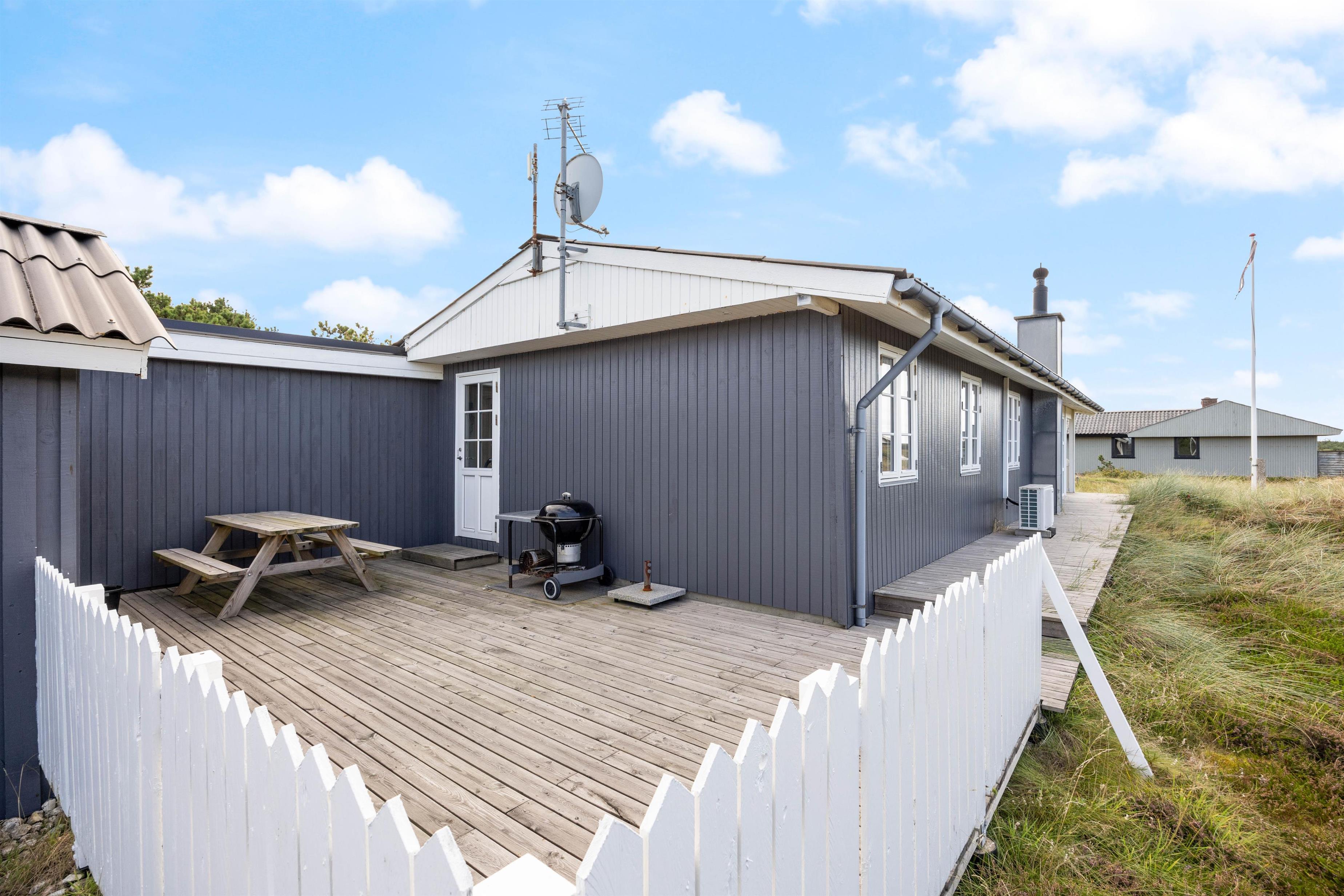 Terrassen løber rundt om feriehuset mod vest og ender på en nordvestvendt terrasse, hvor I kan sidde lidt i skygge for den varme sommersol. Endelig er der også en østvendt terrasse.