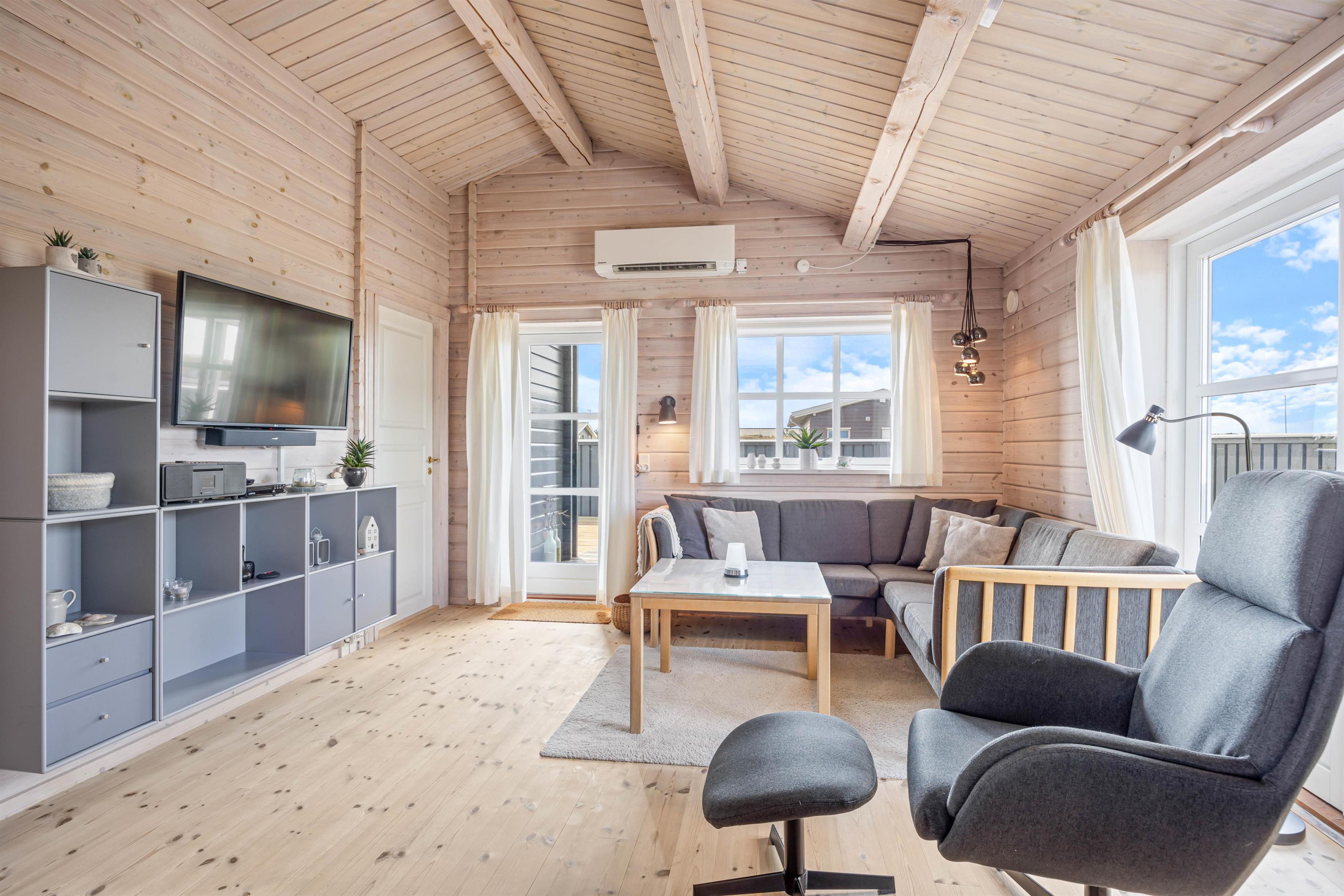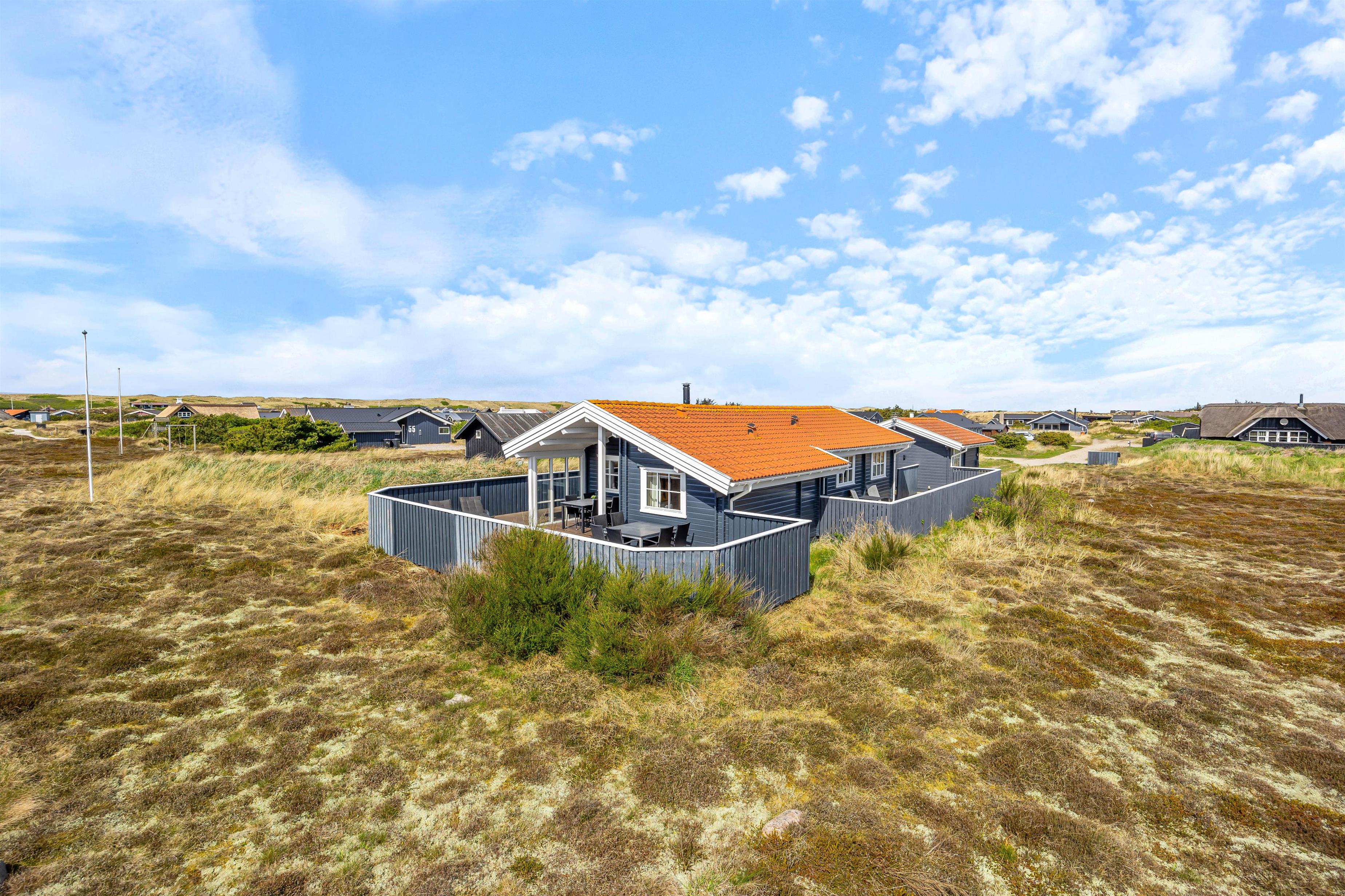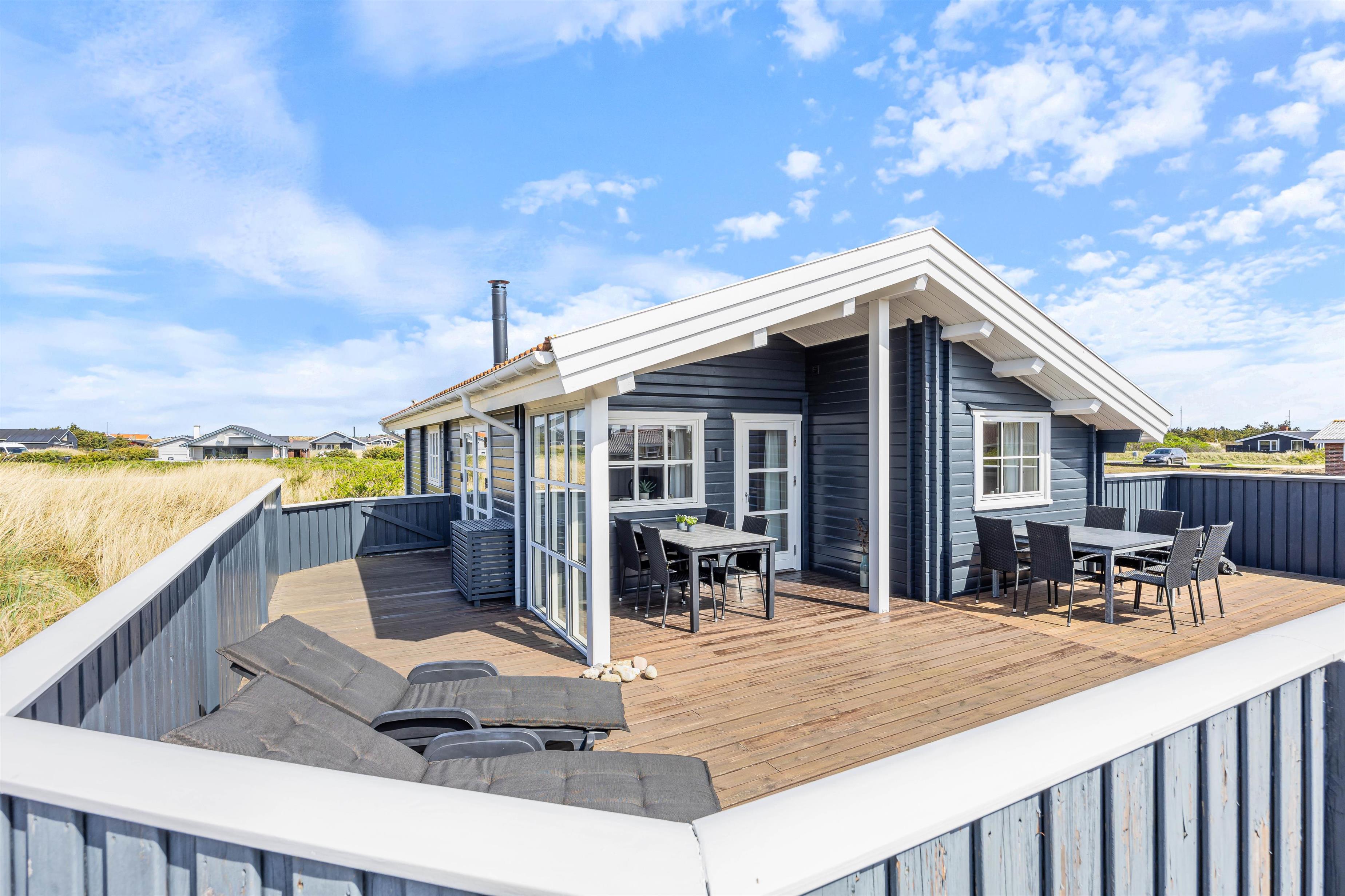 På en lyngklædt grund i Bjerregård står dette skønne feriehus og venter på jer. Træhuset udstråler ægte ferieidyl, og indenfor byder en venlig og indbydende indretning jer varmt velkommen i jeres feriehjem. De skønne, læfyldte terrasser giver jer mulighed for at nyde naturen helt tæt på, og kun 500 meter væk ligger det brusende Vesterhav.