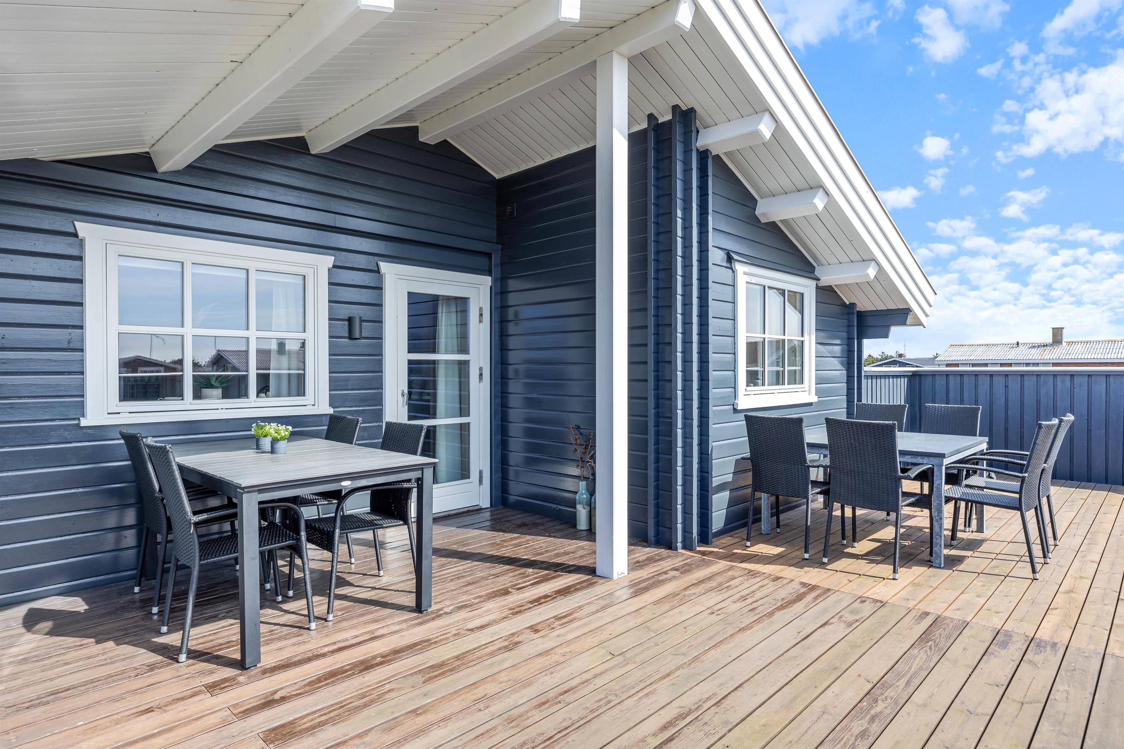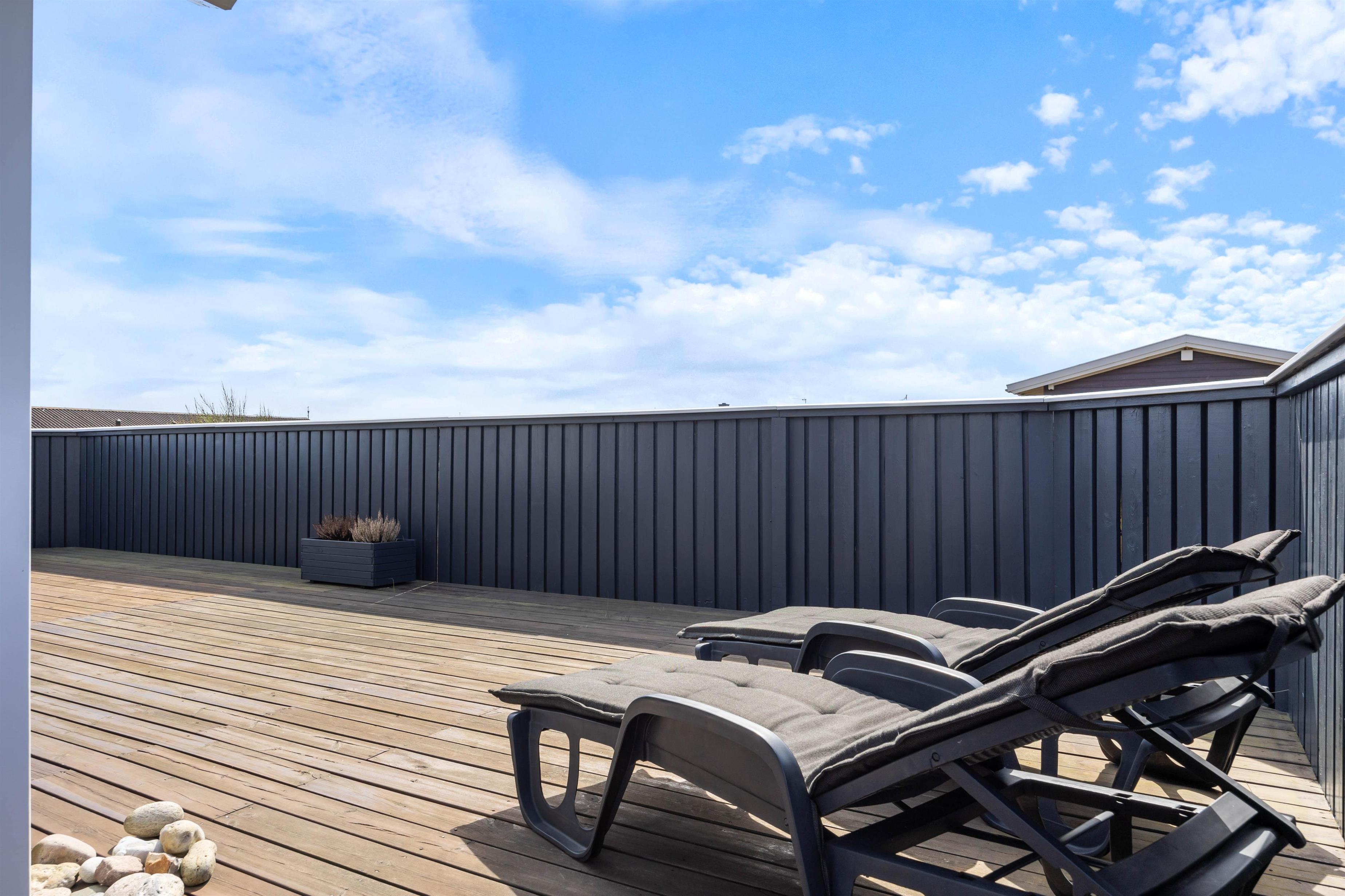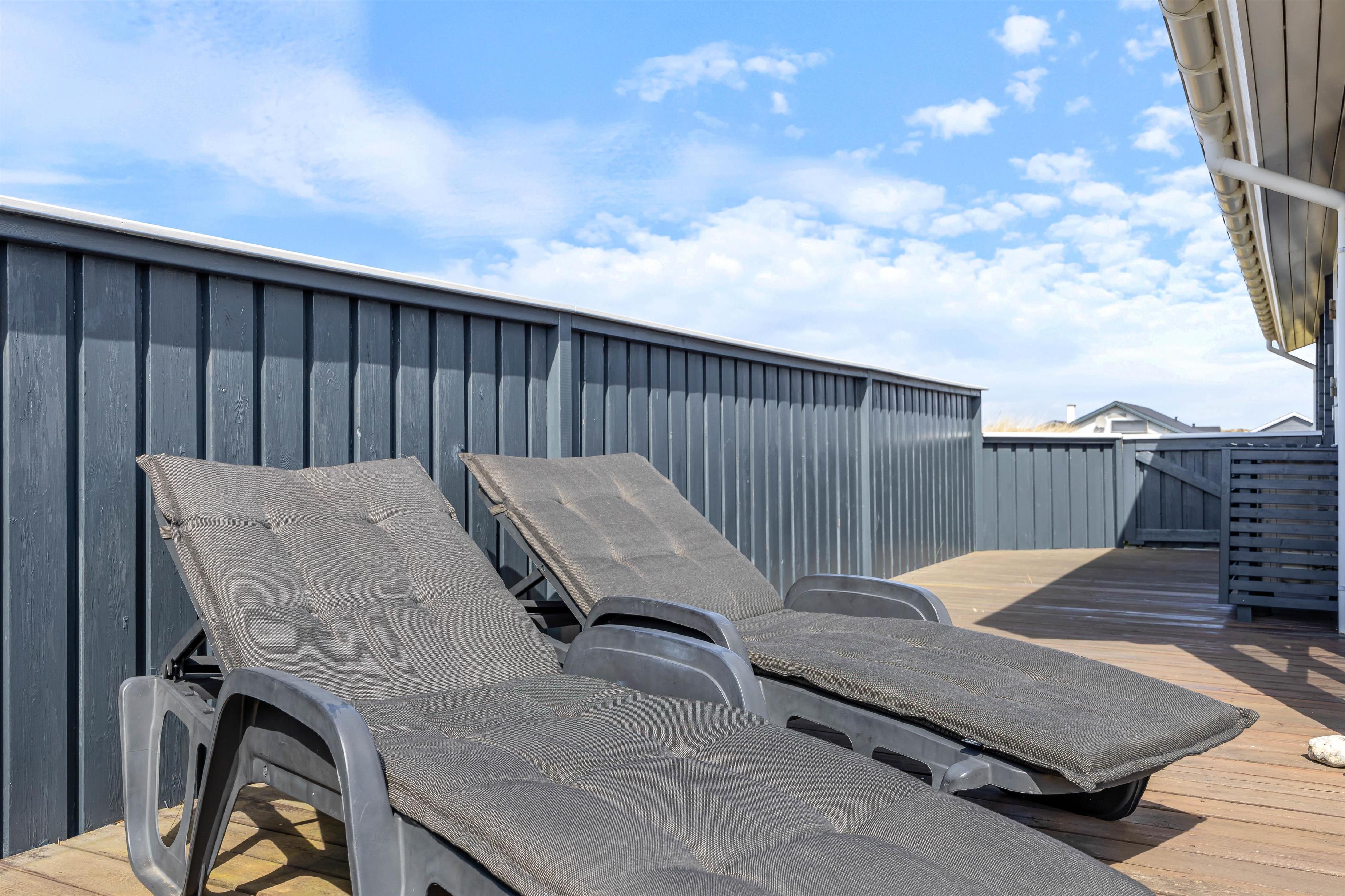 Udvendigt hører 2 skønne terrasser med, som begge er godt afskærmede og helt lukkede. Her kan I altid finde både sol og læ, og ligegyldigt hvad vejret melder, kan I nyde den friske luft fra havemøblerne uden problemer.