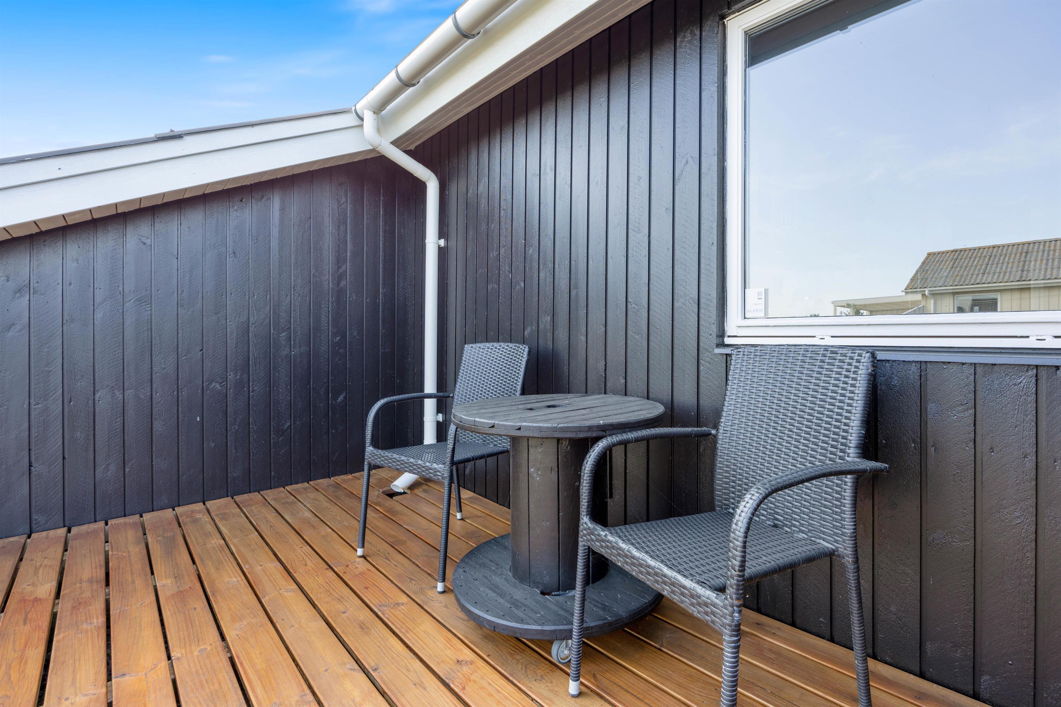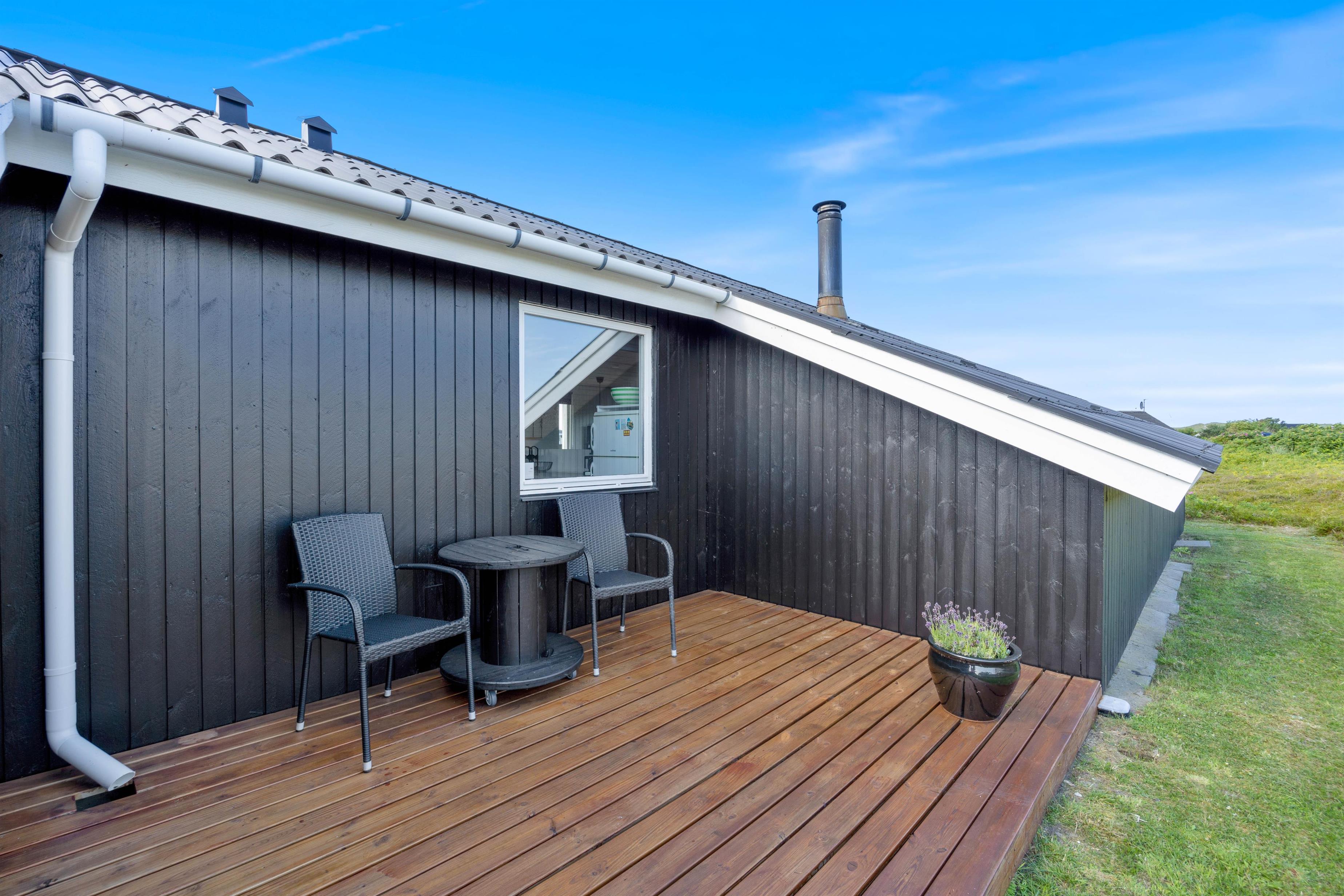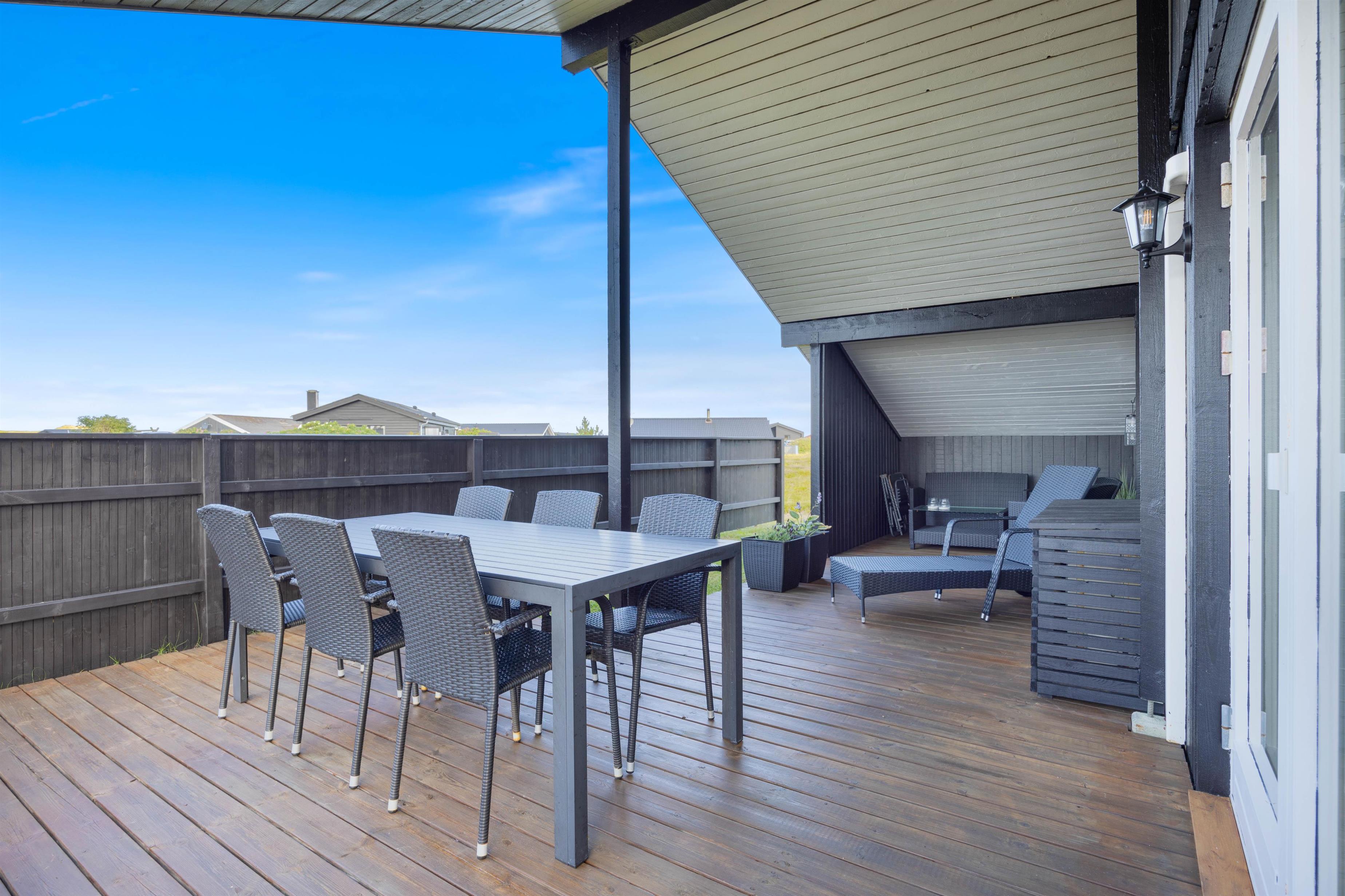 Der er flere gode siddepladser på terrassen, der strækker sig øst- til vestsiden af feriehuset.
