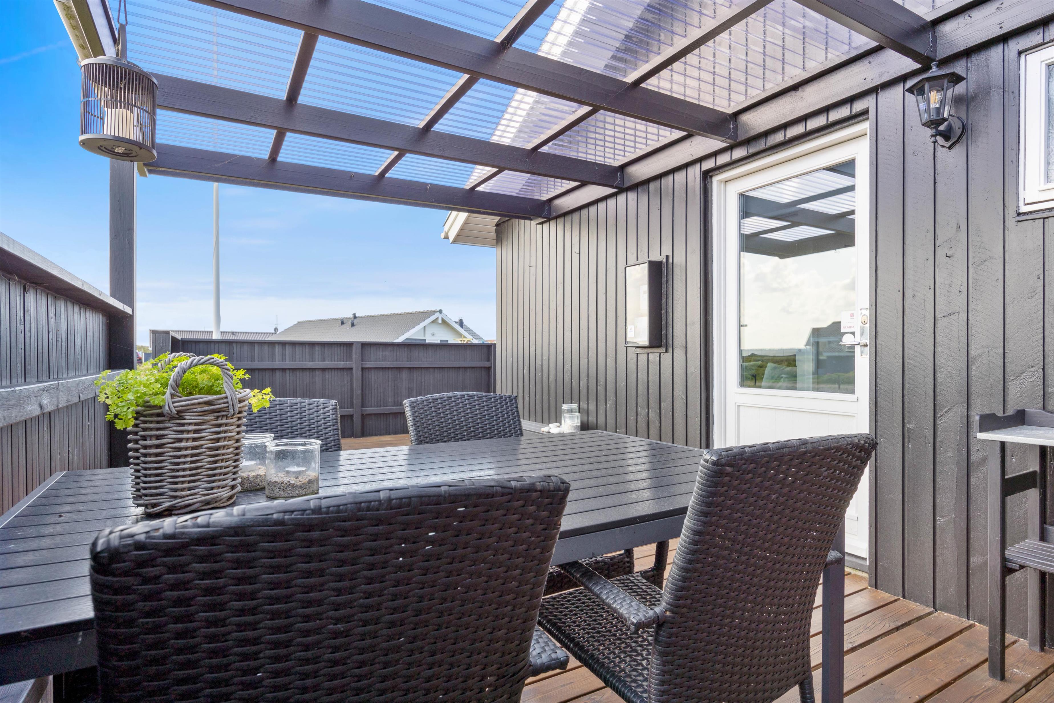 Sommerhuset har en god, stor terrasse, der er delvist overdækket og afskærmet. Her kan I nyde solen hele dagen og slutte af med en lækker grillmiddag med saftige bøffer fra grillen.