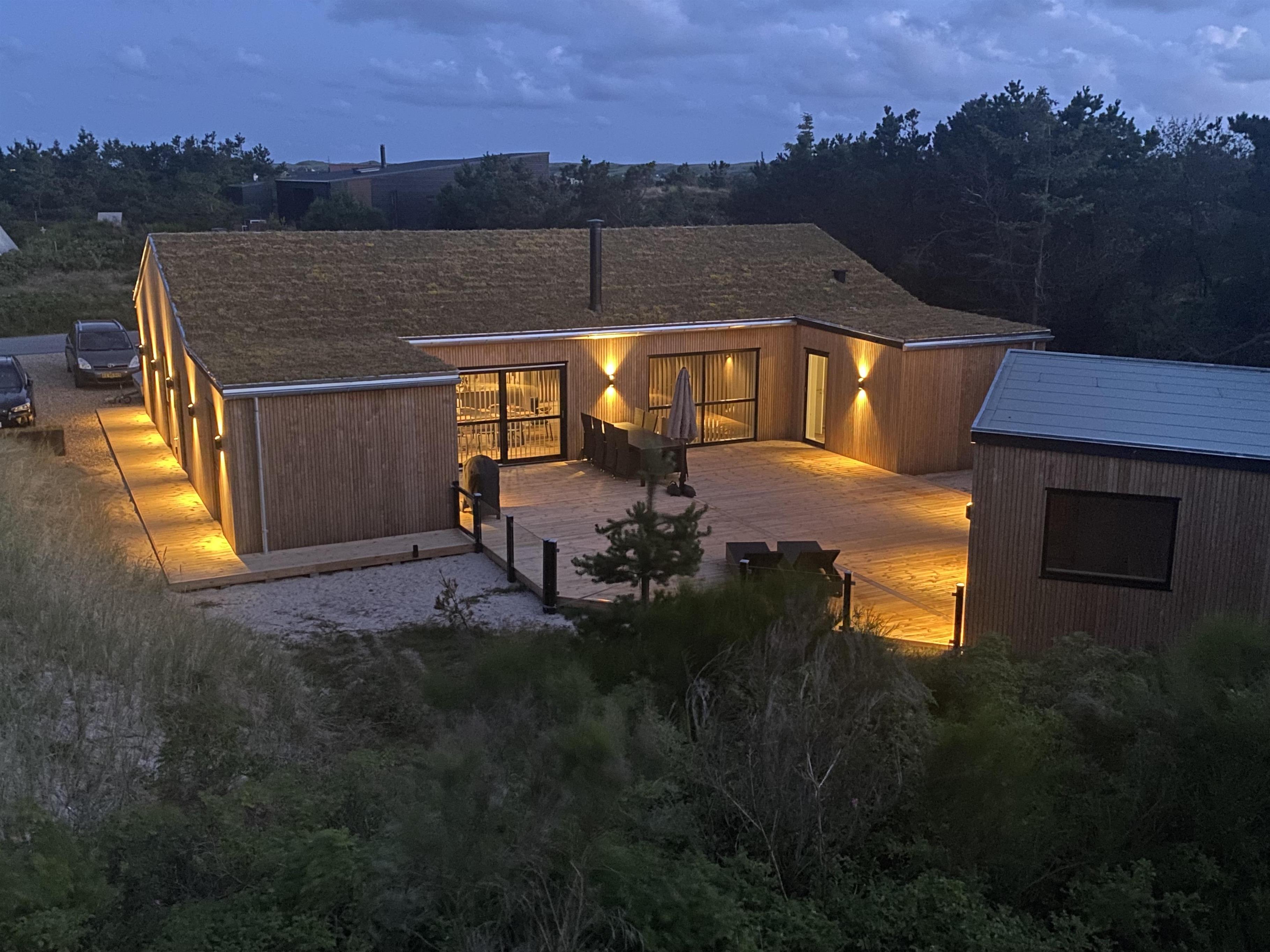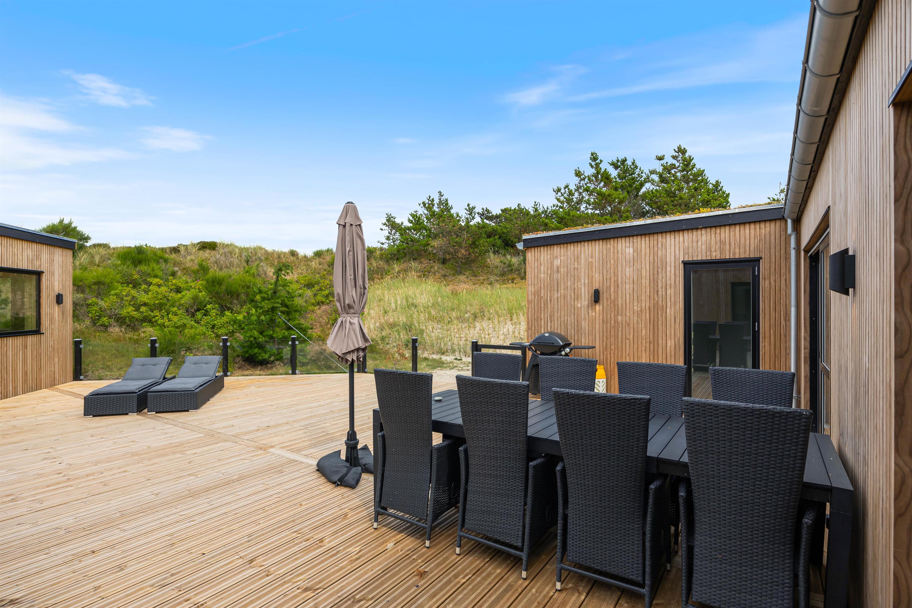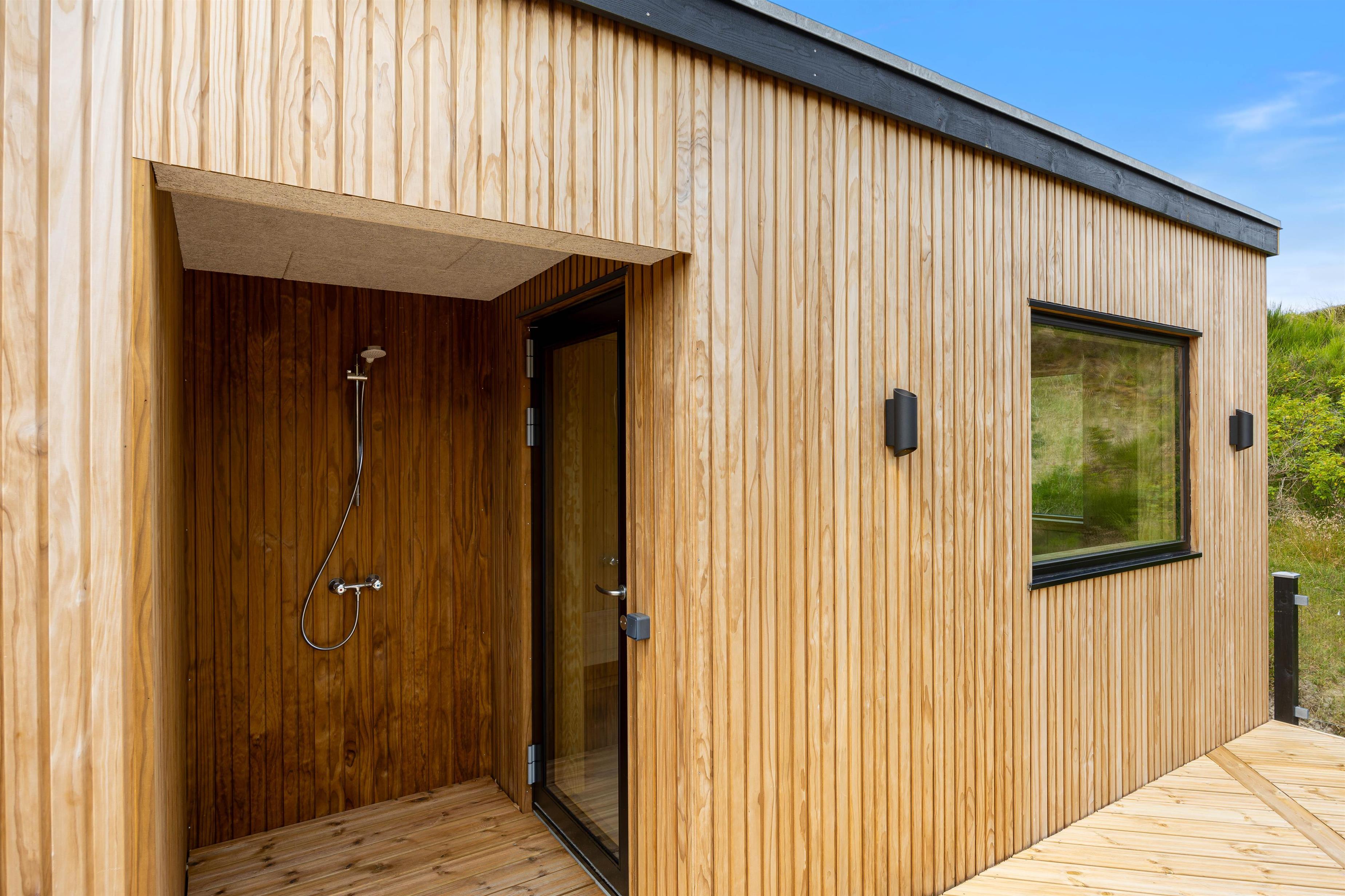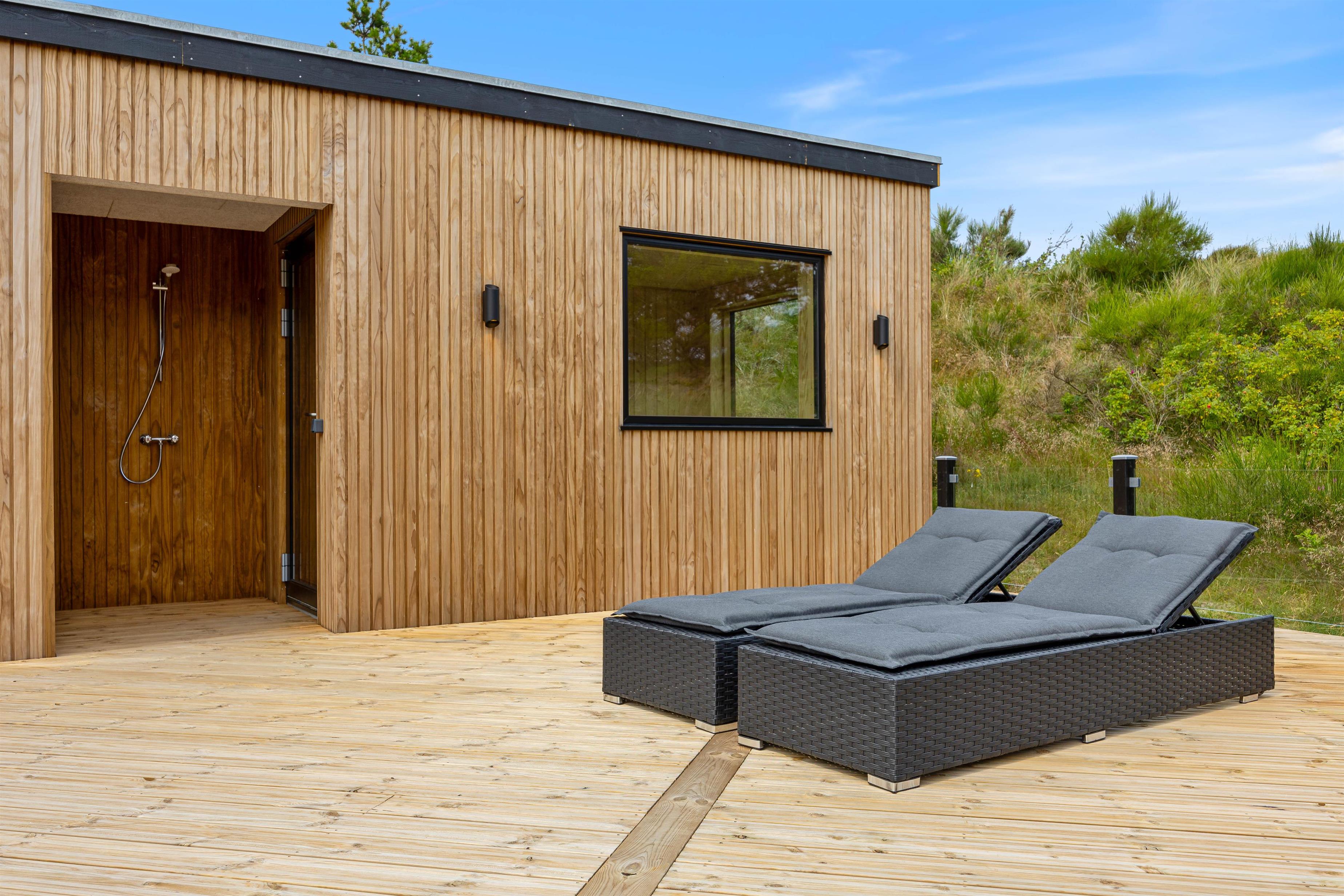 Til aften kan familiens grillmester fremtrylle lækkerier på gasgrillen. Nyd maden i dejligt selskab og fuldend aftenen med en gåtur langs vandet. Ved Vesterhavet kan I soppe i vandkanten og se solen male himlen rød. Når I kommer hjem, kan I undgå sand i stuen og skylle fødderne udenfor under udebruseren. Under udebruseren, som kan benyttes fra april til november, kan I også blive kølet ned om sommeren, efter at have siddet længe i udesaunaen. Bliv varmet rigtig godt i gennem og slap helt af, mens marehalmen vifter i vinden.