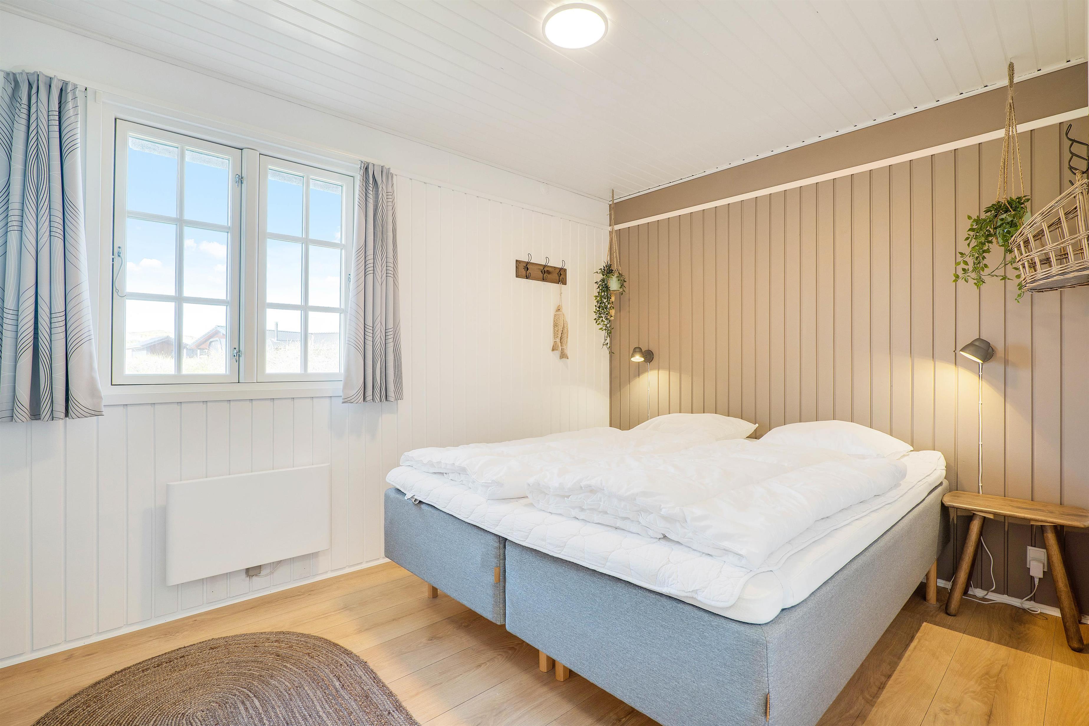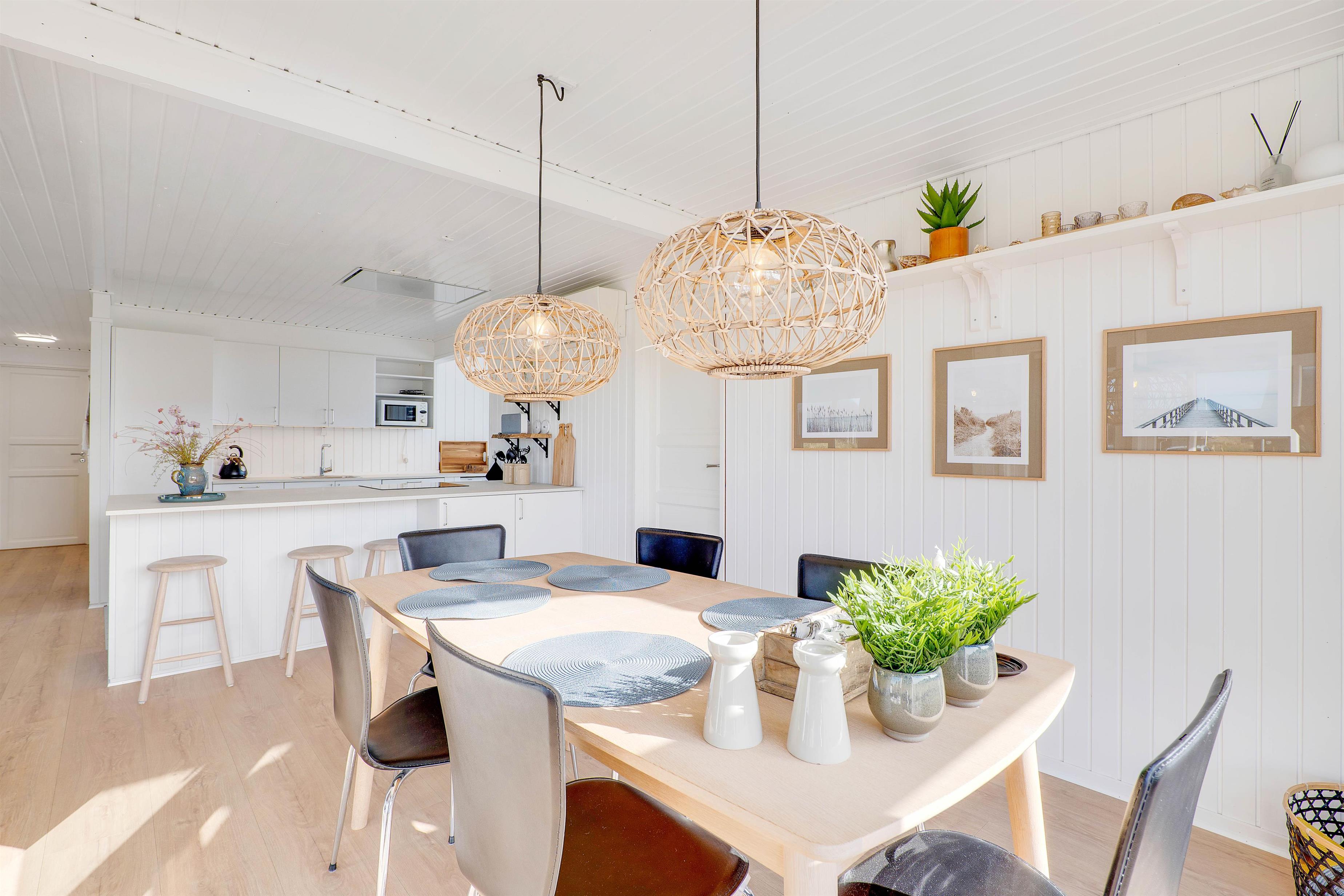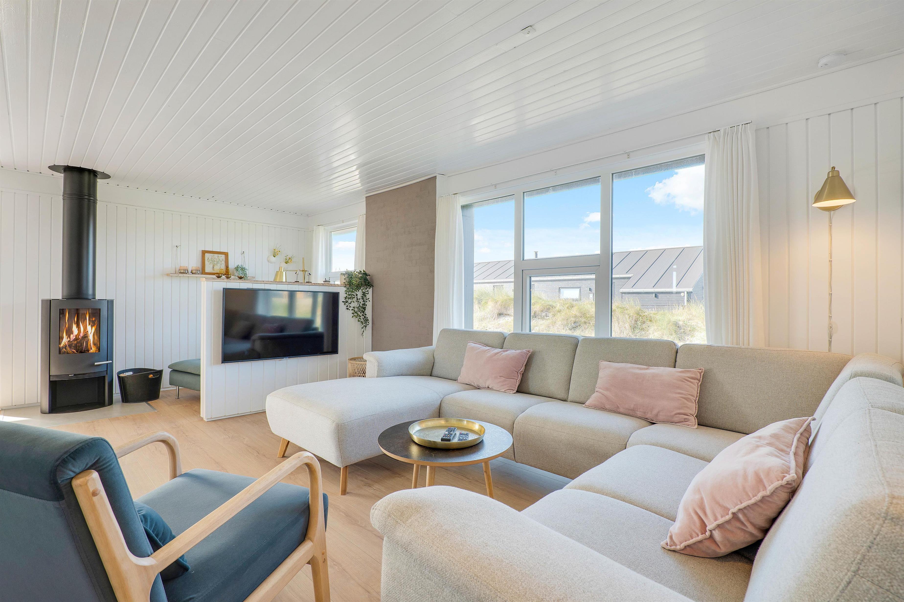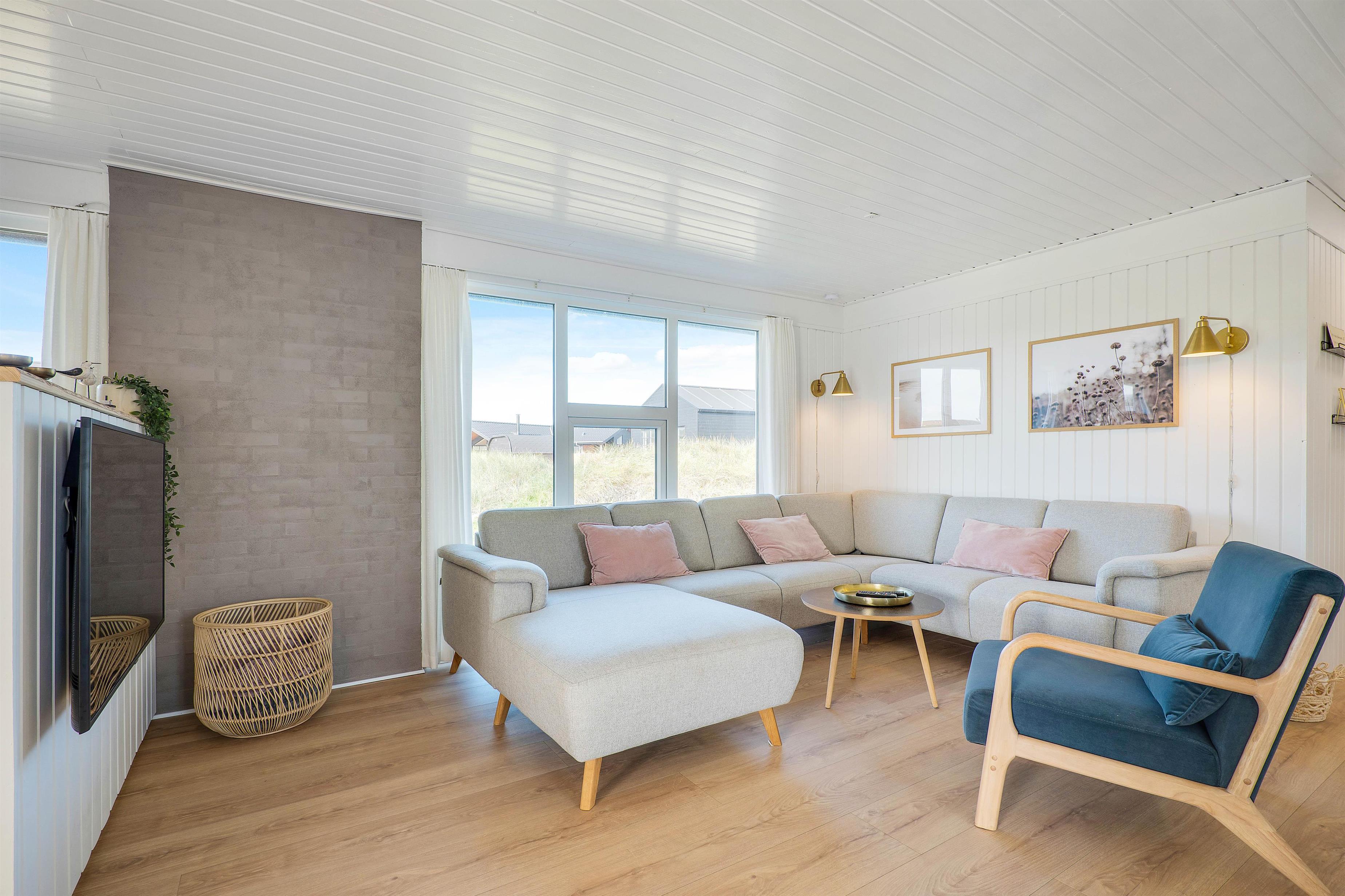 Her vil I hurtigt falde til i de indbydende omgivelser, hvor lyse farver og hyggeligt interiør fungerer som rød tråd i alle ferieboligens rum.