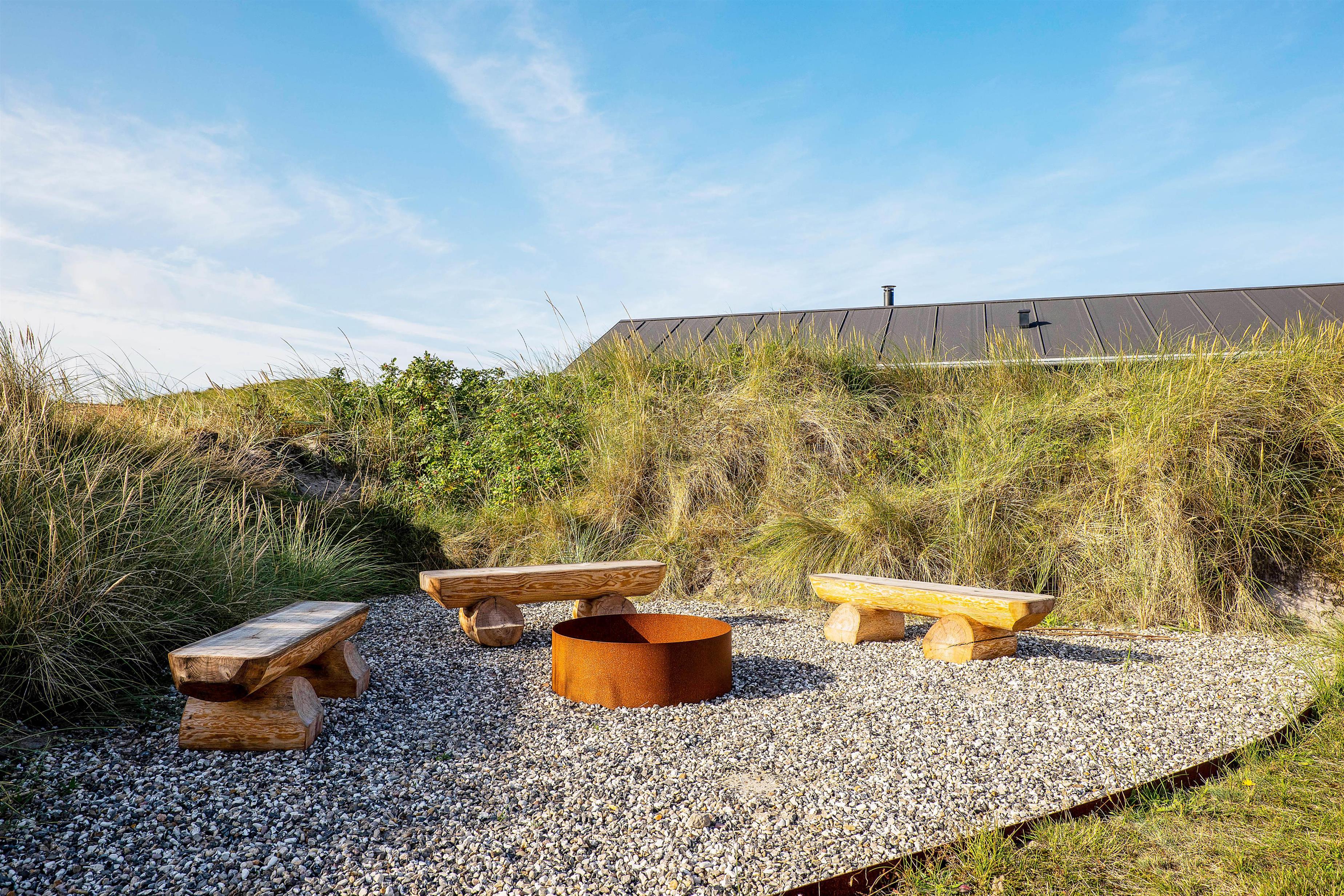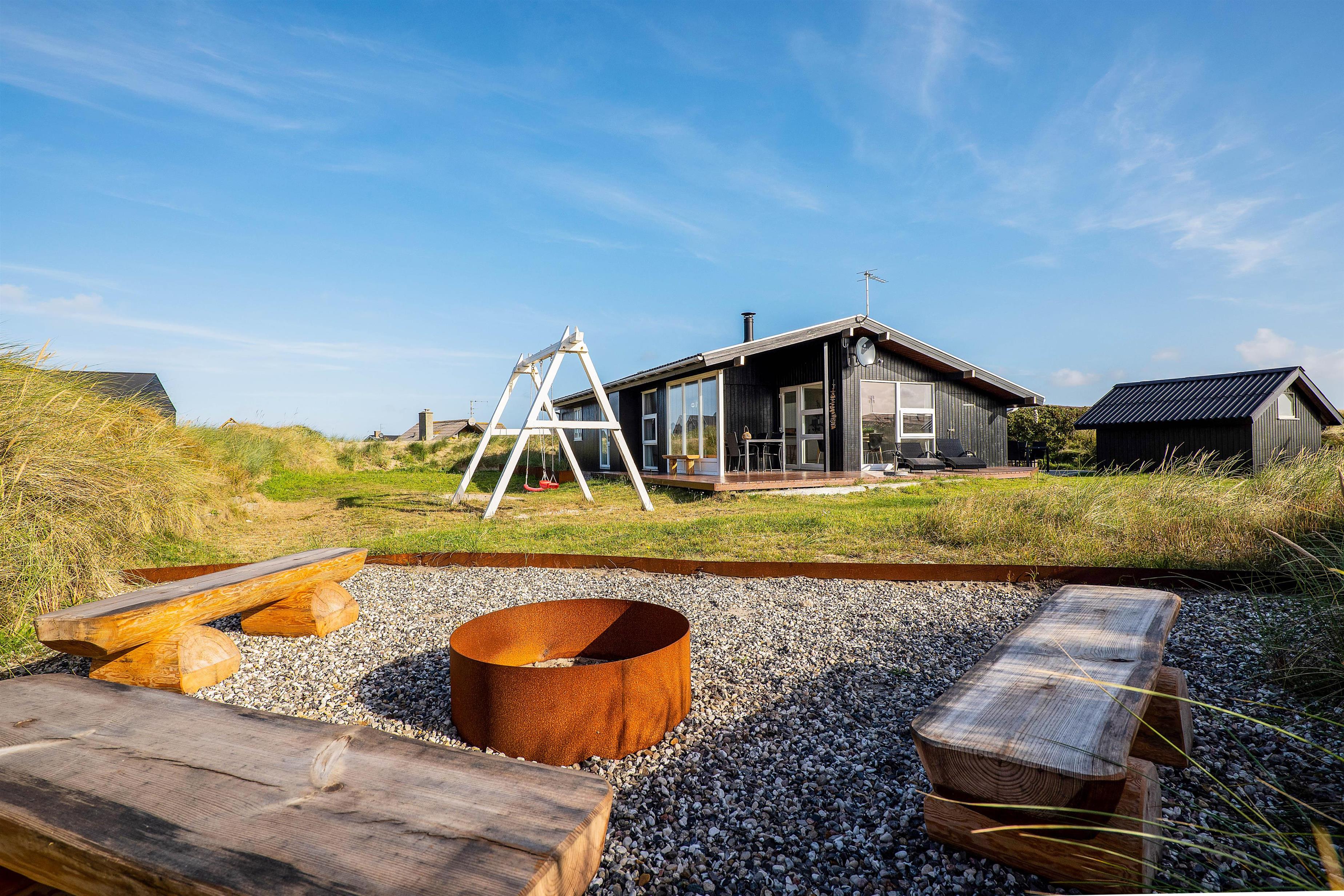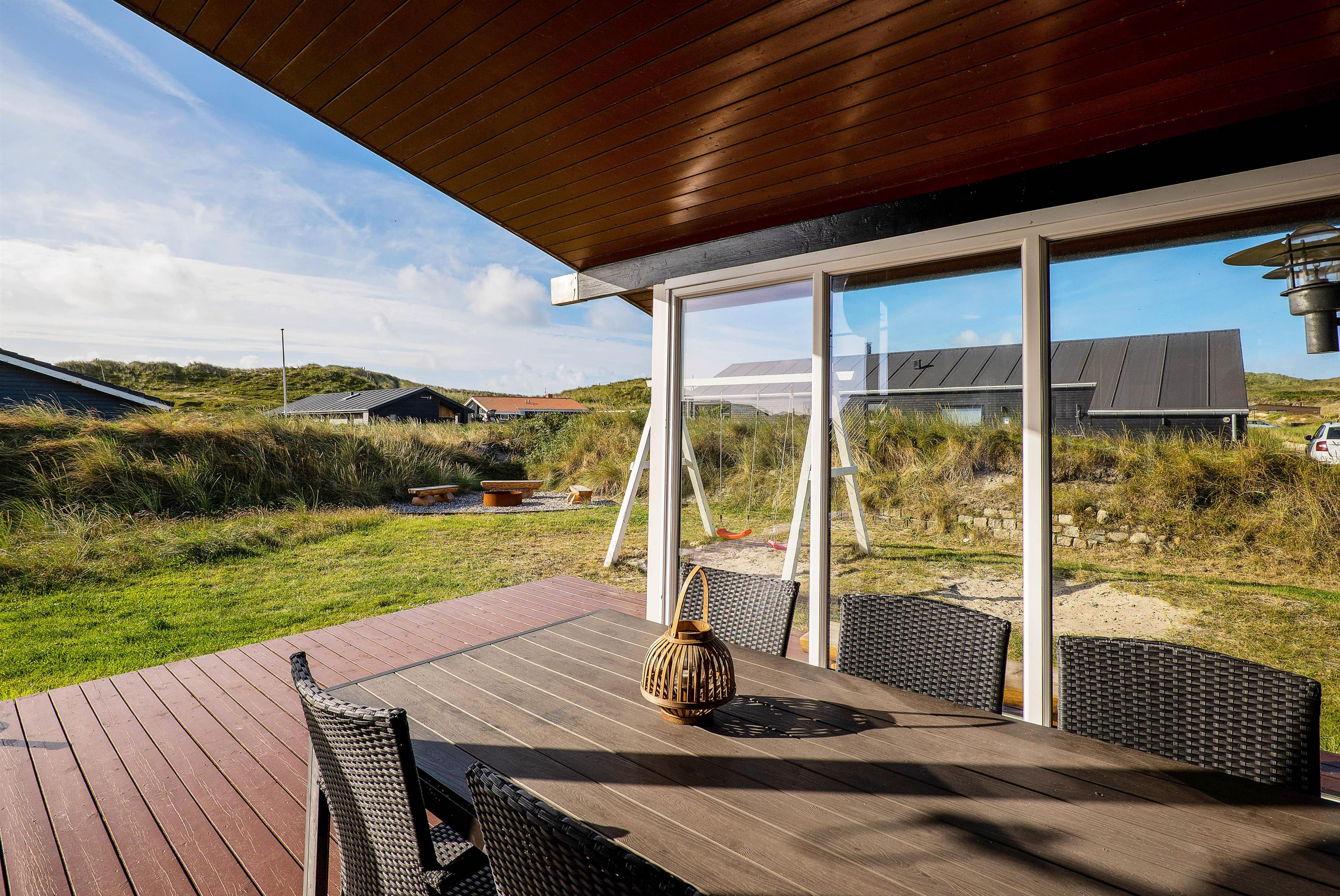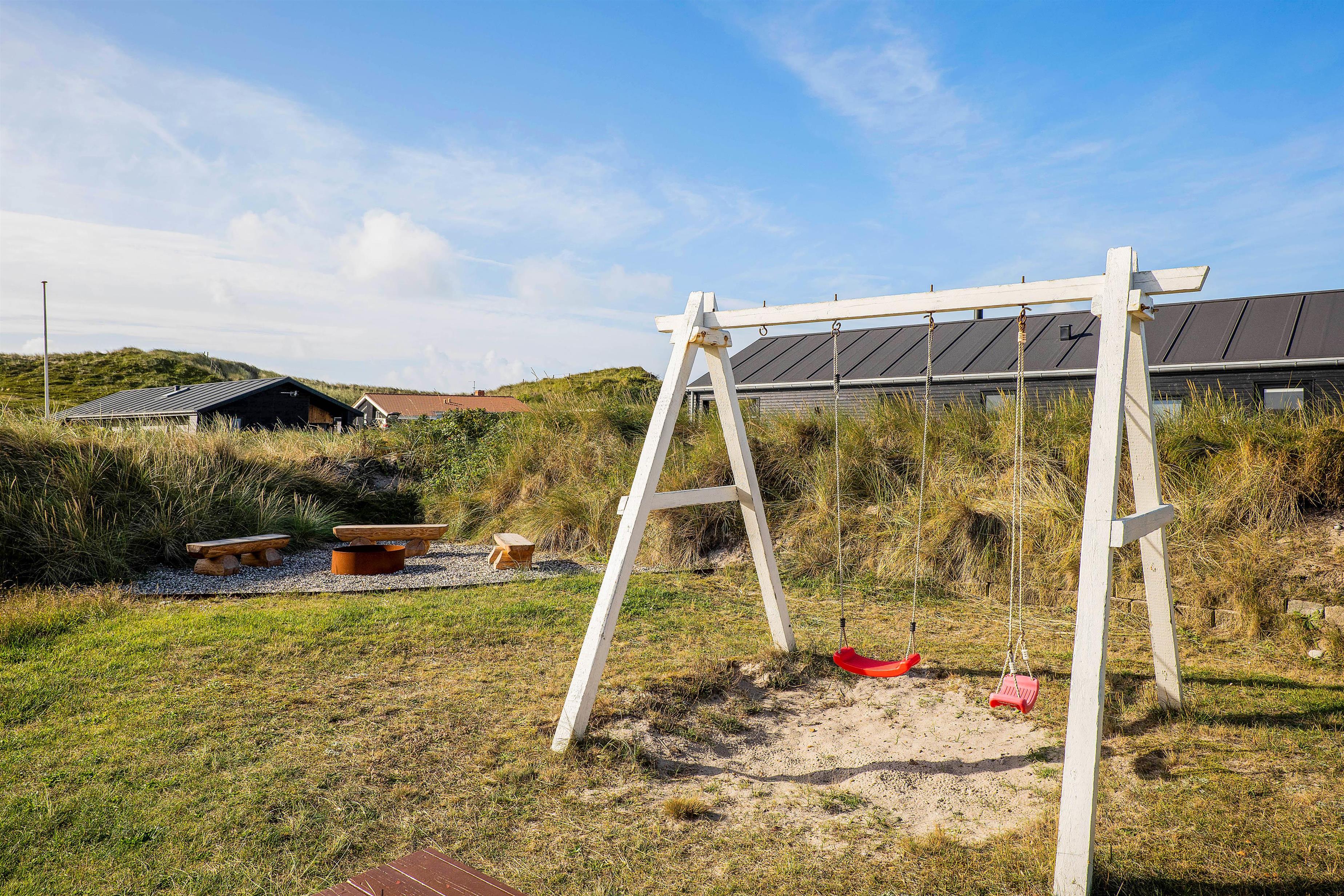 Sommerhuset er udstyret med 2 rigtig gode terrasser, den ene delvist overdækket, hvor I kan nyde solen og den skønne vestjyske natur. Der er selvfølgelig sørget for gode havemøbler, liggestole, strandstole og en god grill, så I rigtigt kan udnytte de solrige dage. Derudover er der et bålsted på naturgrunden, hvor I kan skrue op for lejrbåls-stemningen i den lune aftensol med snobrød og skumfiduser. Til de yngste feriegæster findes der både gynger og sandkasse.