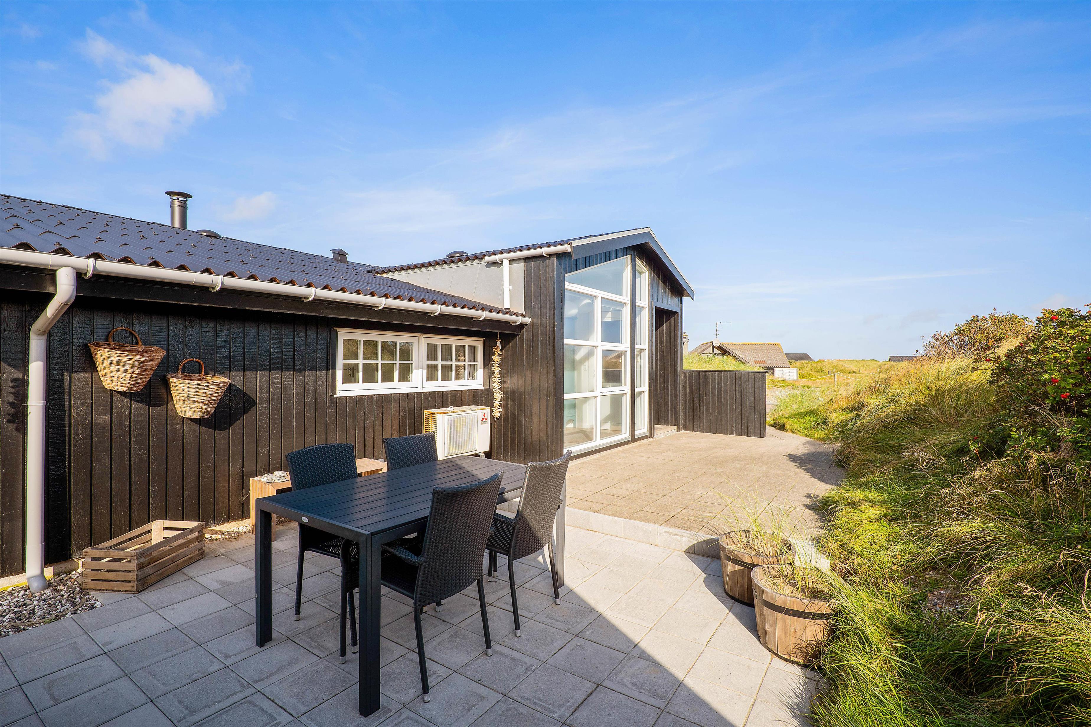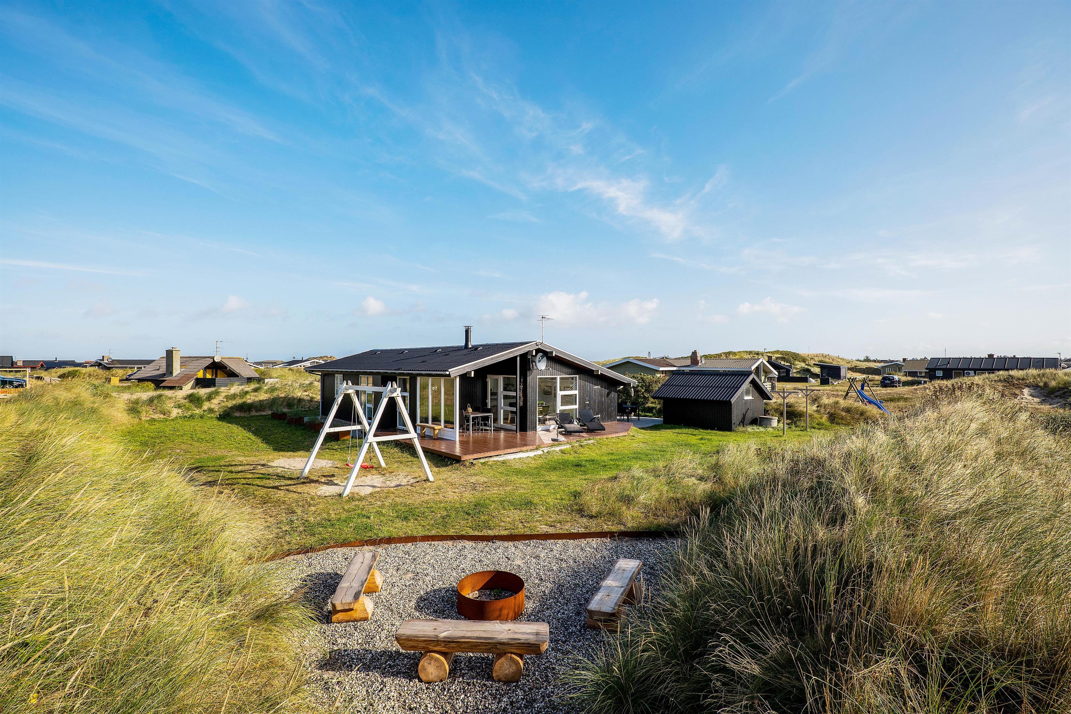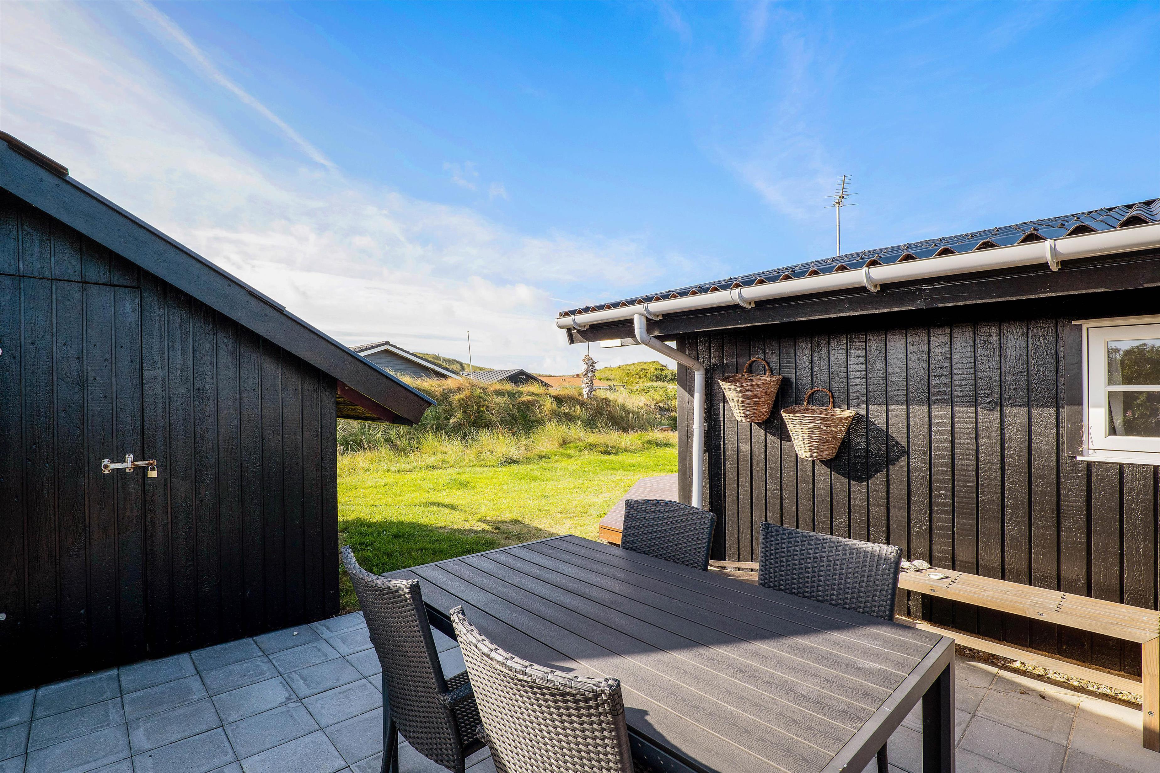 Sommerhuset er udstyret med 2 rigtig gode terrasser, den ene delvist overdækket, hvor I kan nyde solen og den skønne vestjyske natur. Der er selvfølgelig sørget for gode havemøbler, liggestole, strandstole og en god grill, så I rigtigt kan udnytte de solrige dage. Derudover er der et bålsted på naturgrunden, hvor I kan skrue op for lejrbåls-stemningen i den lune aftensol med snobrød og skumfiduser. Til de yngste feriegæster findes der både gynger og sandkasse.