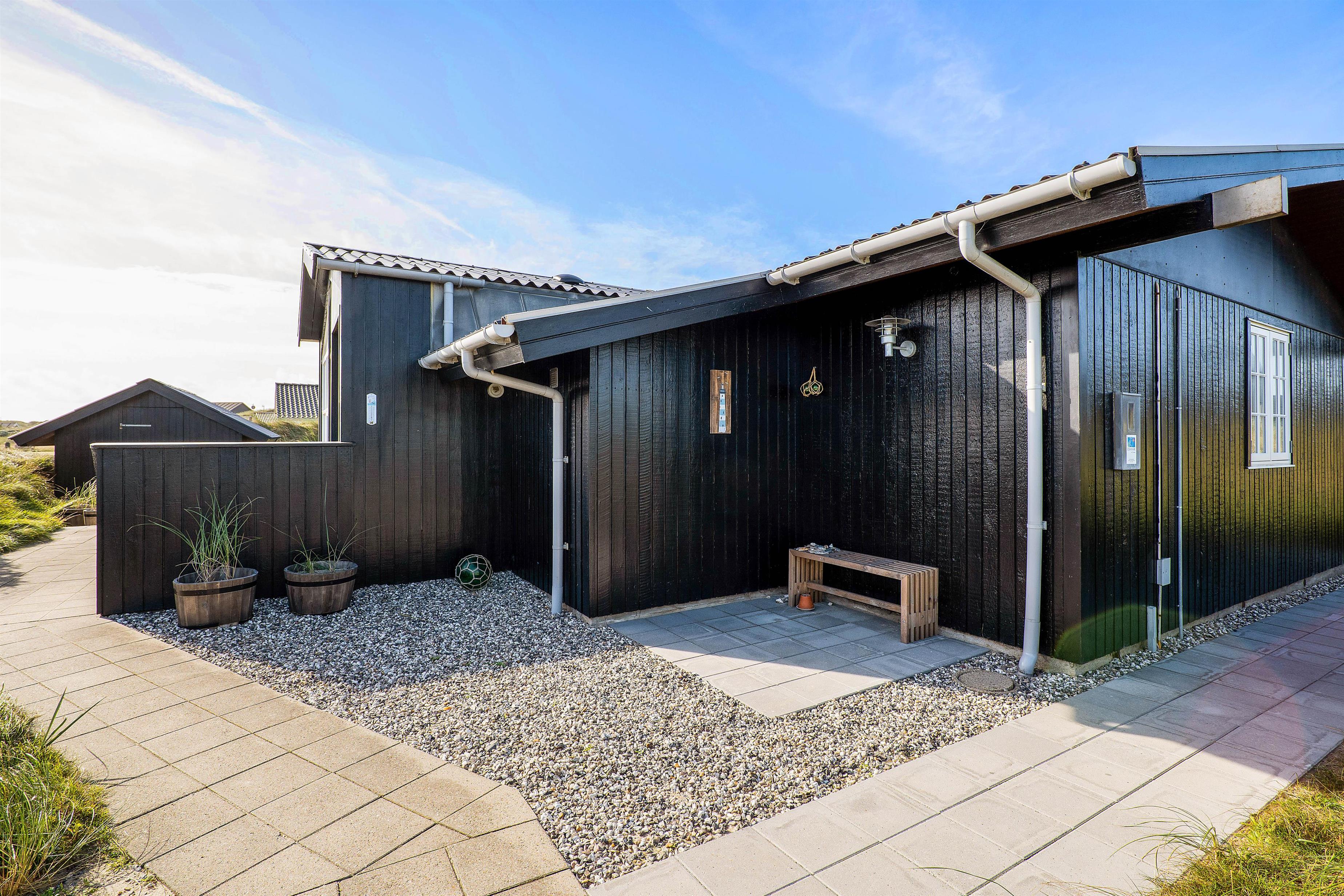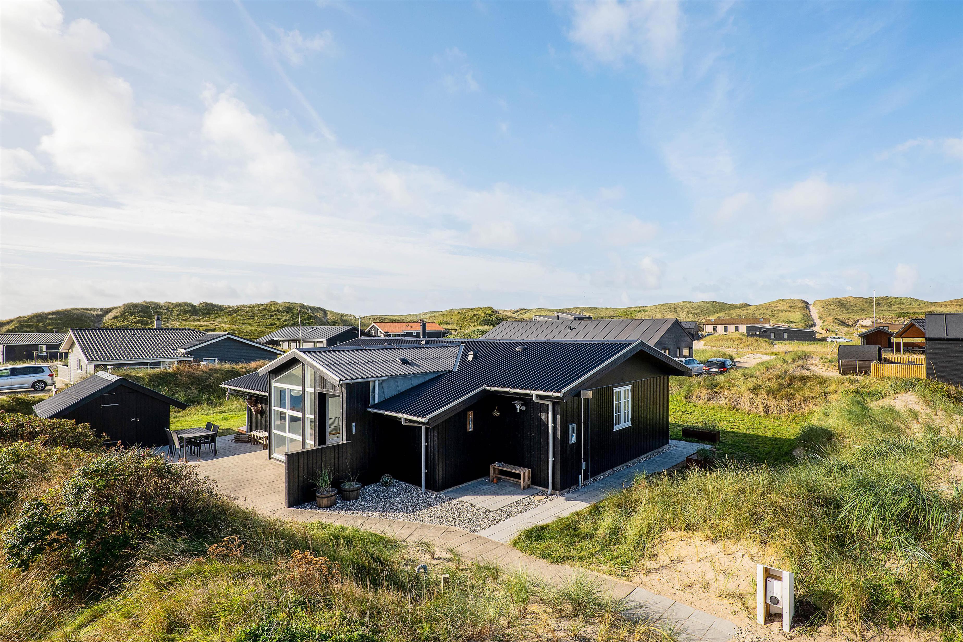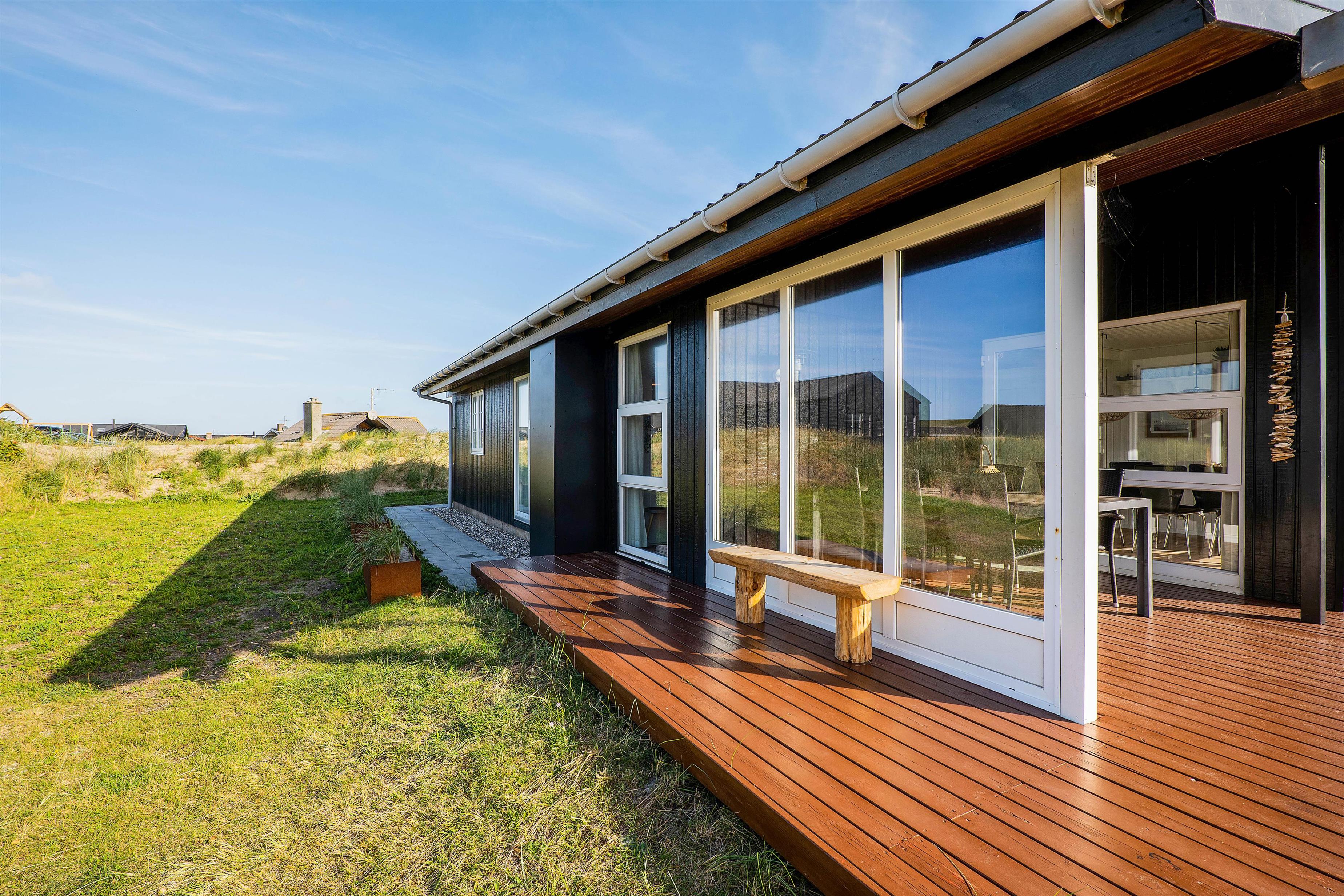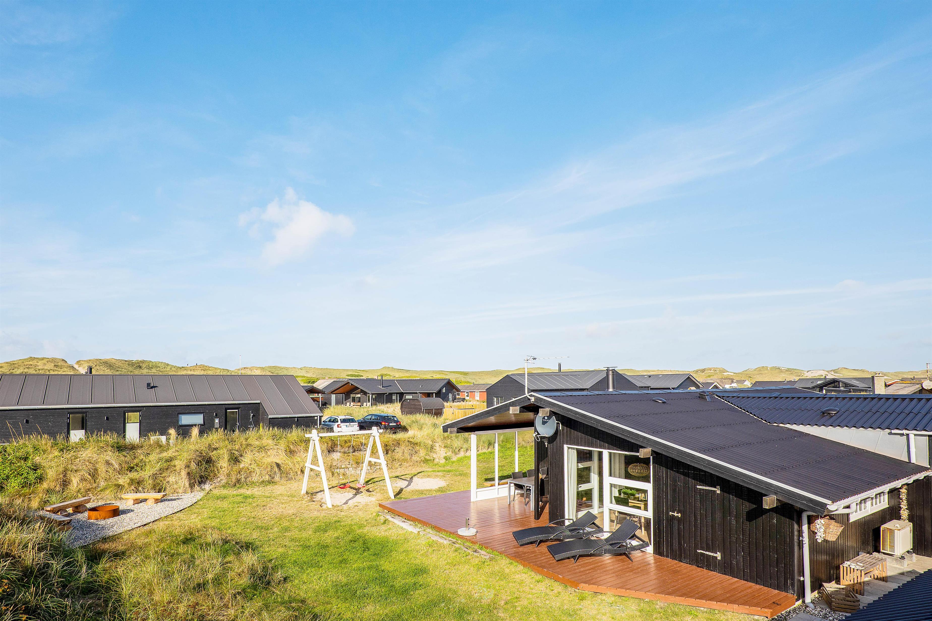 Sommerhuset er udstyret med 2 rigtig gode terrasser, den ene delvist overdækket, hvor I kan nyde solen og den skønne vestjyske natur. Der er selvfølgelig sørget for gode havemøbler, liggestole, strandstole og en god grill, så I rigtigt kan udnytte de solrige dage. Derudover er der et bålsted på naturgrunden, hvor I kan skrue op for lejrbåls-stemningen i den lune aftensol med snobrød og skumfiduser. Til de yngste feriegæster findes der både gynger og sandkasse.