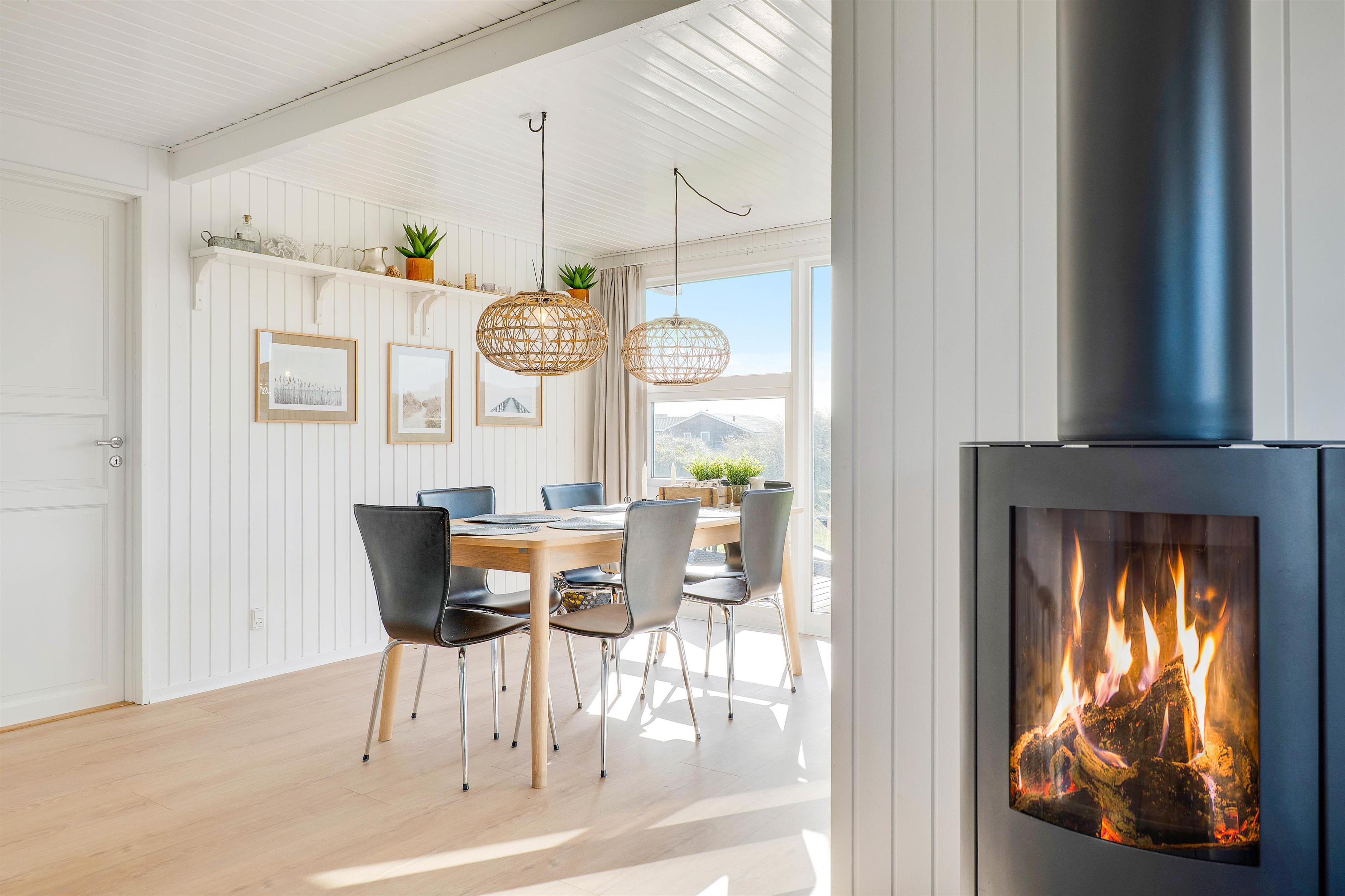 Fra entréen går man direkte ind i det veludstyrede køkken, der blandt andet er udstyret med et helt nye hårde hvidevarer. I skuret finder I desuden en ekstra 100 L fryser. Fra køkkenet kommer I videre til det flotte alrum, hvor brændeovnen spreder varme og hygge. Der er både smart TV, Chromecast og en musikafspiller med bluetooth, så I har masser af underholdningsmuligheder på ferien.