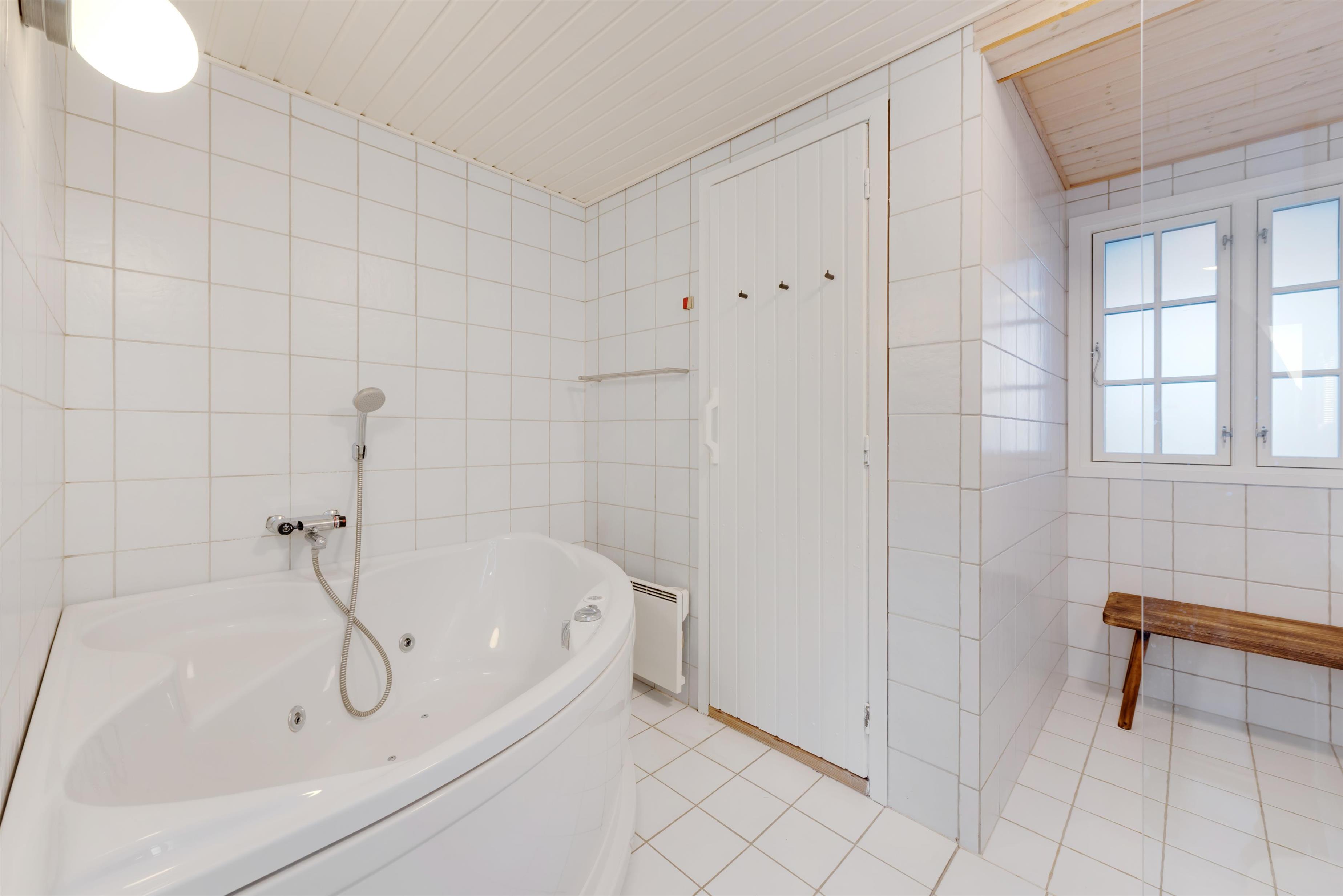 Feriehuset har plads til 6 personer i 3 bekvemme soverum. I det store badeværelse finder I både et afstressende spabad og en dejlig sauna, hvor I kan få varmen efter en forfriskende gåtur i den salte havluft.
