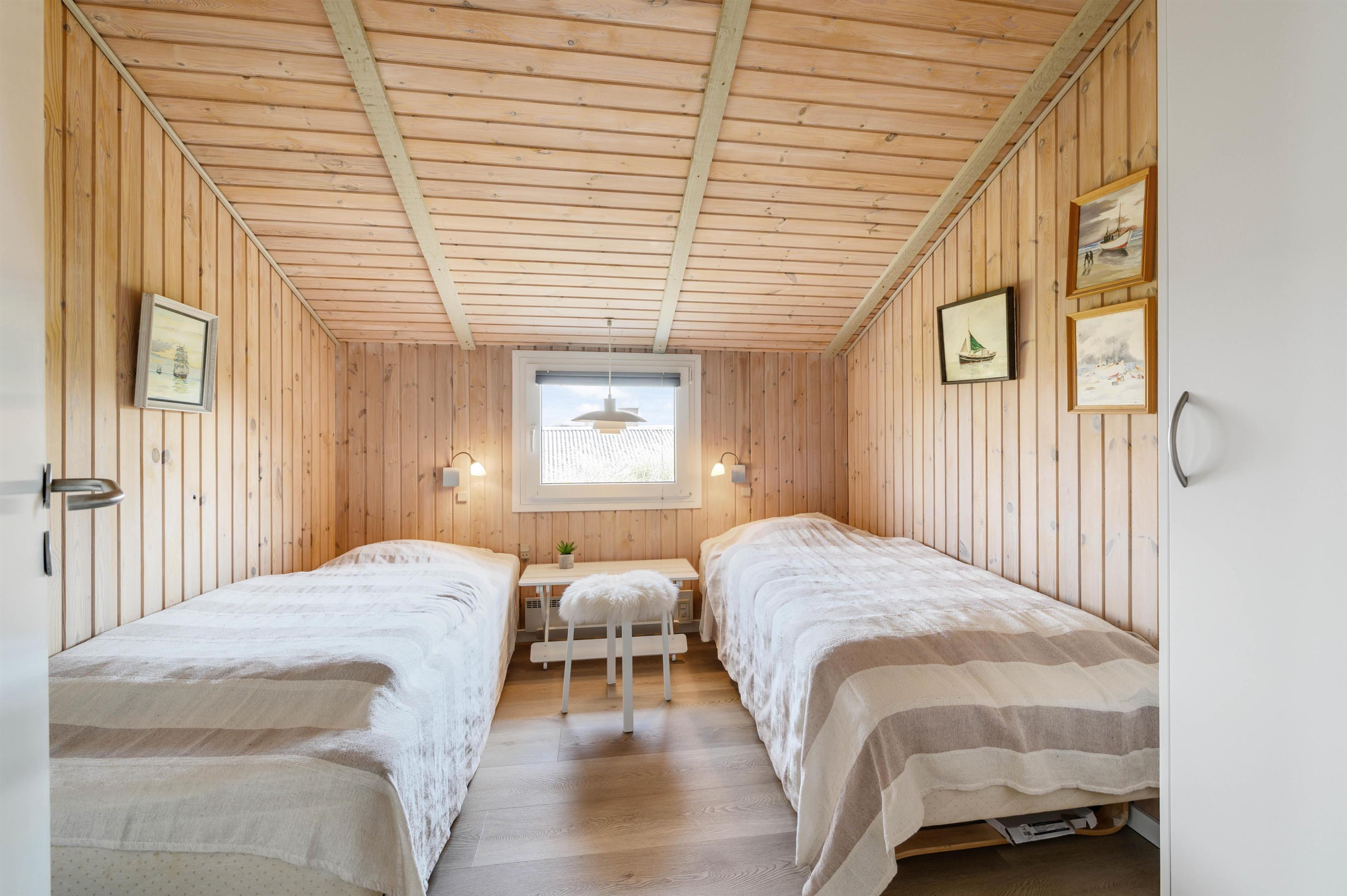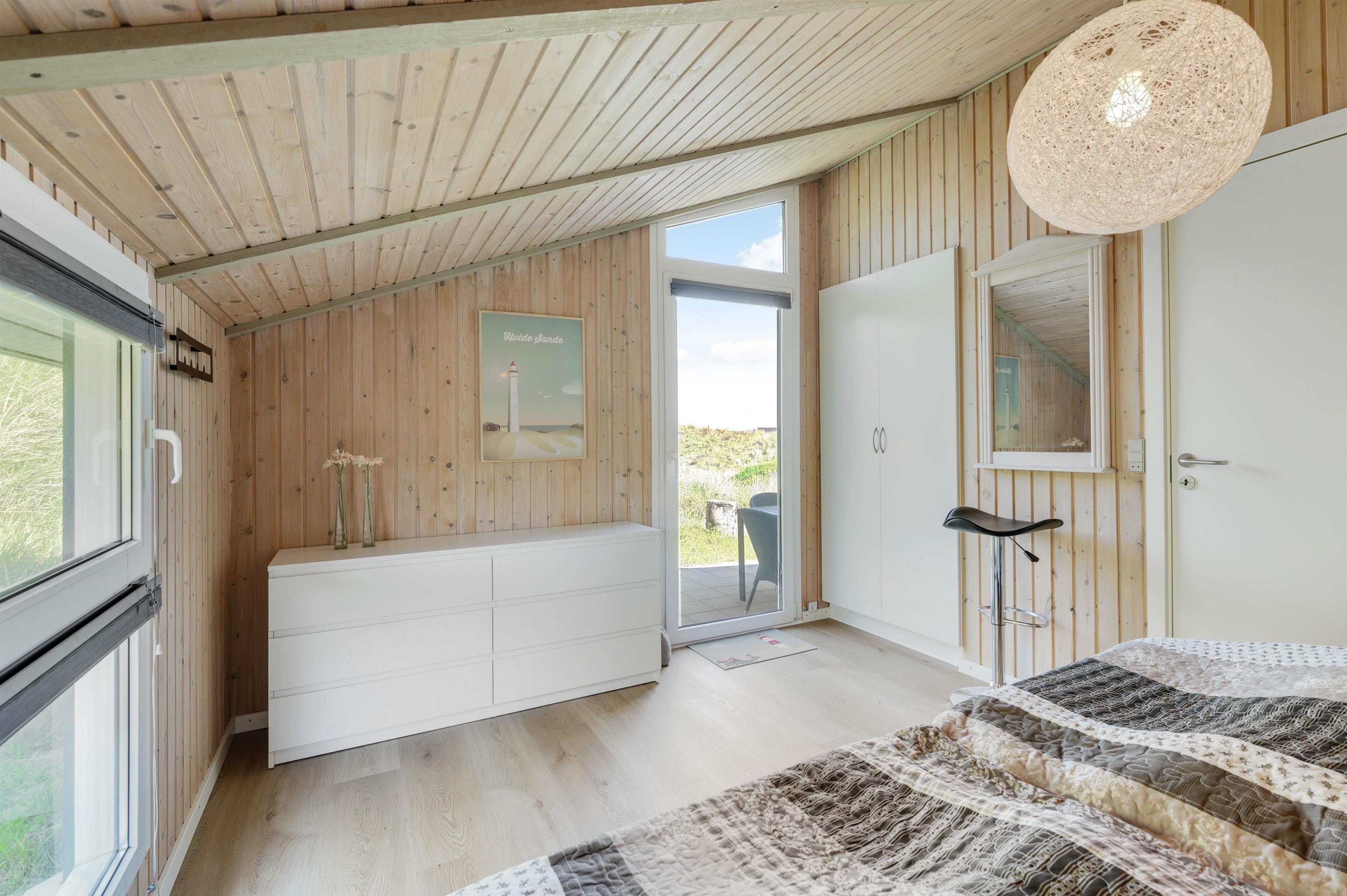 De 8 sovepladser er fordelt i 4 soverum, hvoraf 2 soveværelser har egen udgang til terrassen mod nord. Alle værelserne ligger i forbindelse med det velindrettede og praktiske badeværelse, hvorfra der er indgang til saunaen.
