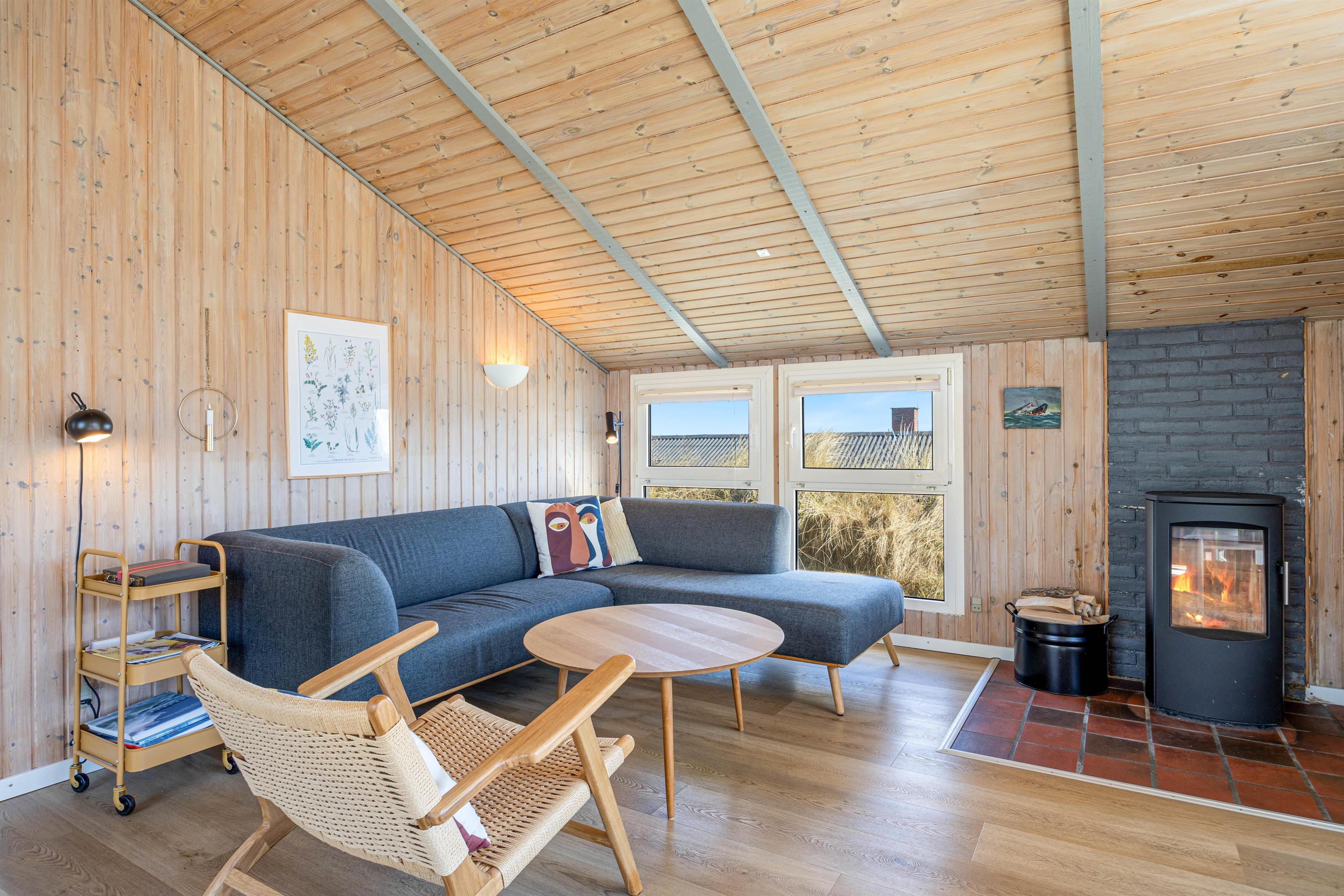 Hyggelig indretning med brændeovn og panoramavinduer