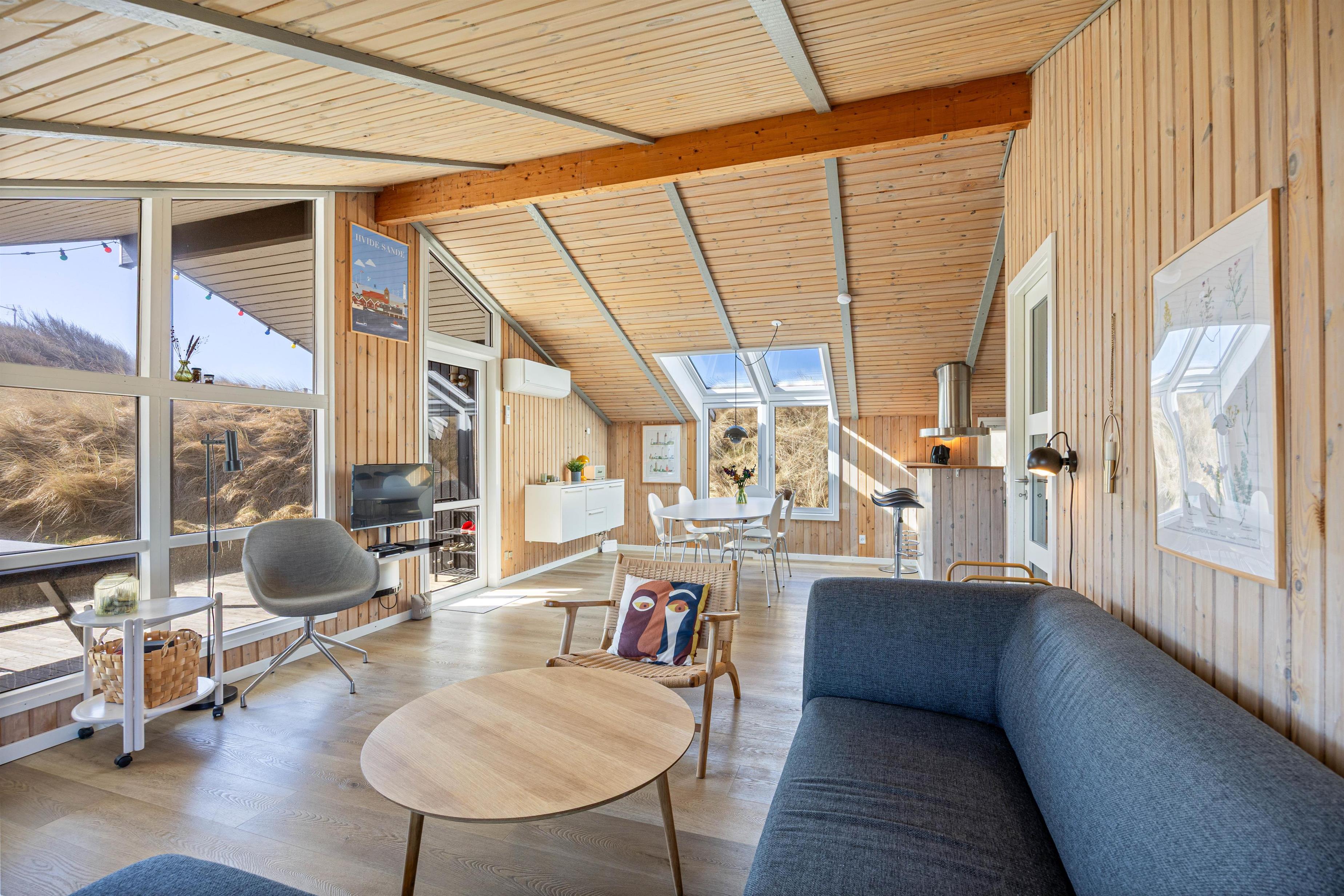Sommerhuset er praktisk og lyst indrettet med et stort opholdsrum med køkkenafdeling, spisestue og stue i ét. Dette er absolut husets hjerte og naturlige samlingspunkt. Her kan alle være med i fællesskabet, også selvom du står for maden.