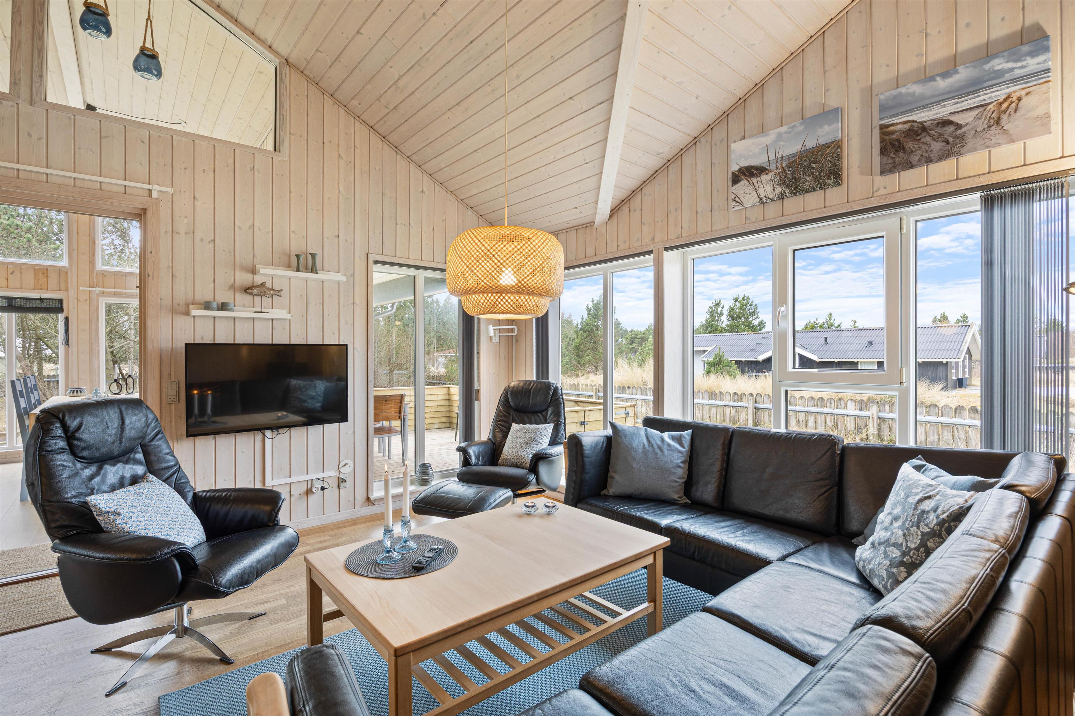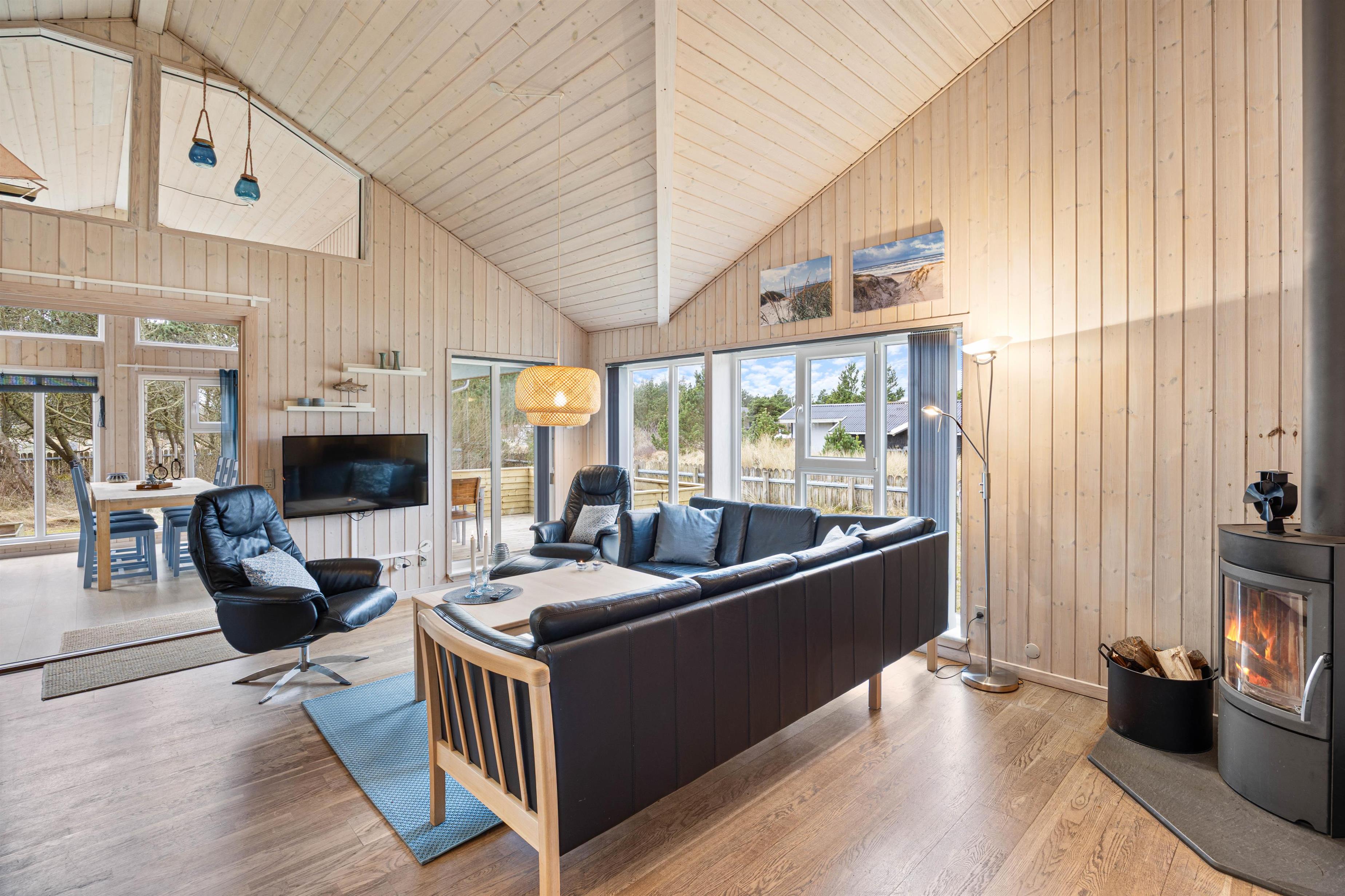 På Bjerregårdsvej 21 venter jer et dejligt sommerhus med plads til 6 gæster. Tag også gerne hundene med - De er velkomne her. Sommerhuset er hyggeligt indrettet med lyse trævægge, komfortable møbler og med højt til loftet, hvilket, sammen med de store vinduer, skaber en luftig fornemmelse og lukker det helt specielle lys ind. En varmepumpe sørger for et behageligt indeklima sammen med den hyggelige brændeovn.