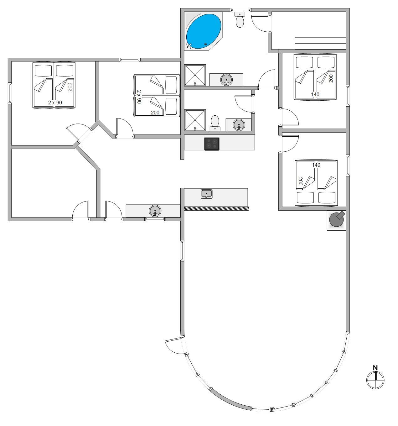 Sommerhuset i Bjerregård byder på en rummelig oplevelse med plads til hele 8 personer. Sommerhuset har 4 soveværelser: 2 med dobbeltsenge på 140×200 cm og 2 med to enkeltsenge (90×200 cm) sat sammen som dobbeltsenge. Det giver rig mulighed for en komfortabel nattesøvn efter en dag fyldt med oplevelser.