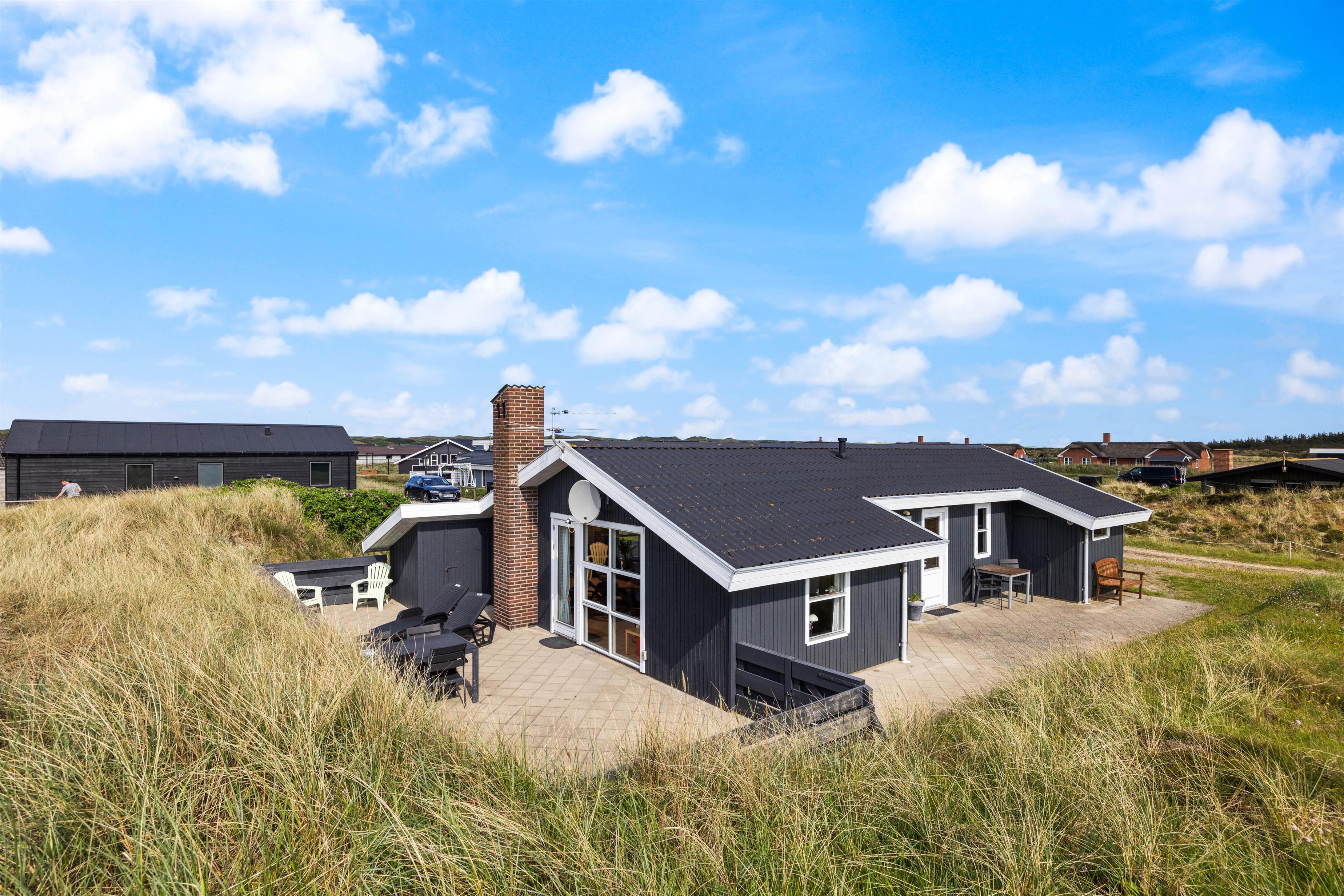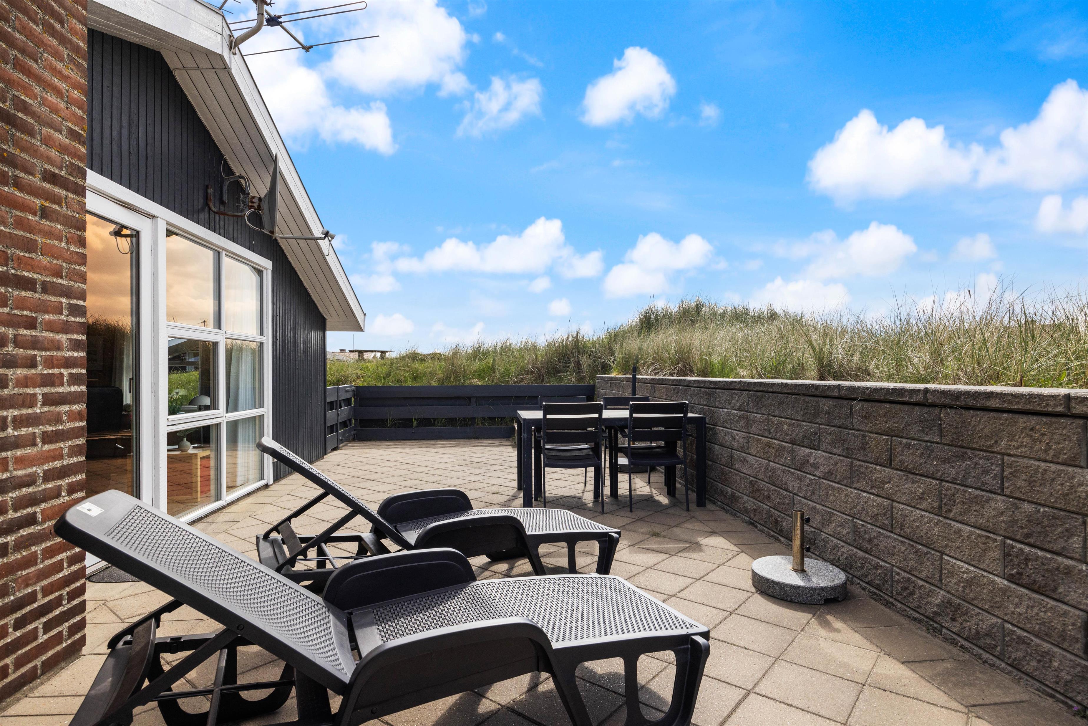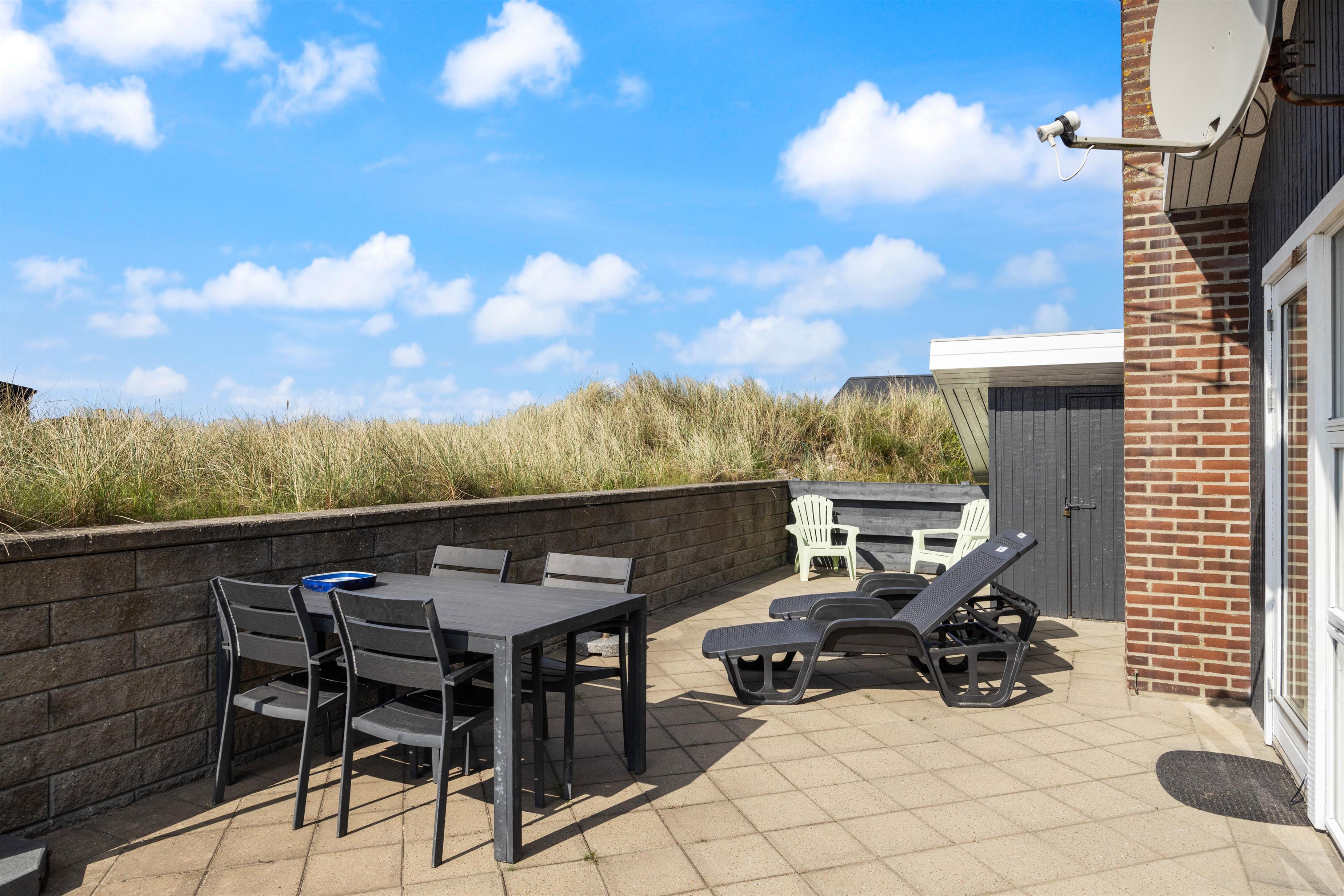 Fra feriehusets hyggelige stue er der udgang til en skøn sydvendt terrasse, som er naturligt afskærmet og lukket, så du uforstyrret kan nyde livet. Feriehuset har også en fin lille terrasse mod øst – perfekt til morgenkaffen og i ly for vestenvinden. Terrassen er udstyret med havemøbler, liggestole og grill. For de mindste er der opstillet gynge og sandkasse.