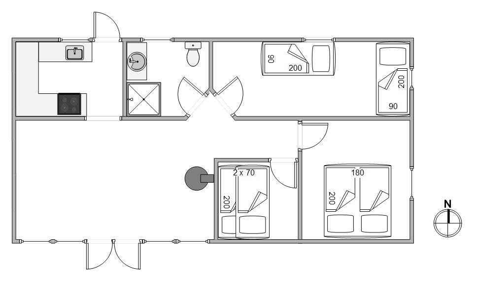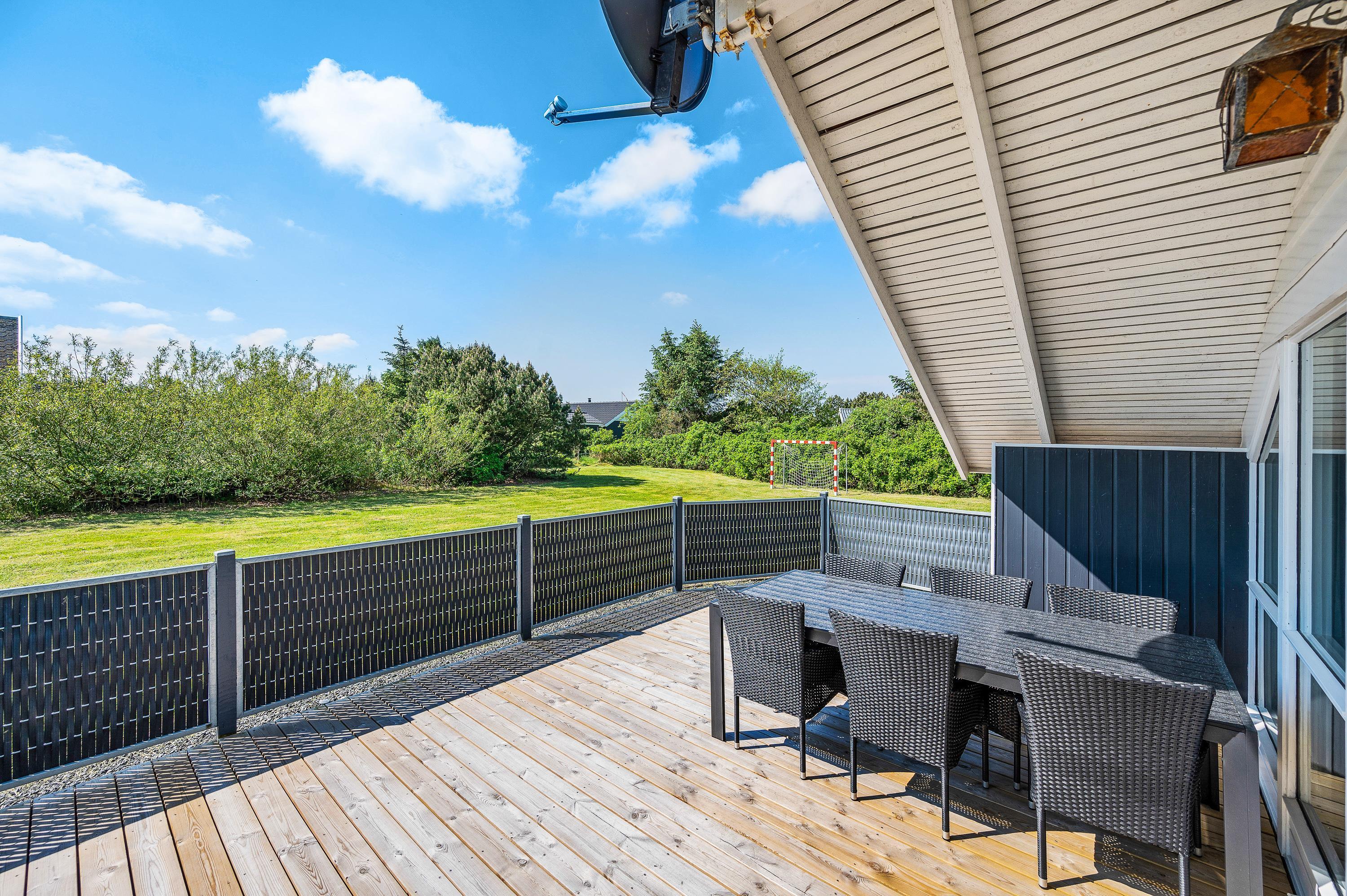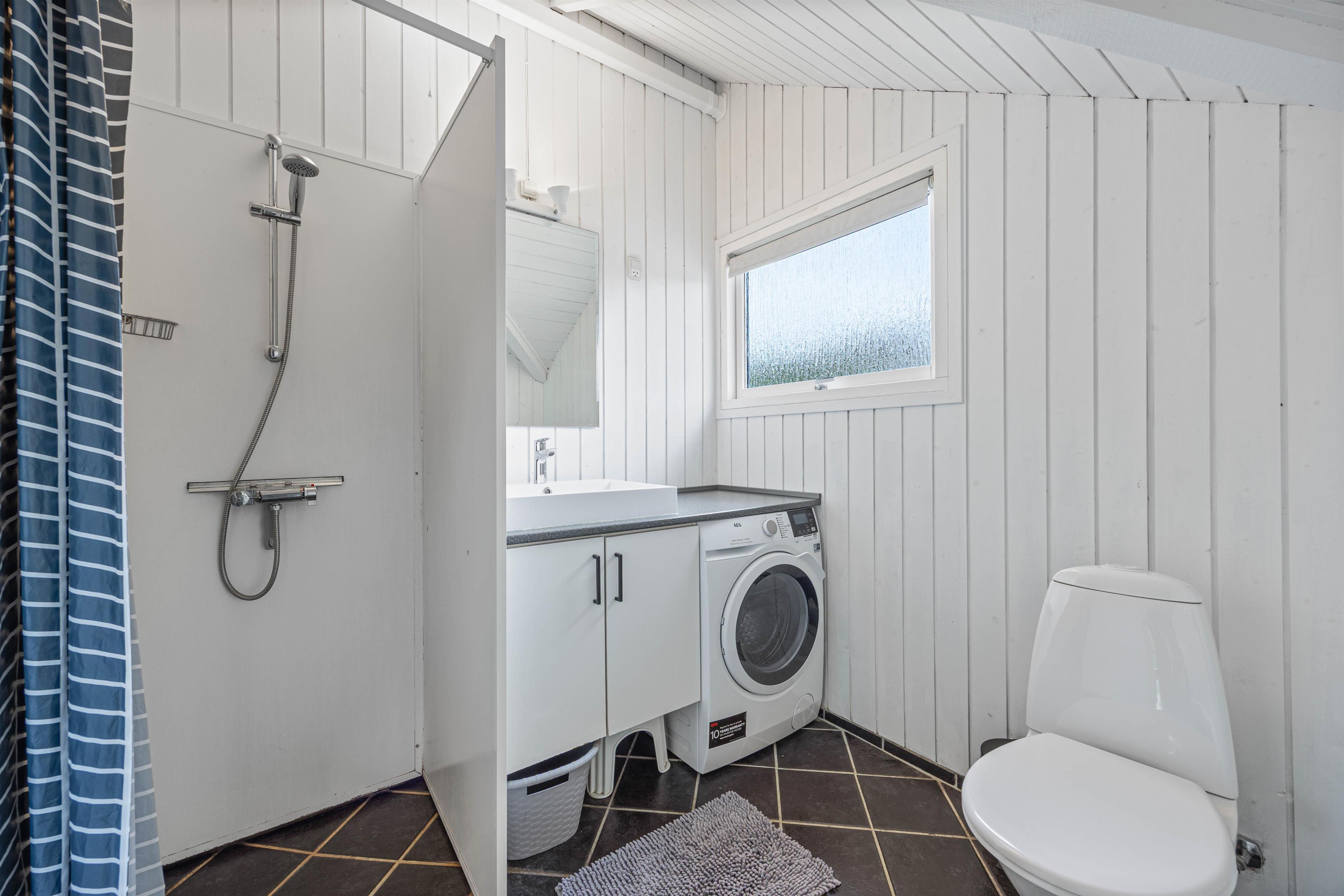 Med udgang fra stuen ligger den sydvendte træterrasse, der er delvist overdækket. Her kan I nyde solen hele dagen, mens børnene leger omkring jer. Med stor aktivitet kommer der let top på vasketøjskurven – her er der også hjælp at hente, da sommerhuset har både vaskemaskine og tørretumbler.