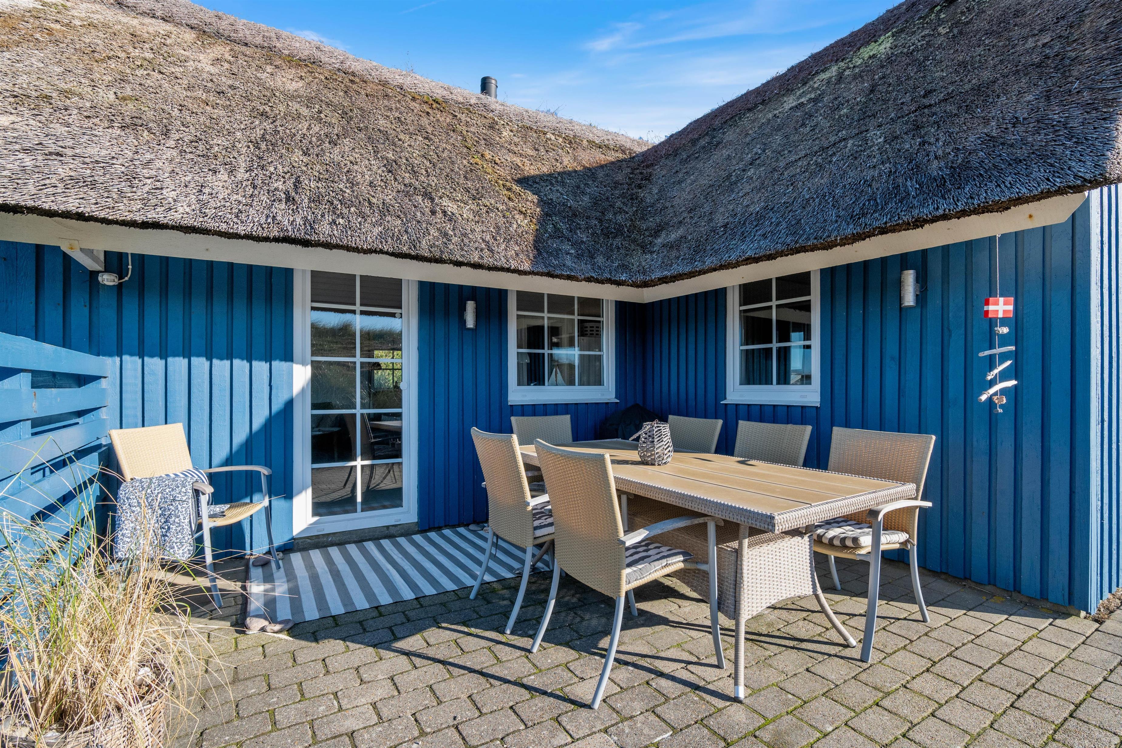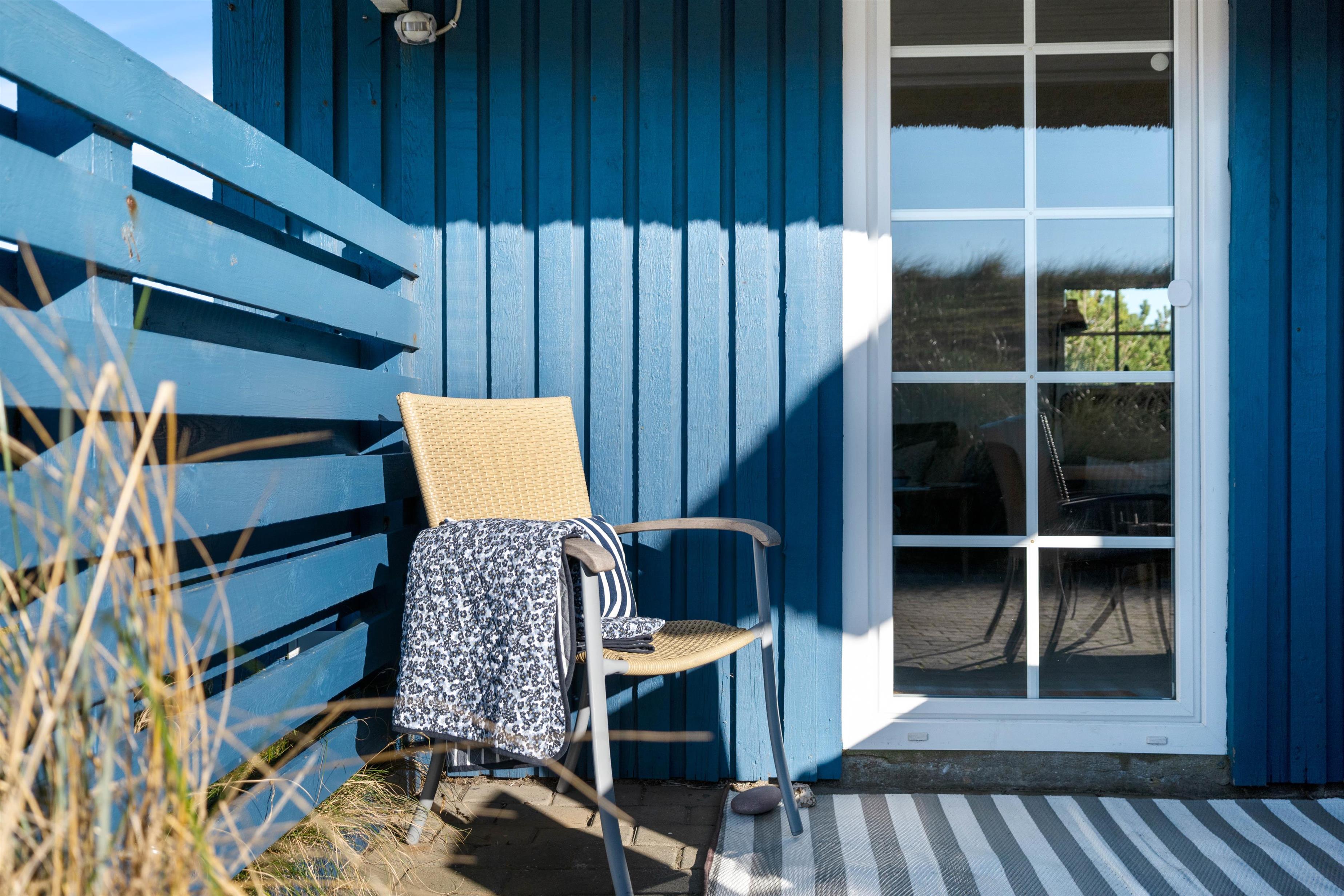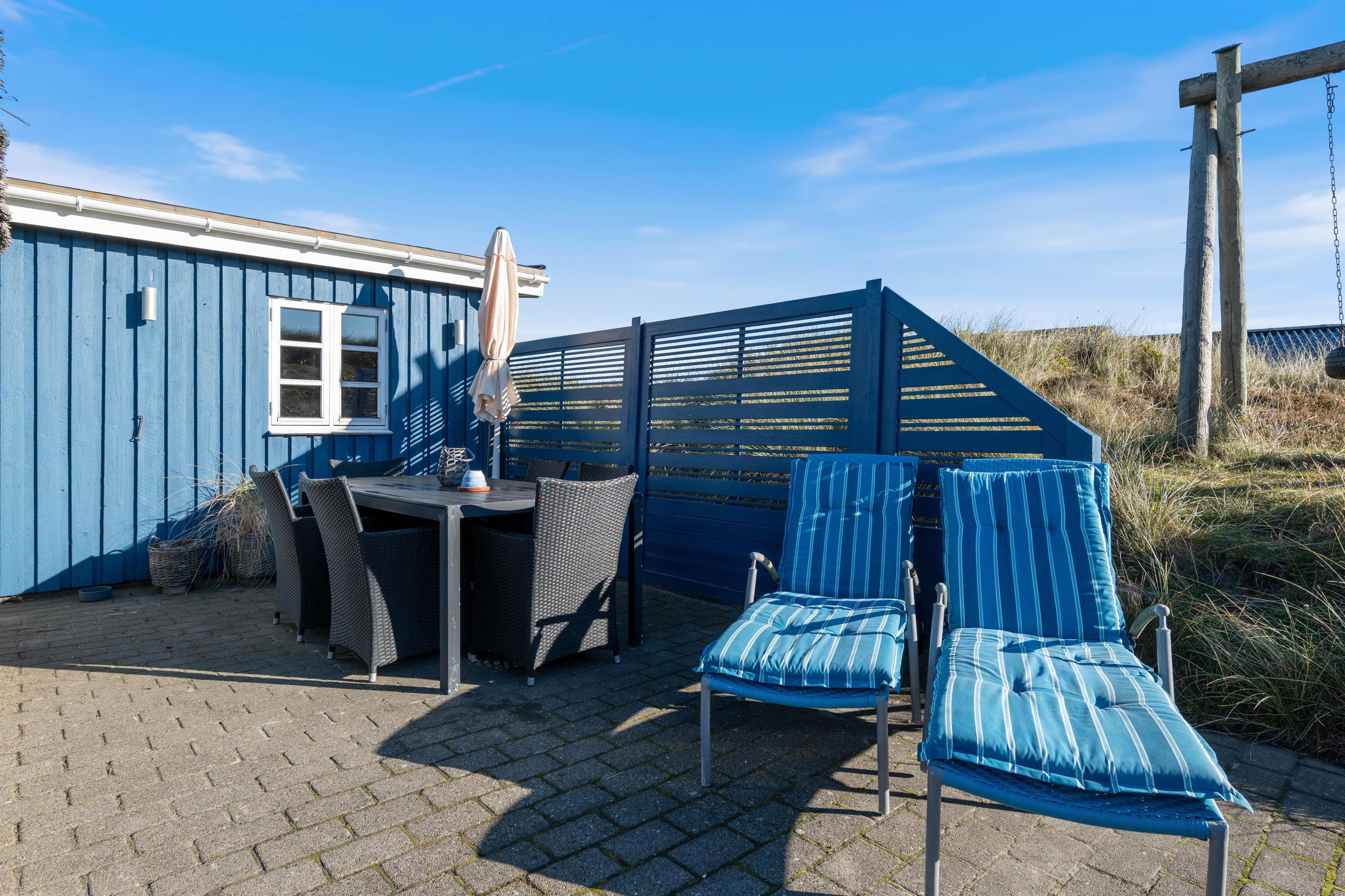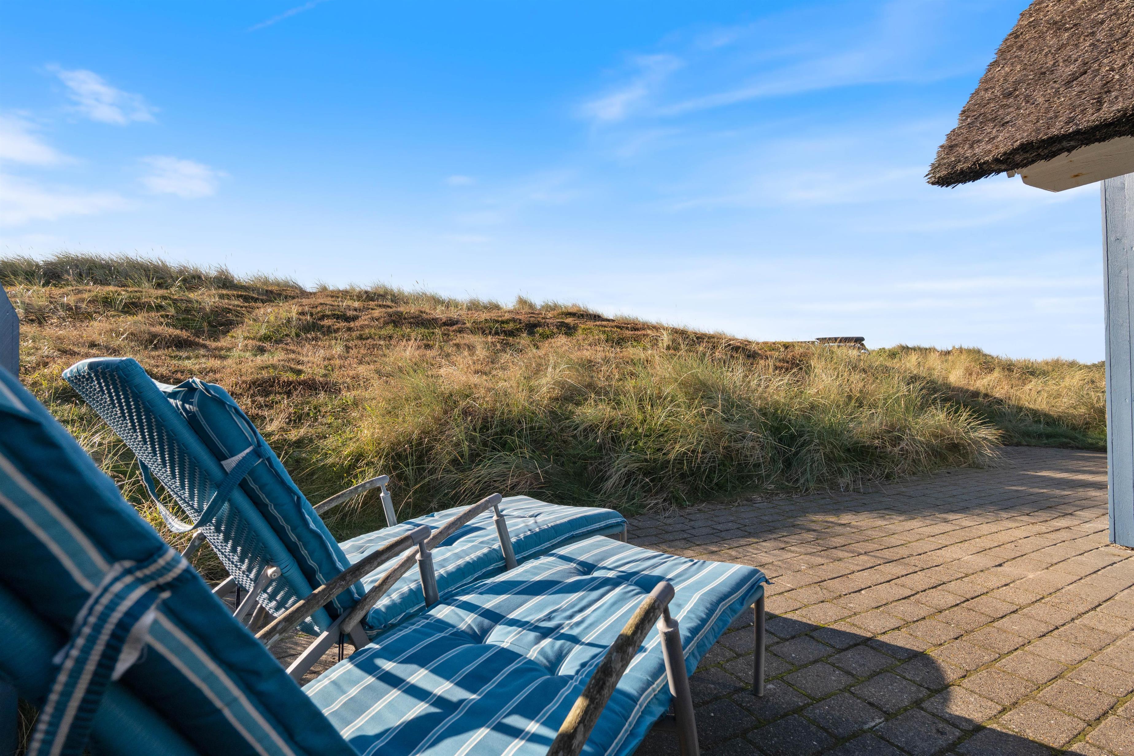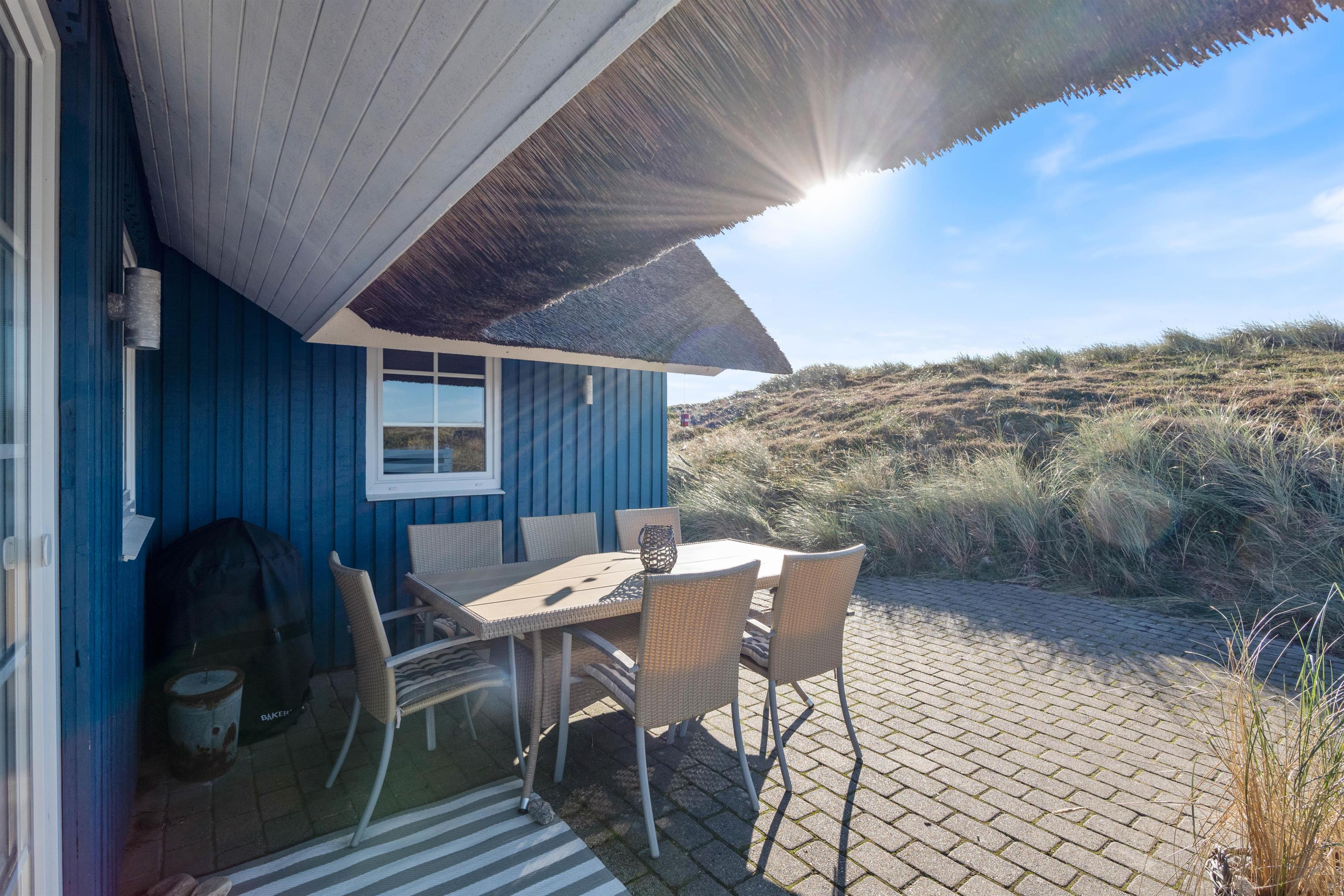 Nyd aftensolen og solnedgangen over klitterne fra terrassen, alt imens I nyder en veltilberedt grill-middag og et godt glas vin på terrassen. Her er masser af frisk luft, og hele tiden kan I høre havets brusen og dufte den salte havduft.