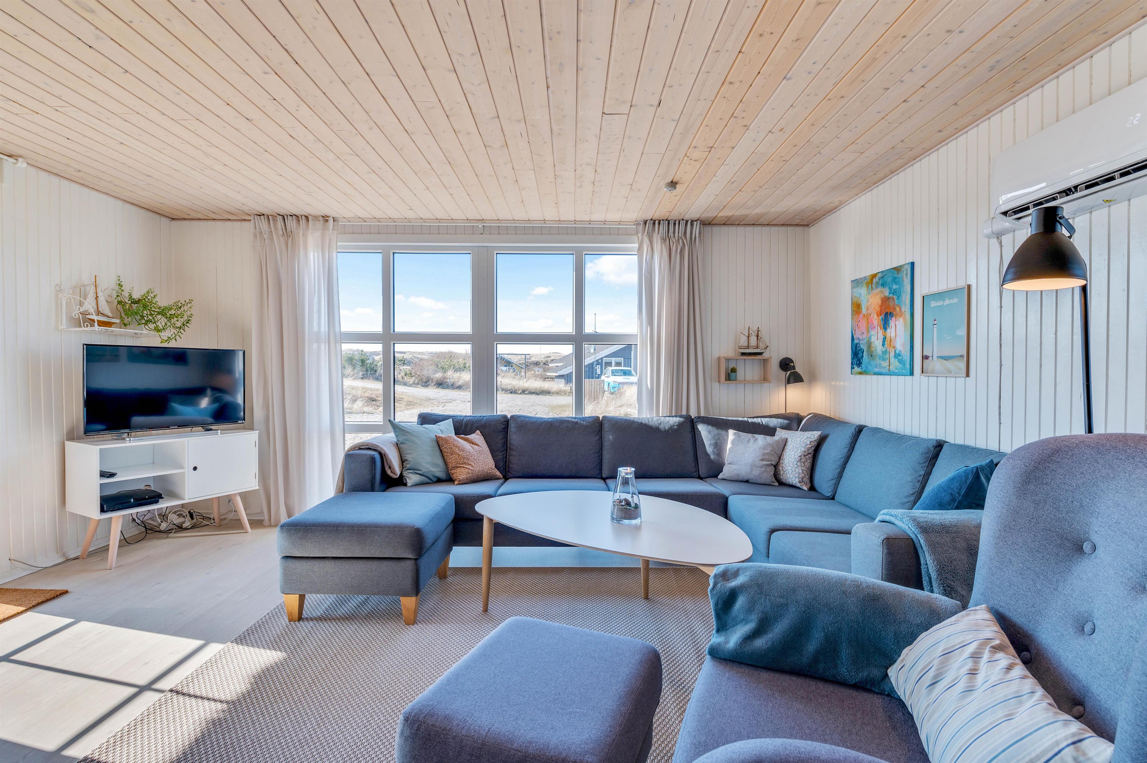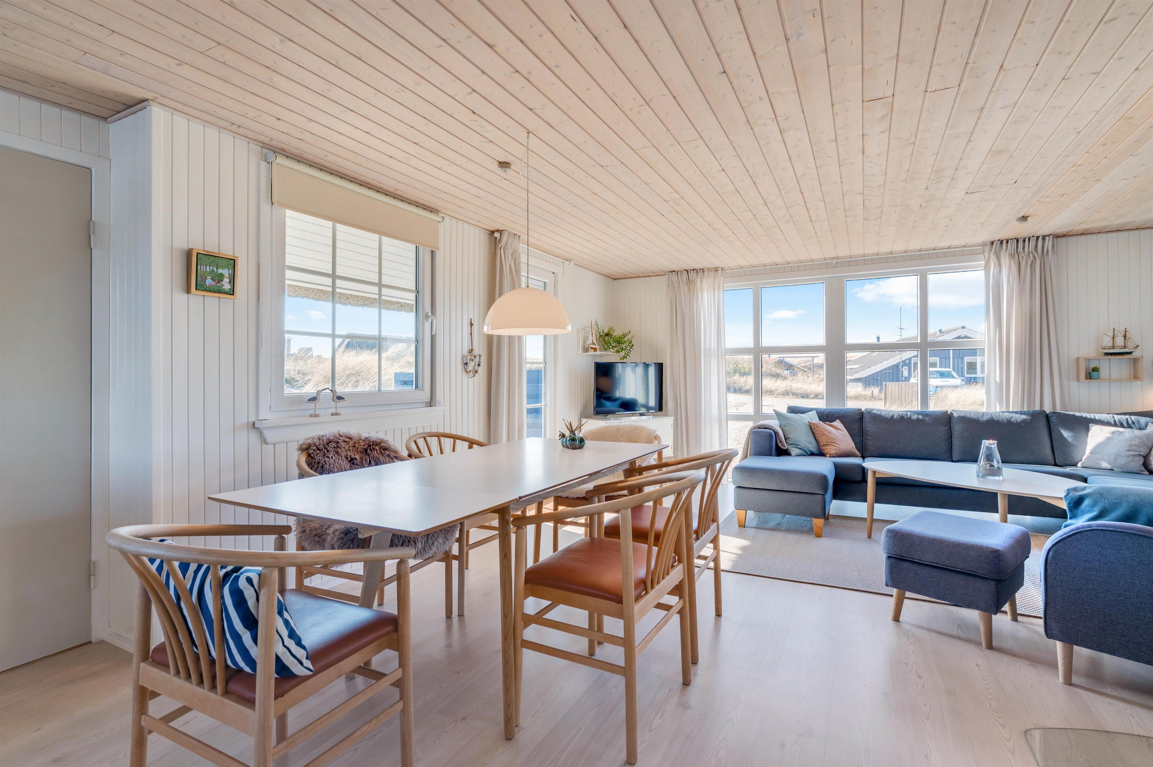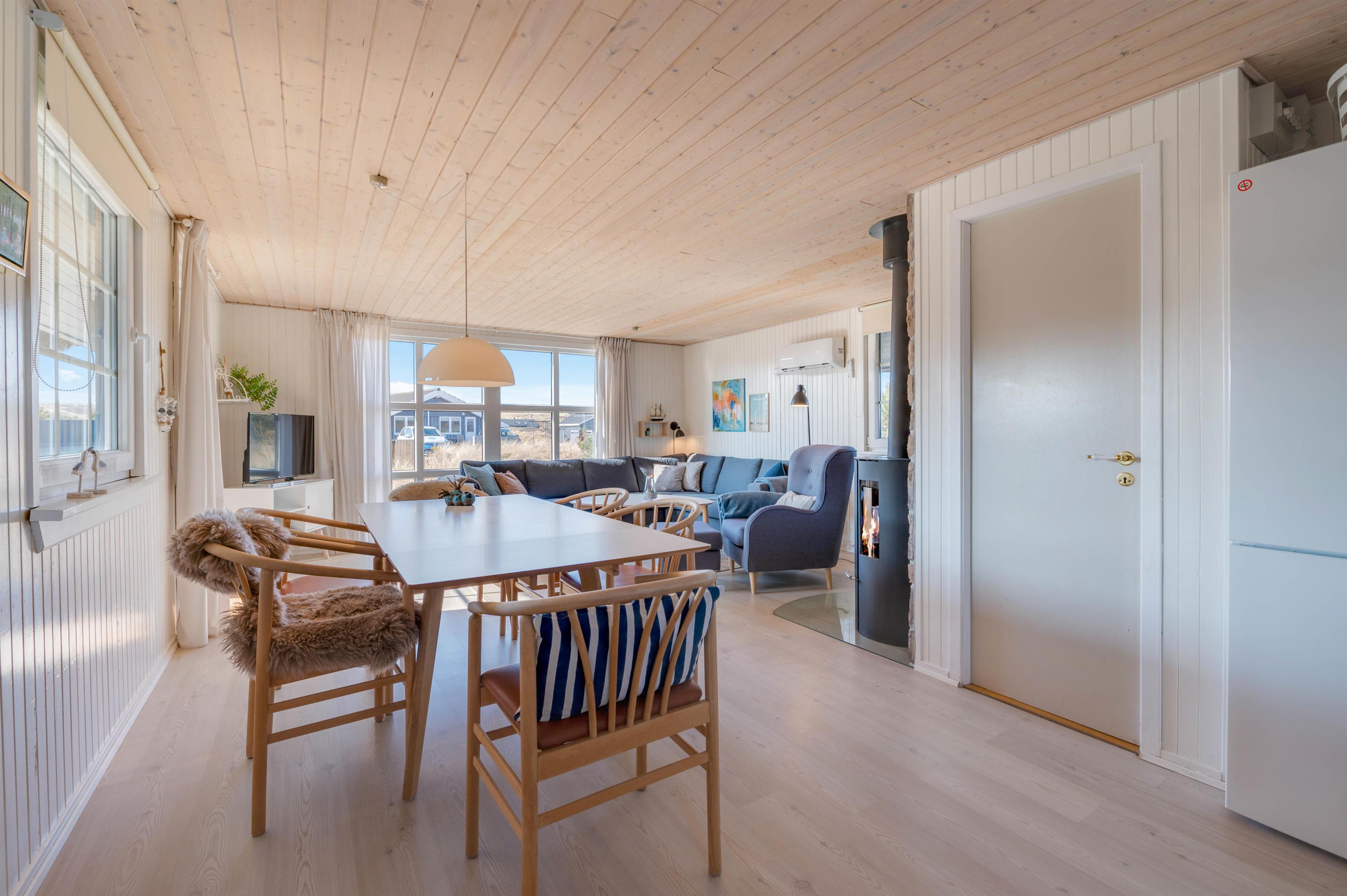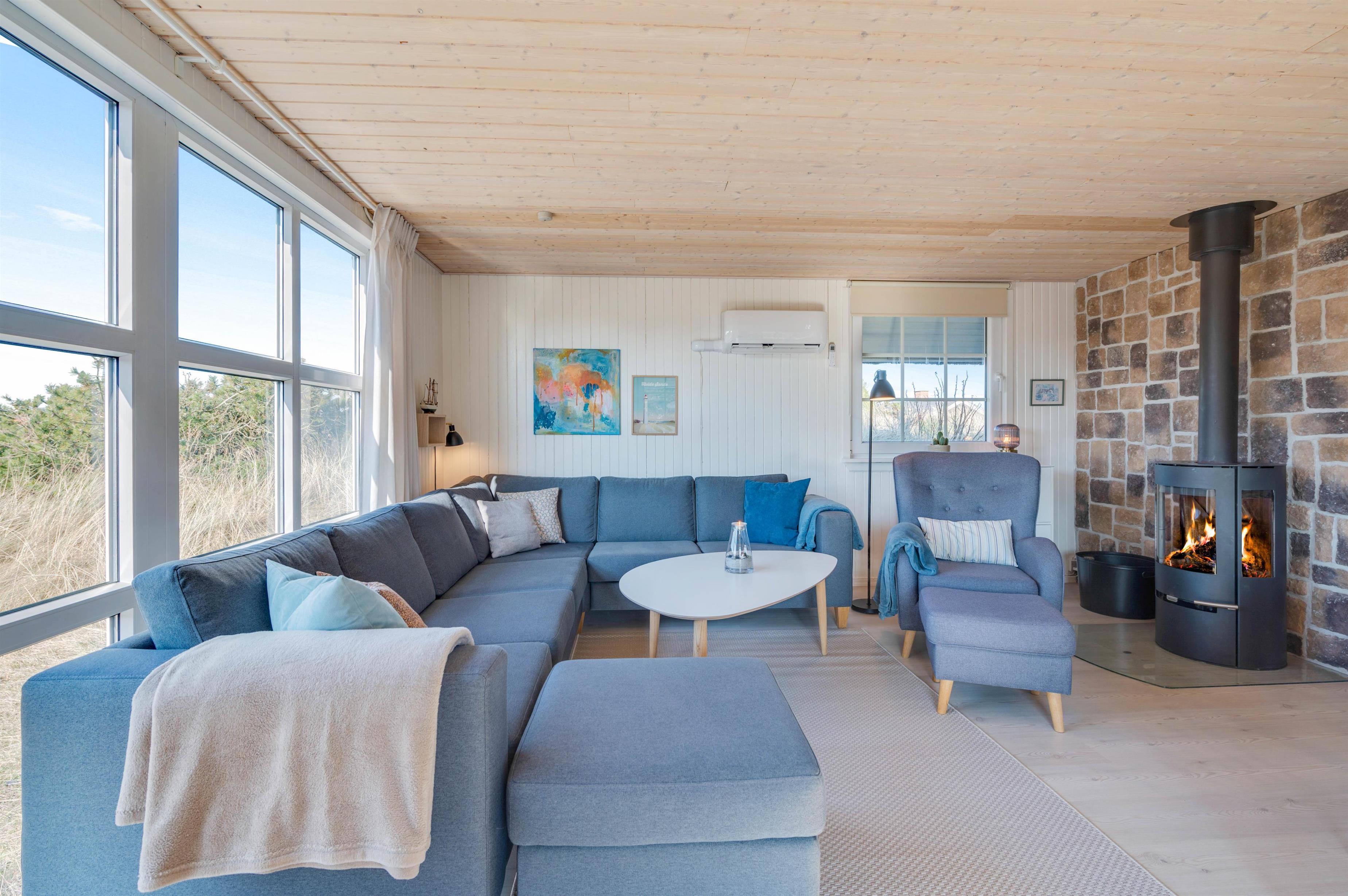 Stuen indbyder til dejligt afslappende samvær og en måske en afslappende stund med en god kop kaffe foran brændeovnen på de lidt koldere dage. Igennem de store vinduespartier har I en storslået udsigt udover det fascinerende klit-landskab. Her kan I også på de køligere dage nyde naturen.